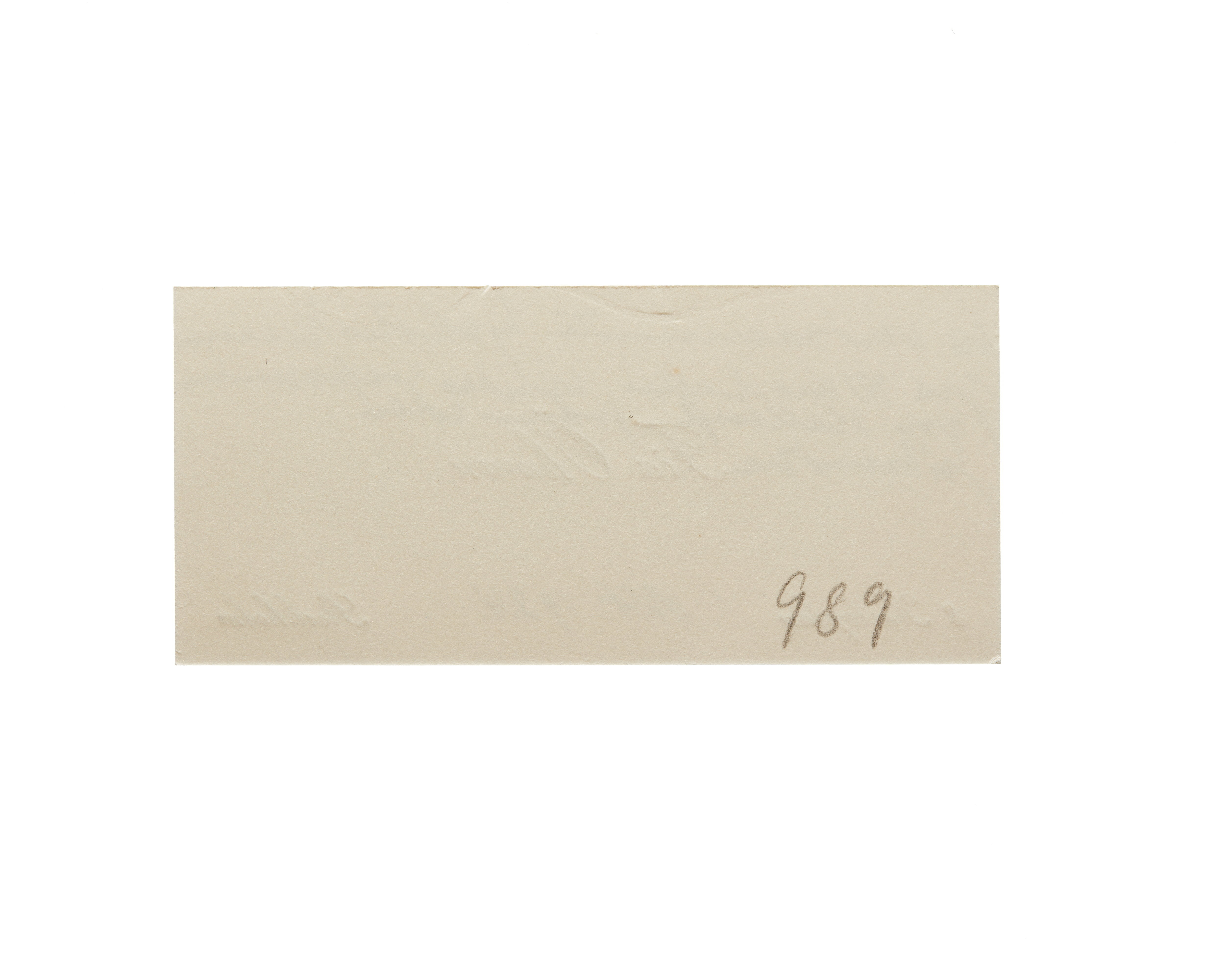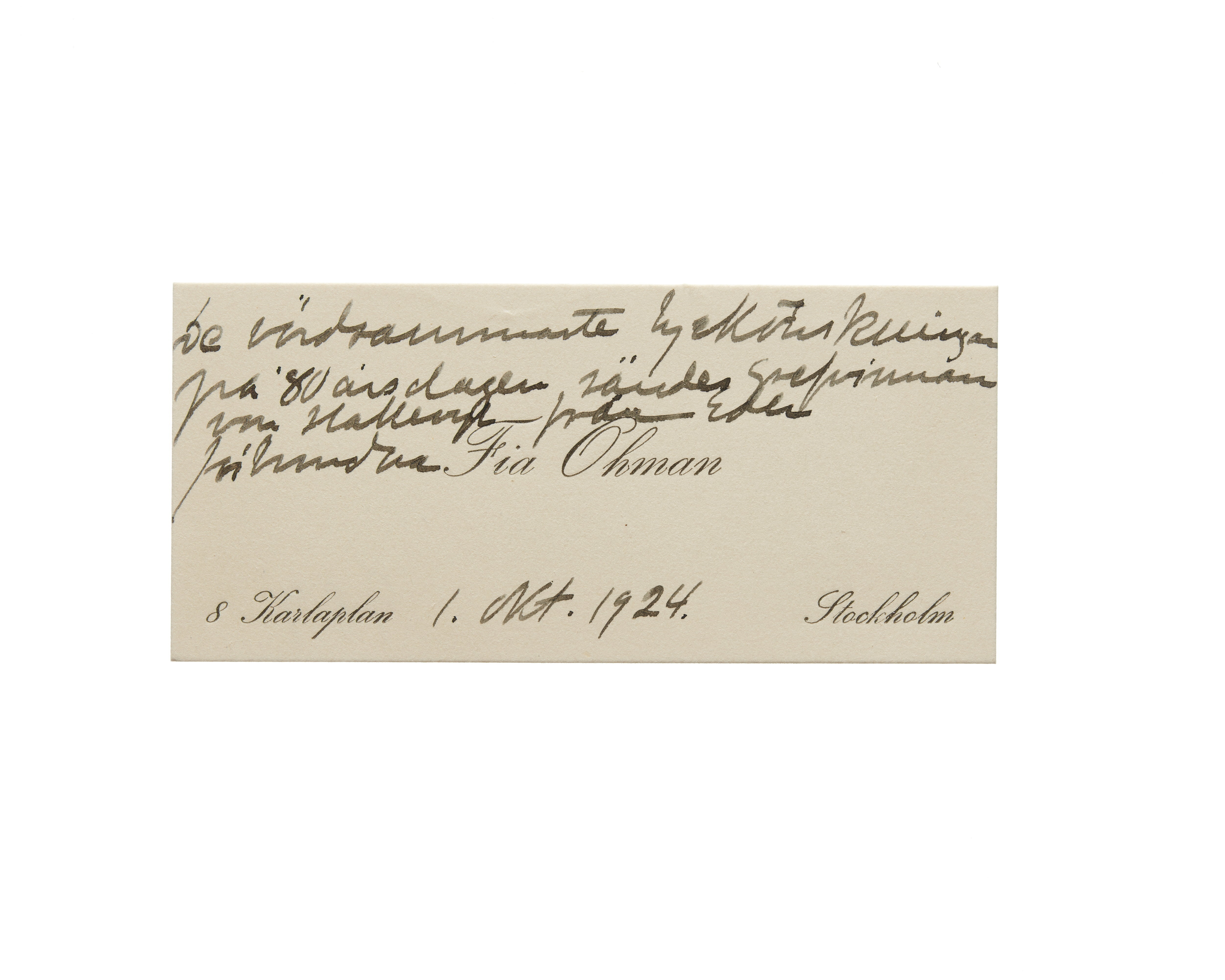 Ett visitkort från författarinnan Fia Öhman, daterat 1924. Adress (nedre vänstra hörnet) 8 Karlaplan, (nedre högra hörnet) Stockholm. Handskrift "....".