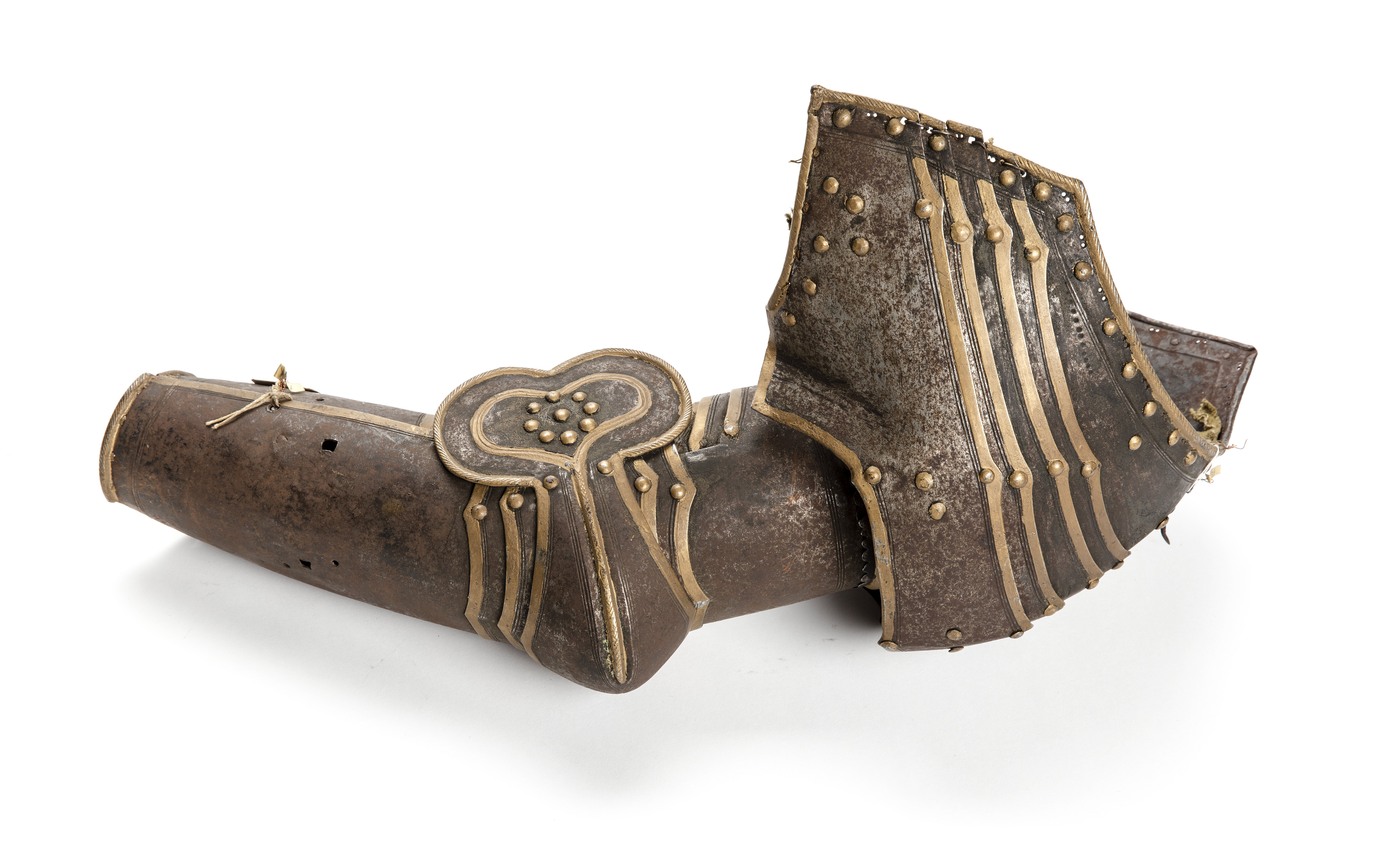 Av svärtad järnplåt med förgyllda kanter. Axelstycket med armskena bestående av 21 delar samt armbuckla med mussla. Rustningshandske, 8 delar, alla fingrar ledade - intakta utom långfingret som saknar yttersta leden.