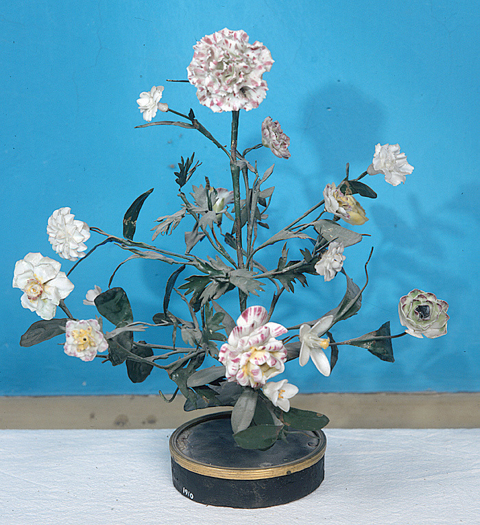 Bordsprydnad i form av blomsterkvistar av järntråd och bladverk med femton st polykroma blommor av porslin.