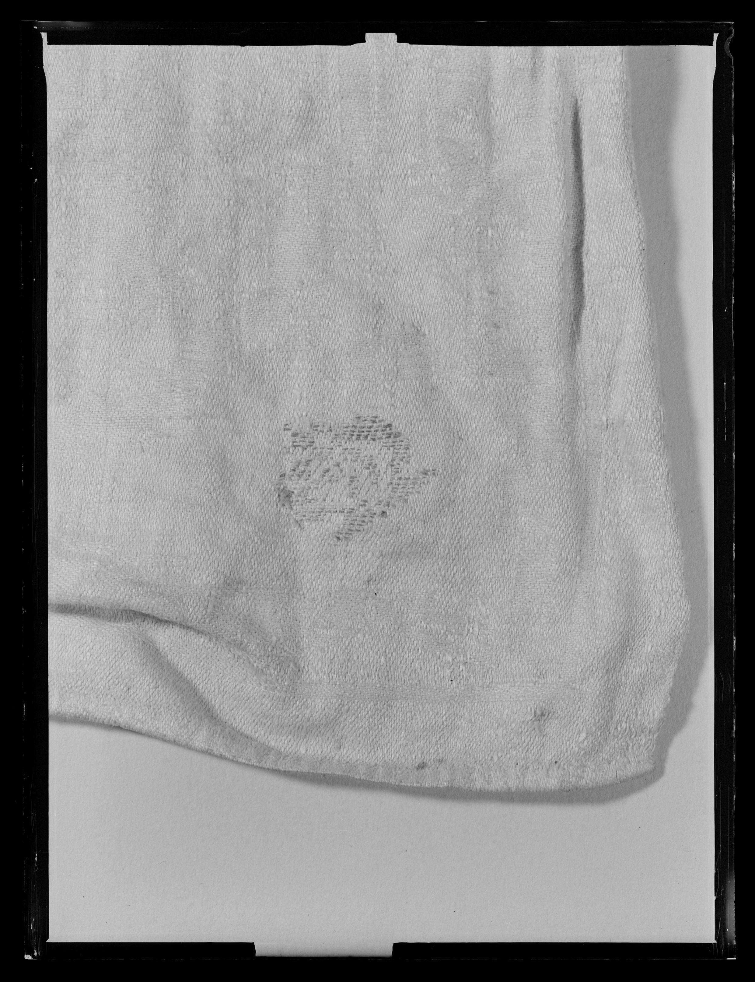 Använd att lägga om Gustav III:s sår efter attentatet på operan den 16 mars 1792. Damastvävd duk eller servett med mycket små fållar på två sidor och stad i långsidorna. Invävd blå krona i ena hörnet. På duken finns 16 st större, idag nästan svarta, blodfläckar. Fläckarna visar tydligt hur servetten varit vikt då den använts som kompress för att stoppa blodflödet efter attentatet. I samband med att Gustav III blev skjuten så lades en tillfällig kompress på skottskadan. I Livrustkammaren finns fyra linne"dukar" bevarade från detta tillfälle. Det var servetter mm som fanns till hands.