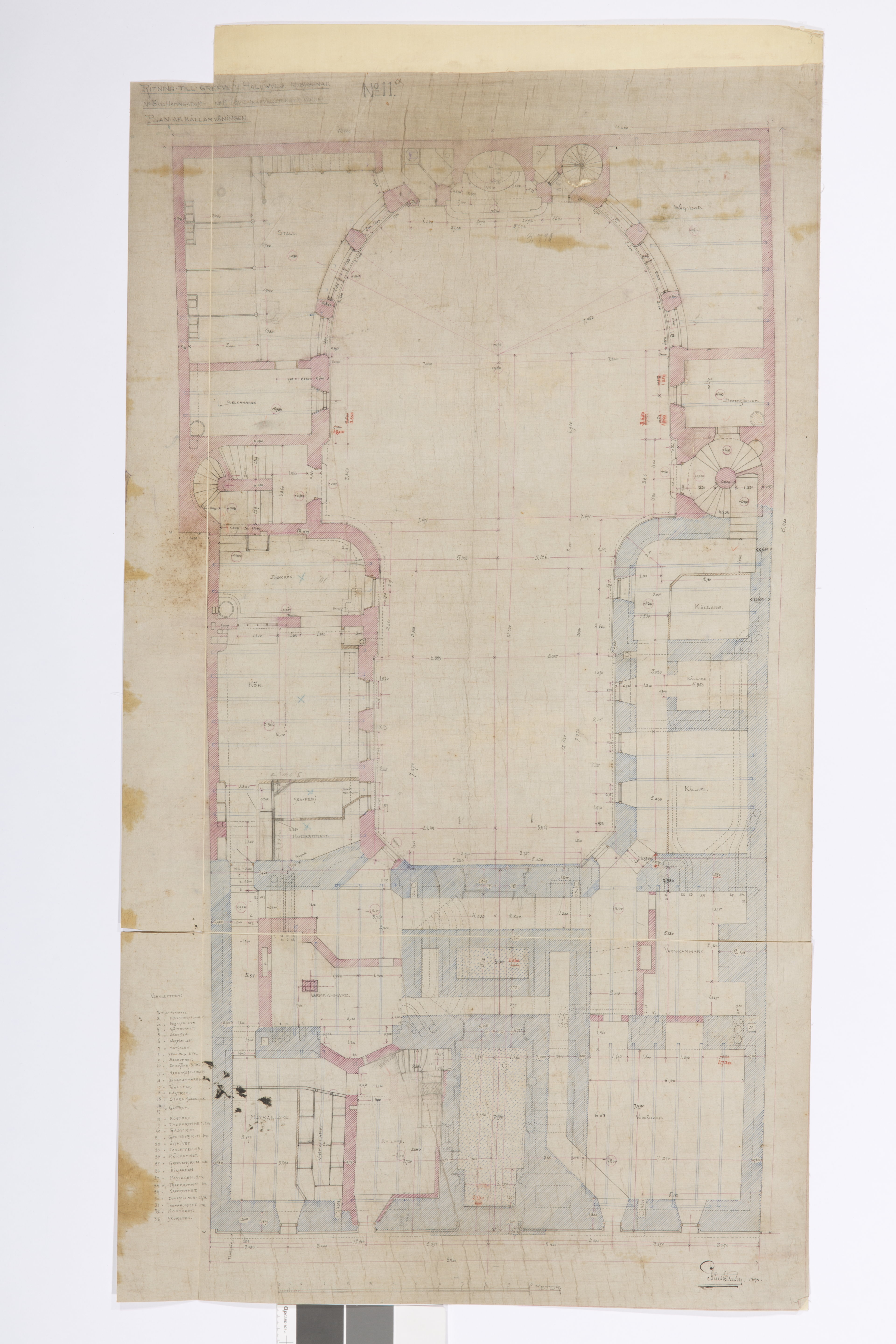 Plan av källarvåningen Tusch, rött och blått på väv