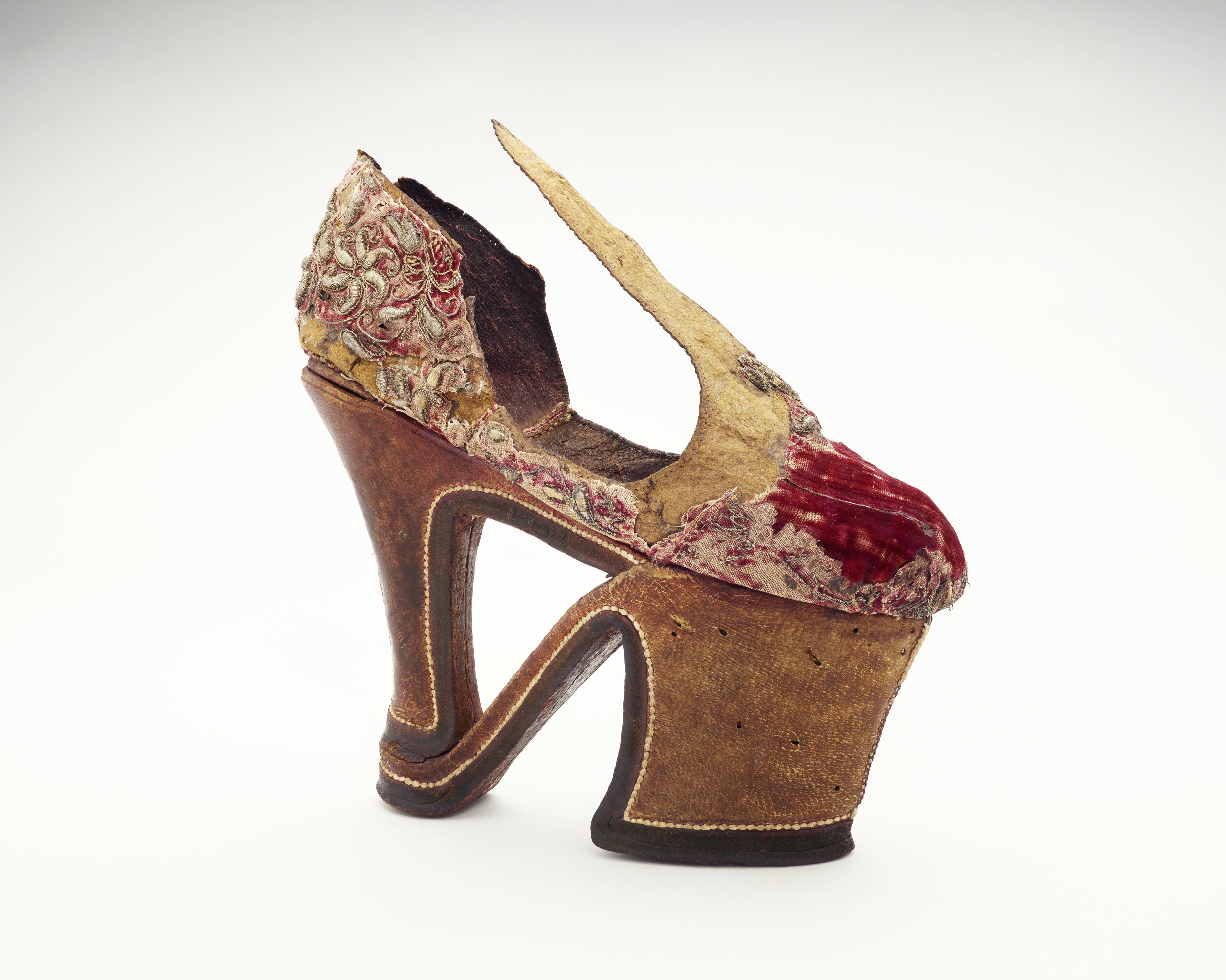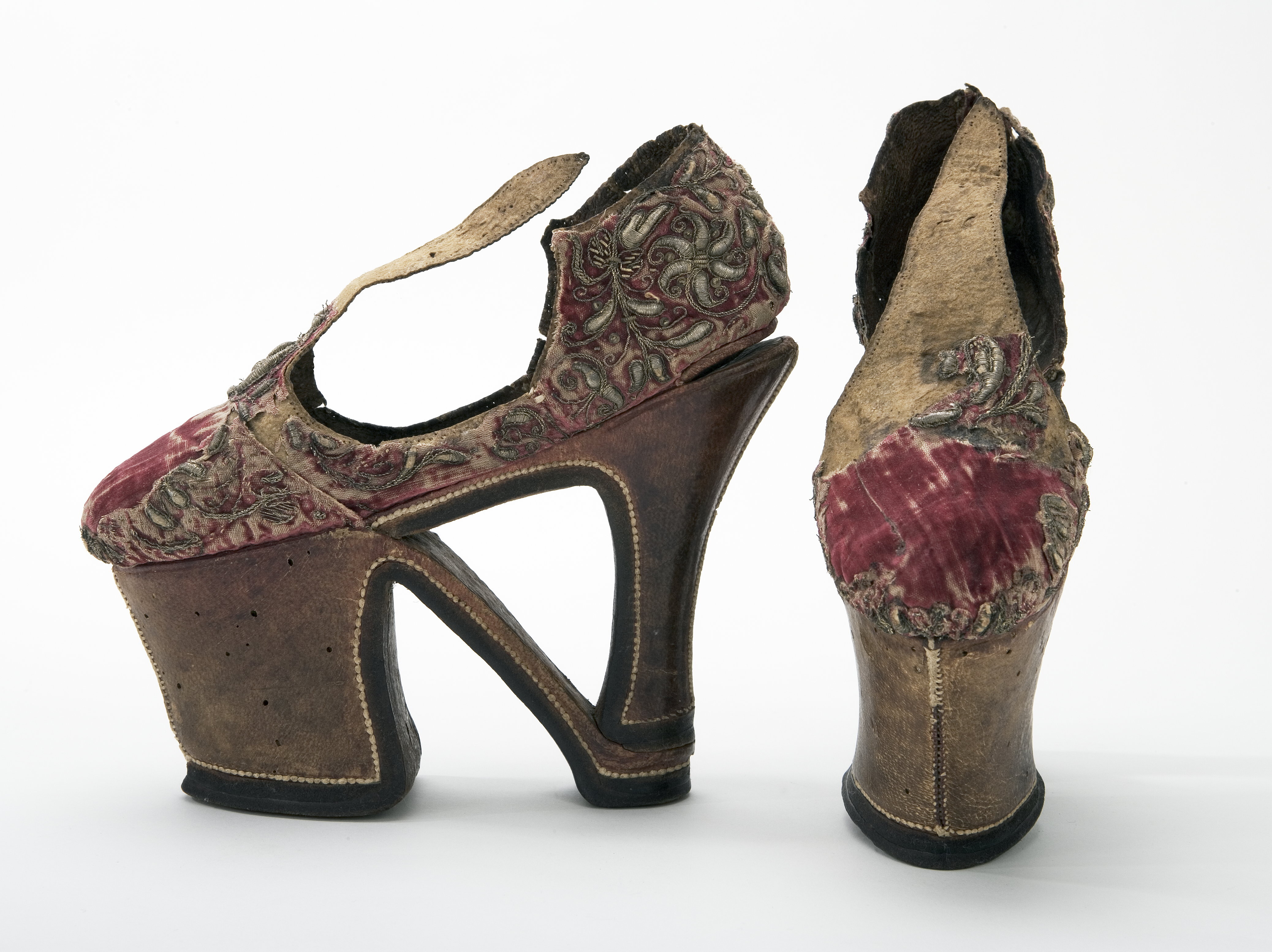 Två skor, styltskor/chopiner, klädda med röd silkessammet med guldbroderier i relief. Höge klackar fram och bak (140 mm höga) med stag. Broderier i relief på bakkappan, på de djupt ringade sidopartierna längs sulan vid tåpartiet samt en bit upp mot den långa smala plösen. Kraftig sula. Styltskor av röd sammet med svagt rundad tå och hög något insvängd klack. En ställning fastsatt under skons tåparti samt under skons klack. Skon skuren i ovanläder samt under finns en plös som avslutas i en spets. Bakkappan med en söm mitt bak förenas med plösen i sidsömmar. Hälpartiet ej fastsatt för bättre rörlighet. Skon är fodrad med mörkbrunt nötläder samt sula av naturfärgat skinn? med köttsidan utåt. Skon är dekorerad med yttäckande vegetativt silverbroderi, delvis förgyllt, i låg relief samt paljetter. Klacken av trä är klädd med rödbrunt läder har en dekorativ söm mitt bak. En mörkbrun 8 mm tjock lädersula är randsydd. Ställningen klädd med brunt läder och med en söm mitt fram med dekorsöm. Yttersulan, 10 mm, tjock av mörkbrunt läder är randsydd. Ett pinnhål finns under klacken samt 2 i tåpartiet. Enligt 1845 år inv. “Cyriska skor”. Enligt kataloglapp venetianska skor från början av 1600-talet. Uppgifter från katalogisering inför utlån till Livrustkammaren, Stockholm 2007 Inv.nr. 11965:1-2. Styltskor, början av 1600-talet. L 215 mm. Total Klackhöjd 140 mm Klackhöjd bak 120 mm Klackhöjd fram 75 mm B sula 85 mm Vikt 247 gram :1 Vikt 258 gram :2