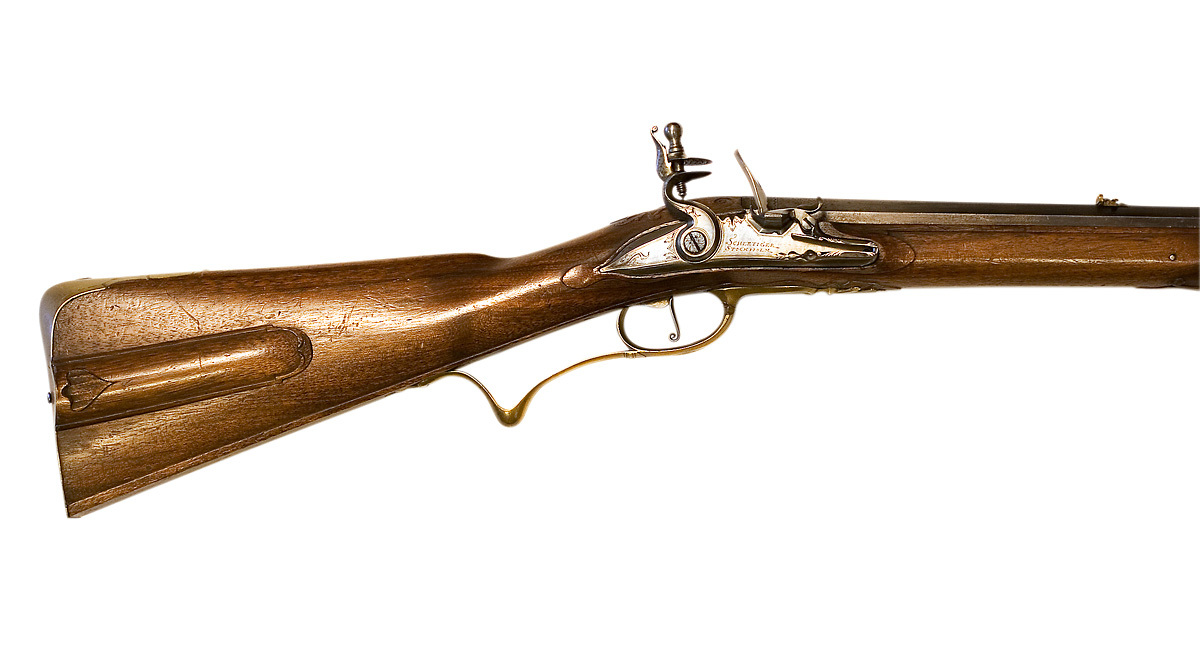 Åttsidig, blånerad, räfflad pipa, nio räfflor. Vid pipbasen punsade sicksackbårder. Kort, baktill tvärt avskuret, oblånerat svansskruvblad. Mässingsfodrat fänghål. Riktmedel: Inlaxade riktmedel av mässing, klaffsikte med en uppfällbar klaff, stolpkorn. Fästning: Tre häften, pipan fäst med krysskruv samt tre pipstift av stål. Flintlås med plant låsbleck, brett fasade, något rundade kanter med graverade kantlinjer, på mittfältet graverade kantlinjer samt på bakspetsen bladrankor, framför hanen graverad signatur: "SCHERTIGER // STOCKHOLM". S-formig, platt hane med fasade kanter, dubbla kantlinjer samt bladdekor, nötskruv med platt huvud, blomdekor. Runda käkar, nertill åsad hangren, käkskruv med kulformigt huvud. Kantig fängpanna med fals. Batteri med svängd, åsad häl. Batterifjäder med delvis fasade kanter, bladde- kor, betformigt fjäderlöv. Nöt med yttre springkil. Fästning: Två låsskruvar. Avtryckare med upprullad ände, konturerat avtryckarbleck. Helstock av valnöt, kolv med plan undersida, kindstöd med rak, profilerad nederkant och kolvlåda med välvt lock med kantlist. Enkel, snidad band- och rankdekor vid kindstöd och vid svansskruvblad, vid spetsrörkan en fransk lilja. Näsband av horn, övriga beslag av mässing. Bakplåt med brett fasade kanter över hälen, konturerad flik på kolvryggen, graverade dubbla kantlinjer samt s-formigt svängd bladranka på fliken, mitt på bakplåten graverat: 1. Plant M-liknande sidbleck med fasade kanter, i båda ändarna ändblad, det bakre spetsigt. En + en kantig rörka, slät spets. Varbygel med plan bygel med fasade kanter, graverade kantlinjer och mittblomma, pungformigt nedsvängd bakre arm, plan främre arm med på mitten insvängda, fasade kanter, avslutning i form av vas med treflikigt blad, liknande blad på bakre armen. Tillbehör: Laddstock av trä, 1: 767 mm, framtill skodd med horn, 1: 25 mm, i bakänden ett invändigt gängat stålrör, 1: 163 mm.