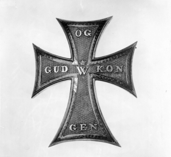 Utböjt, latinskt kors av silver, graverad geometrisk dekor av sexhörningar med sexuddig stjärna i mitten. Kantbård av förgyllt silver och röd, genomsynlig emalj. På korsmitten lagt ett W av guld, krönt av öppen krona av guld, på korsarmarna guldtext: "GUD OG KONGEN". På baksidan säkerhetsnål och stämpel: "P.HERTZ". Graverad text: "Adam Oehlenschläger // till // Bernh.v. Beskow // 18 29.7 47". På h korsarm dessutom med tusch: 4166.