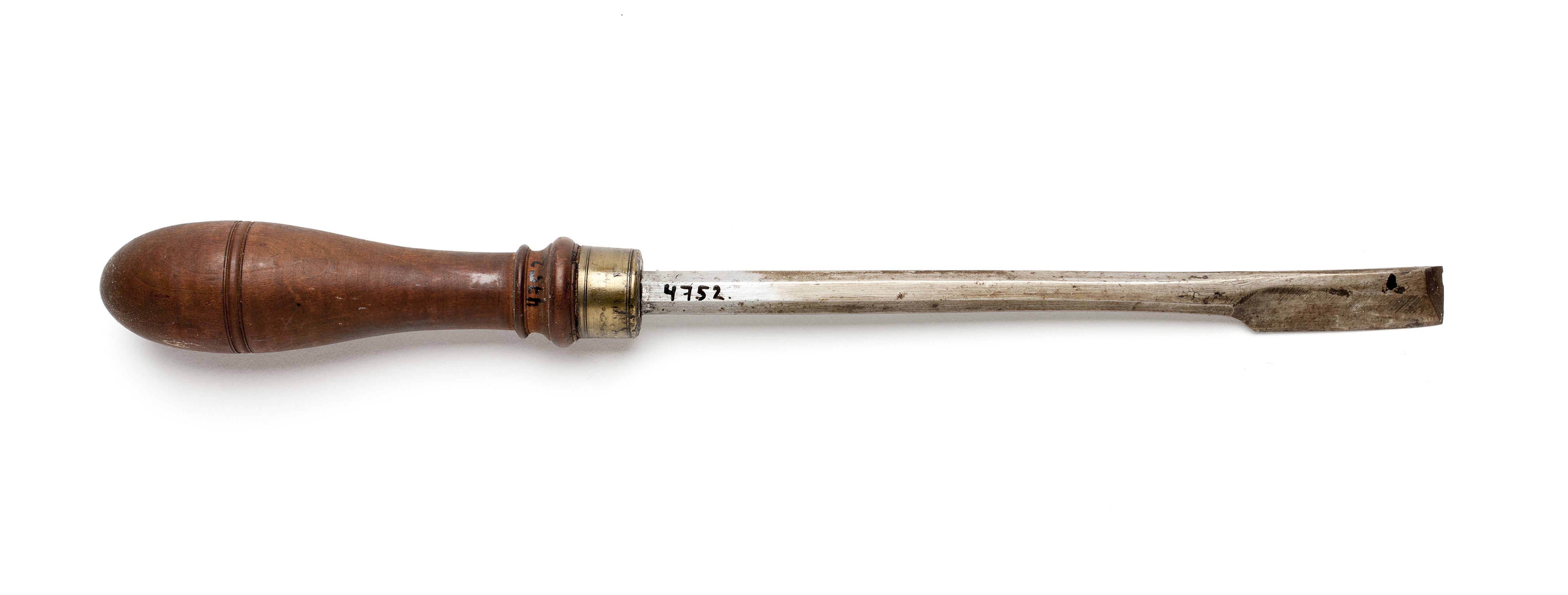 Klinga med åttsidig, i änden trapetsoidisk genomskärning. Rak främre egg och sidoegg. Svarvat skaft av päronträ med två vulster nedtill ("skoklostertyp"). Mässingsring. Stämpel i skaftets ände vid fästet: "1".