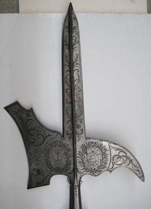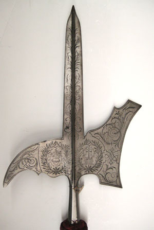 Bred stötklinga med mötande skär, tydlig rygg och snabbt avsmalnande spets. Asymetriskt yxblad med konkav egg. Övre kanten konturerad, den nedre med rundad urtagning. Nedåtsvängd hake med bred bas och konturerad undre kant. Heltäckande etsad dekor, lika utförd på bägge sidor. På klingan stiliserade blad. På yxa och hake fält med kantlinjer och arabeskliknande mönster. I mitten två lagerkransar, den första omgärdar ett altare med kors och texten INRI och den andra ett hjärta med törnekvist och ett kors. Alla detaljer innanför lagerkransarna har rester av förgyllning. Hals övergående i holk, konisk med åttsidigt tvärsnitt, L 114 mm. På ena sidans övre del fyra punkter i rad, minskande i storlek nedåt. Påsmidda skenor, L 460 mm, fästade med tre mässingsskodda nitar. Stång av finådrigt trä betsat mörkbrunt. Cirkulärt tvärsnitt, diam 36 mm. Doppsko av stål, konisk med spetsig ände. Två ringar och synlig vällsöm med gulmetallod.