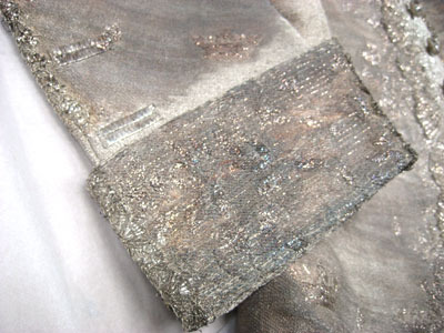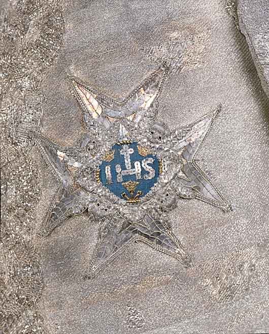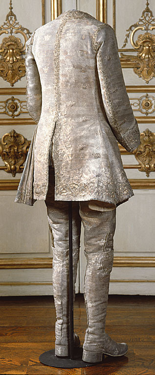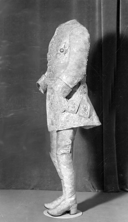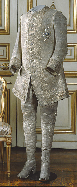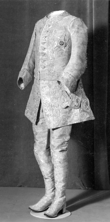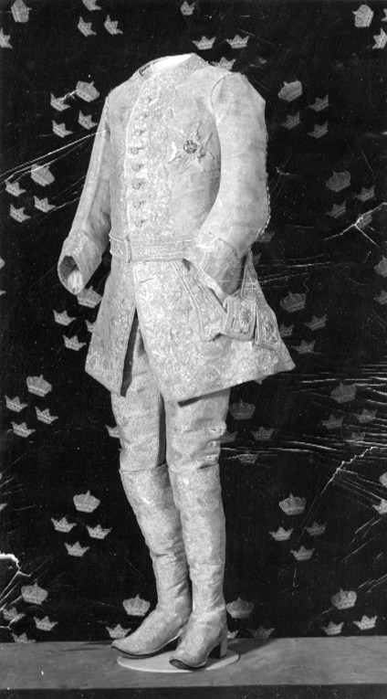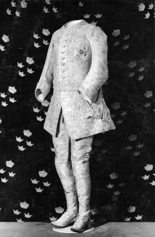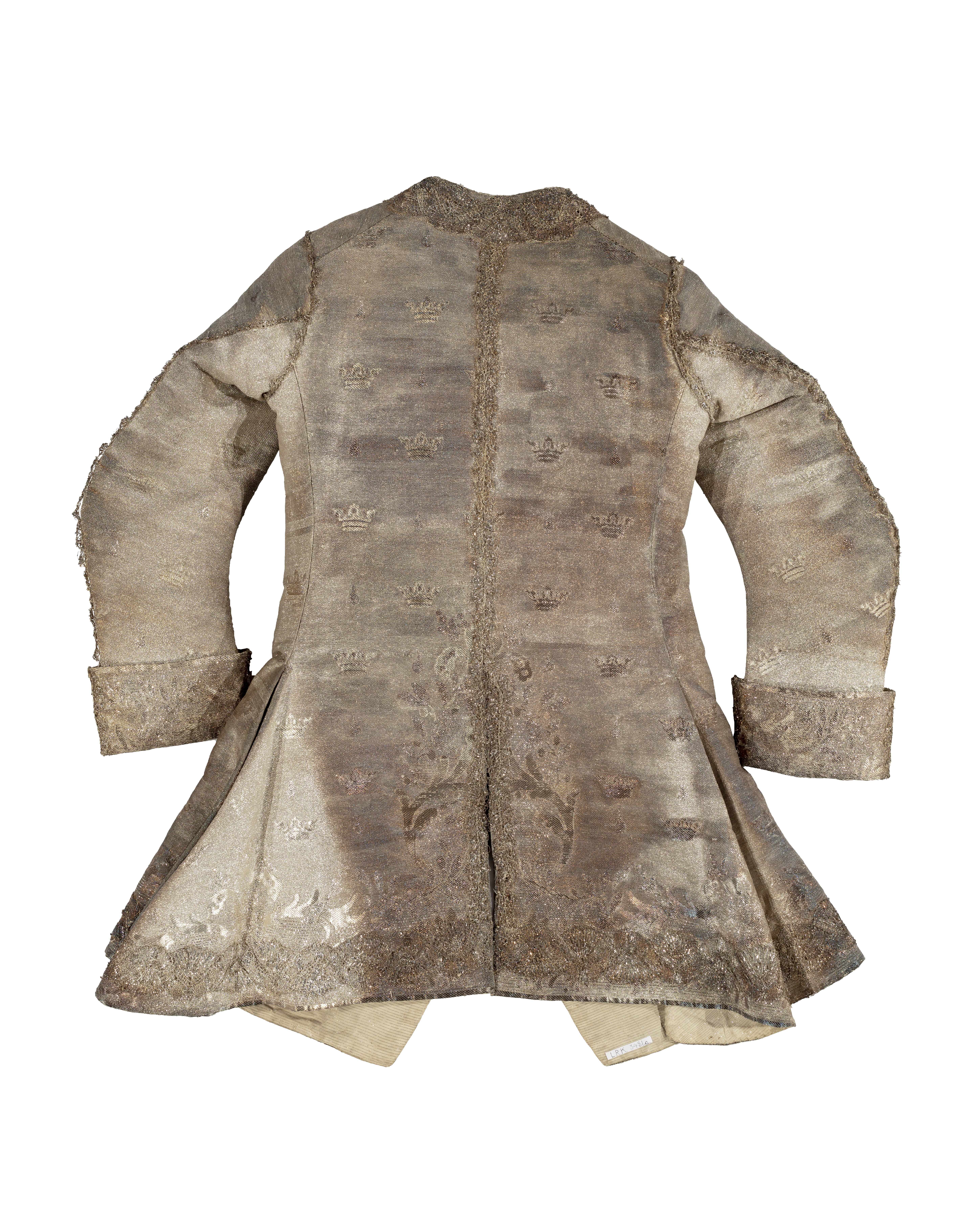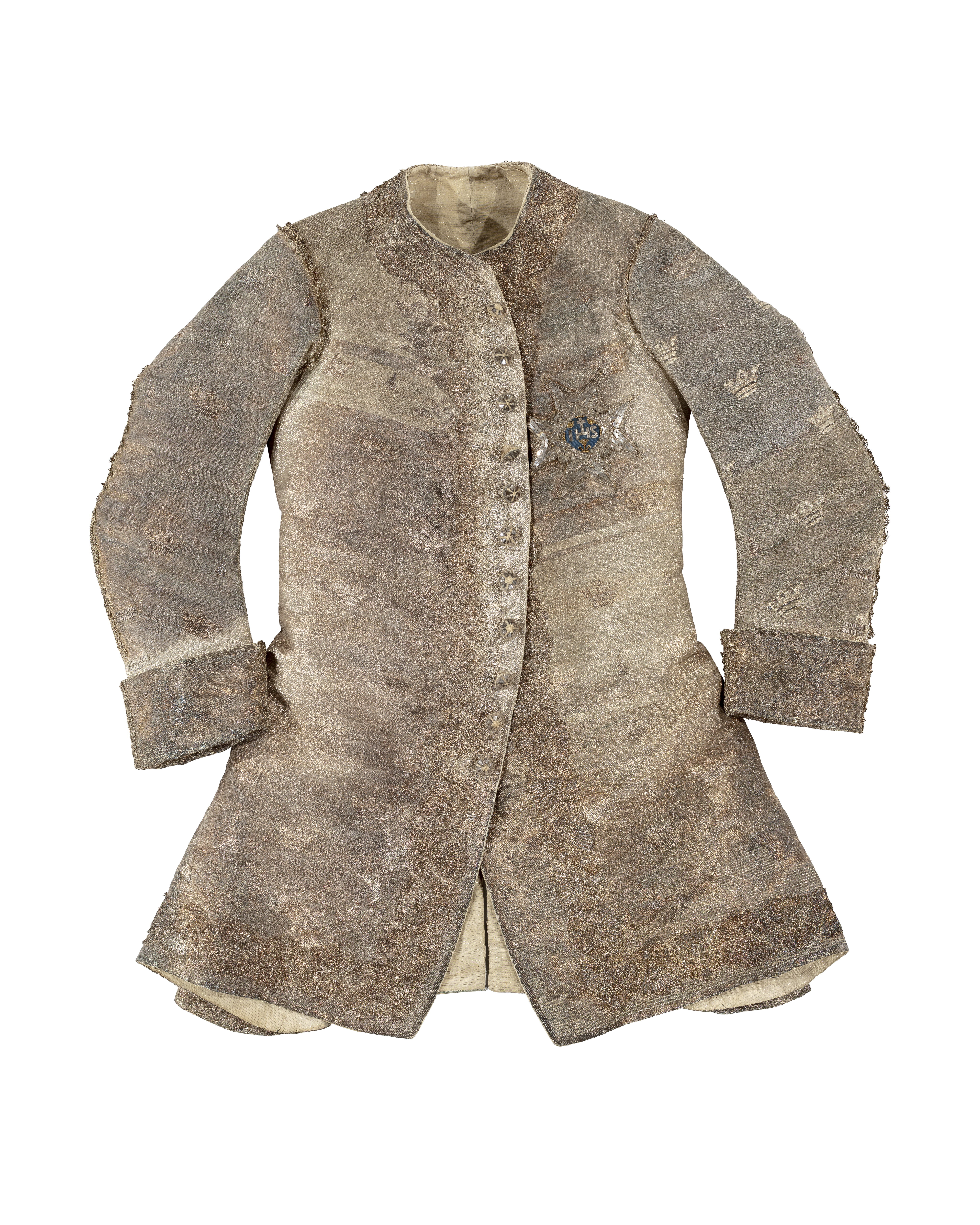 Kröningsrock av silvertyg med invävda, strödda, öppna silverkronor samt droppformade flammor. Formsydd med välvda framstycken och utdragna skört nedtill. Knäppning fram med elva kullriga knappar med träkärna, klädda med snörmakeridekor av silvertråd på silverbleck. Knapparnas diameter: 23 mm. Knapparna placerade på högra framstycket. Knapphålen på motsvarande sida är tränsade med silverlan eller bleck. Långa, formsydda ärmar med två dekorknapphål i ytterkantens nedre fåll. Fastsydda, uppvikta ärmslag nedtill dekorerade med växtslingor av silvertråd och silverlan, bredd: 90 mm. Rocken är kantad runt halslinningen, längs framkanterna samt längs nederkanten fram med en gallerbård av silvertråd och silverlan, bredd: 60 mm. Axelsömmarna och ärmarnas yttersömmar är dekorerade med en smal gallerbård av silvertråd och silverlan, bredd: 10 mm. Mittsömmen bak har samma sorts dekorband i bredd: 25 mm. Sprund mitt bak, längd: 340 mm. Två sprund i sidorna, nedtill ihopsydda 155 mm respektive 160 mm upp. Öppningarnas längd: 165 mm. Foder av vitt, randat siden med smala invävda silverränder, sk silverlamé. På vänstra framstycket är fästat en broderad Serafimerkraschan. Mönstret ritat av Jean Eric Rehn.