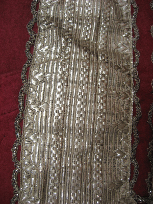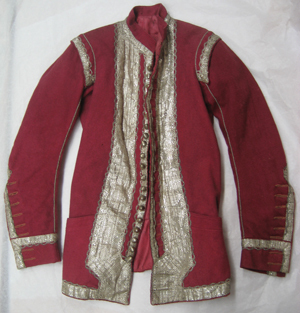 Jacka av cramoisiefärgat kläde garnerad med silvergaloner och med grova silversnoddar som tränsar över sömmarna. Jackan är sydd av två framstycken samt av ett bakstycke tillskuret av två delar. Från midjan bildas ett skört med skörtkappor av insydda veck. Knäppningen består av 20 spetsiga, försilvrade knappar fästade på en smal silvergalon. En bred silvergalon löper längs med framstyckenas ytterkanter. Galonerna kantas av en rundflikig kedja av silvertråd och silverlan. I vardera framstycke är iskuret en horisontell ficka, l. 158 mm, markerade med en kantslå. Jackan har en ståndkrage, h. 30 mm, nedtill kantad av en silvergalon. Ärmarna är långa sydda av två stycken. Vid ärmsluten förekommer ett högt sprund i yttersömmen, l. 210 mm. Sprundet har en knäppning bestående av åtta knappar av samma sort som föregående. Ärmsluten är uppvikta i breda slag, b. 75 mm. Över ärmhålssömmen sitter axelklaffar, b. 36 mm, garnerade med en silvergalon. Jackan är på insidan fodrad med röd linnelärft och med vit linnelärft i ärmarna.