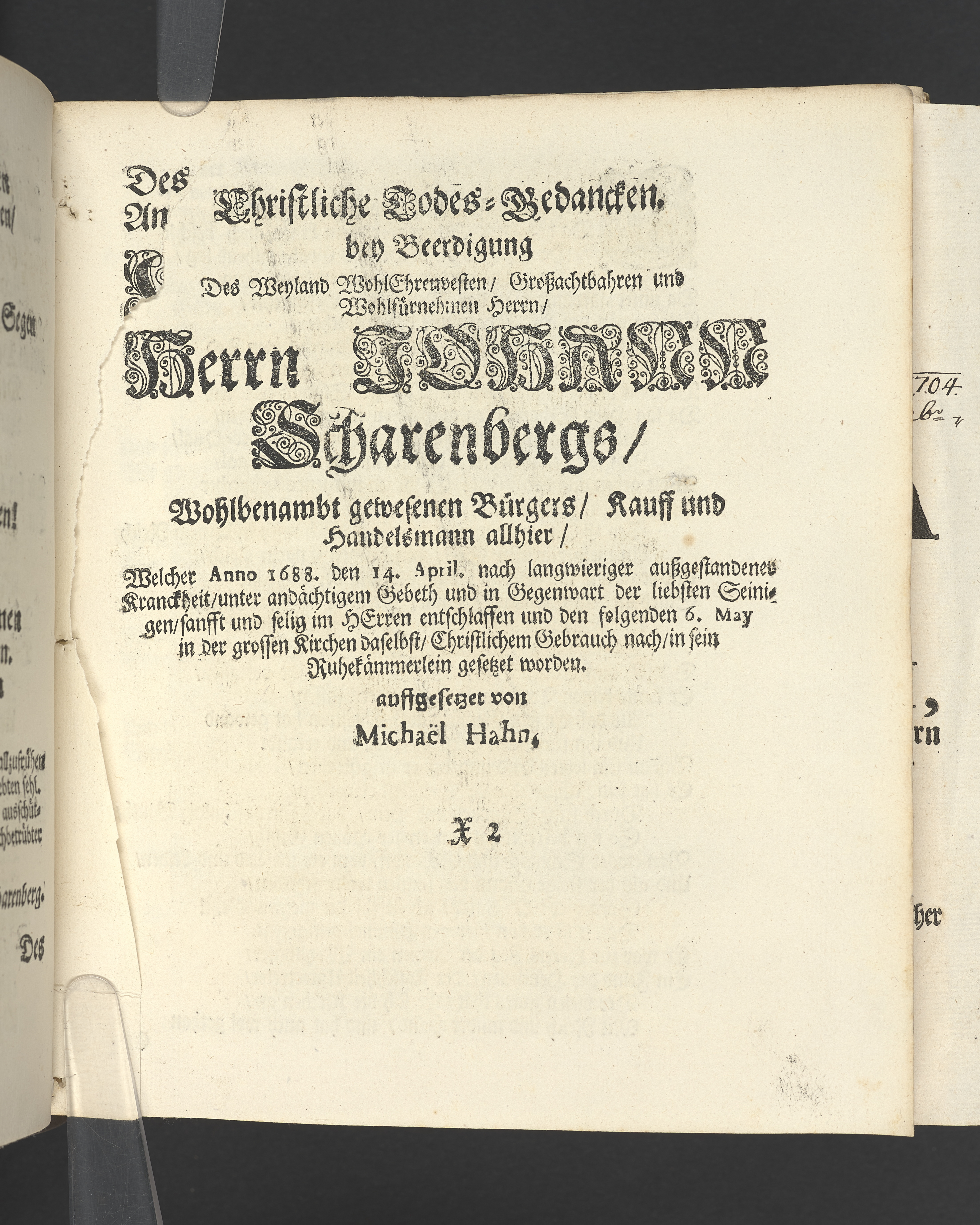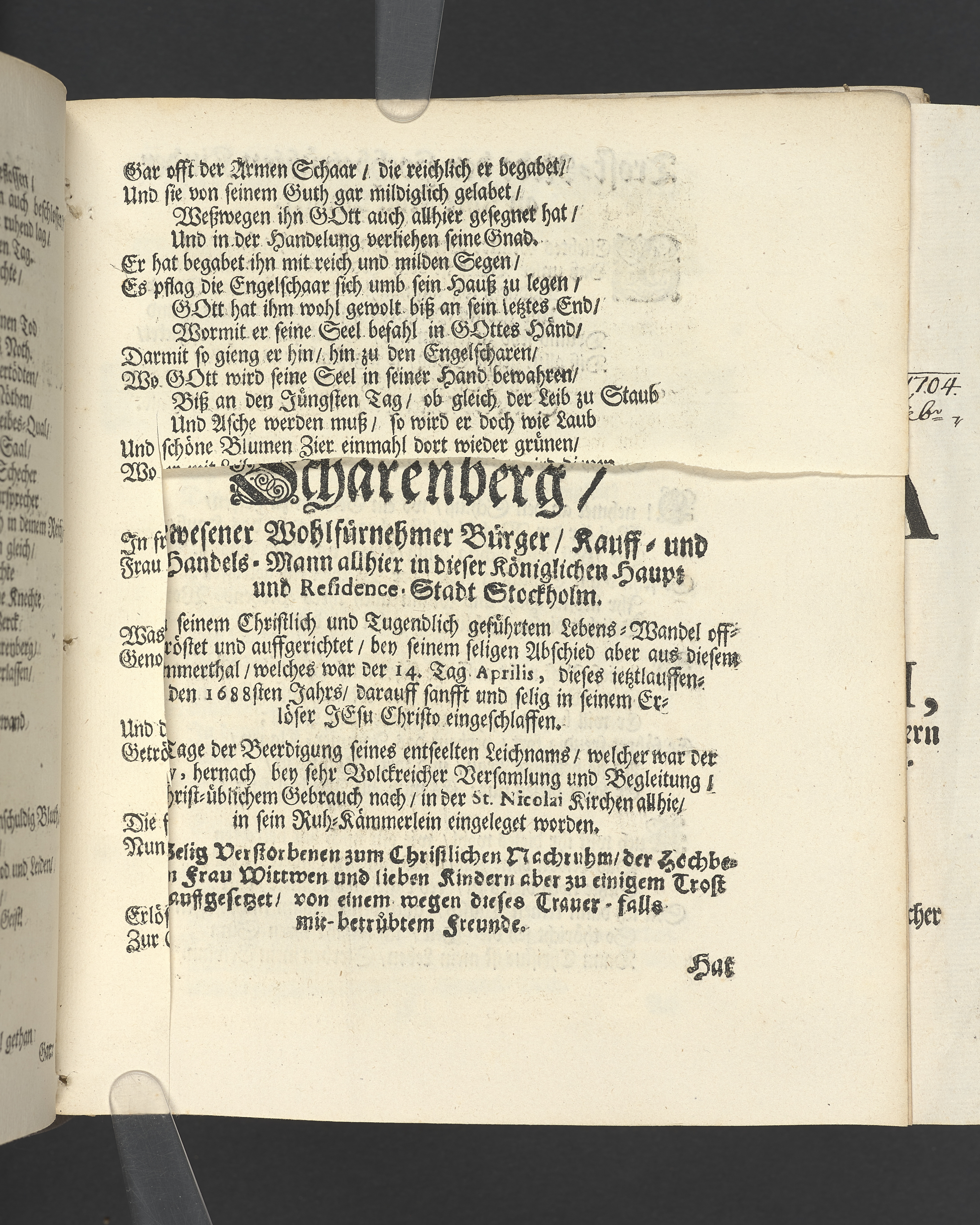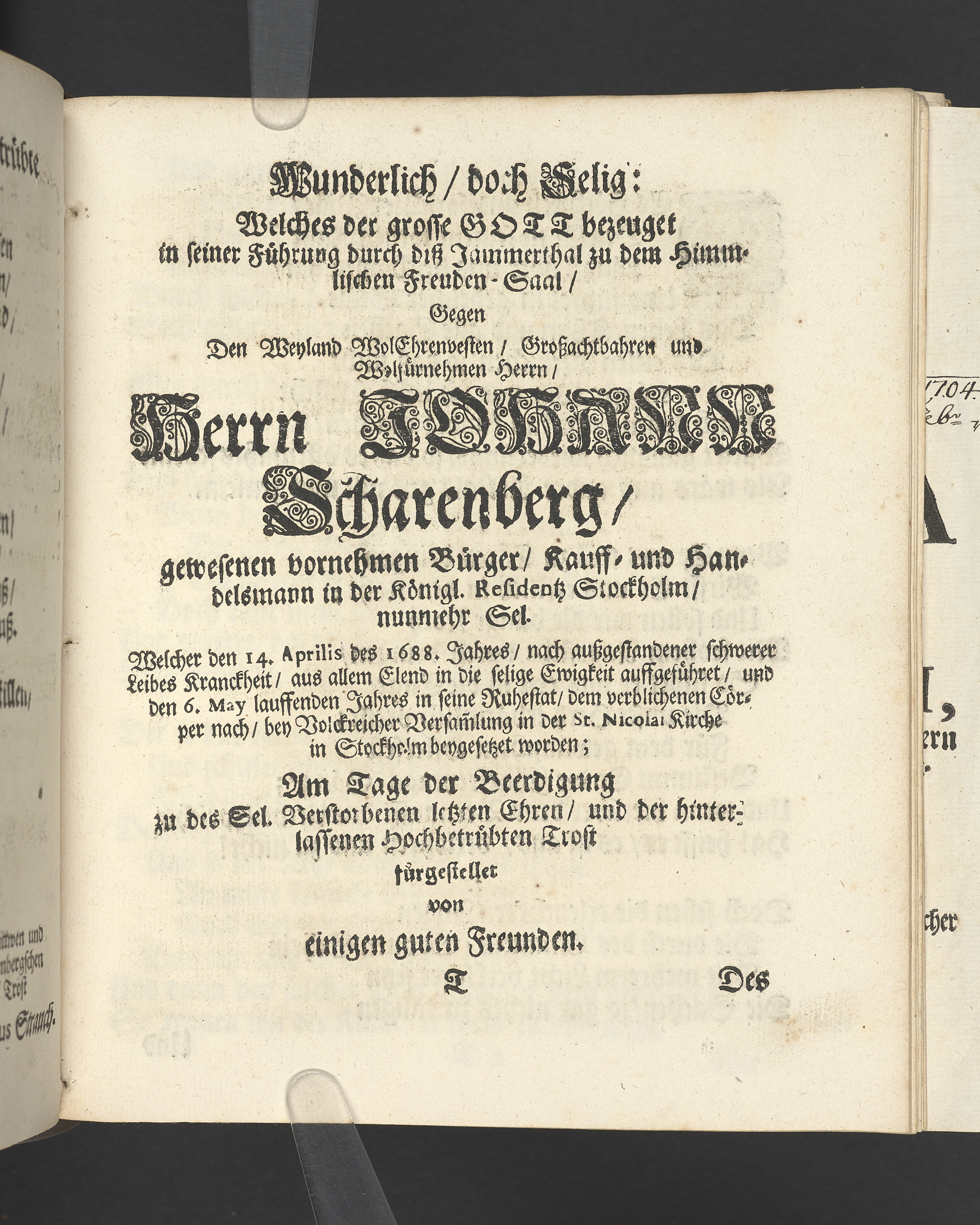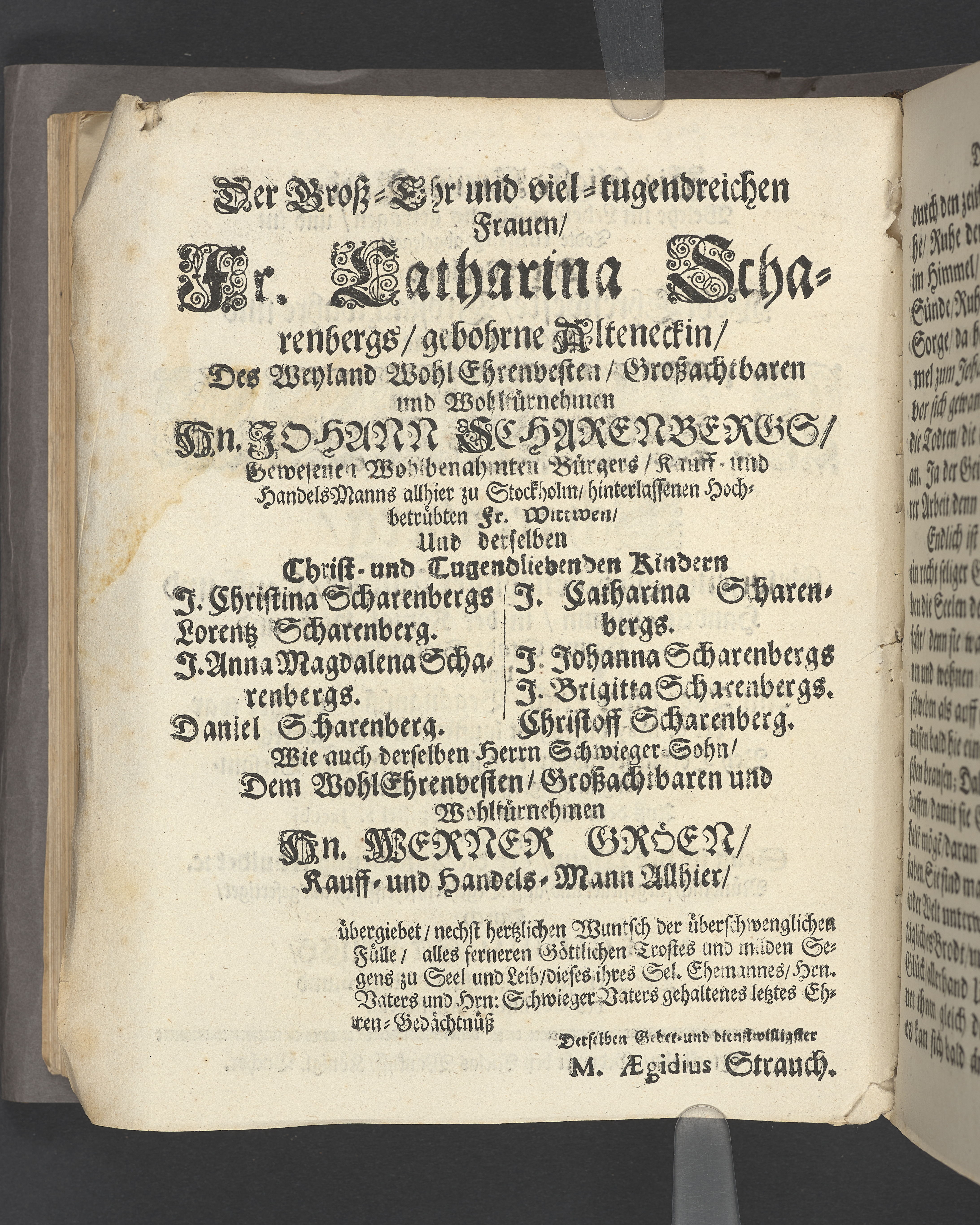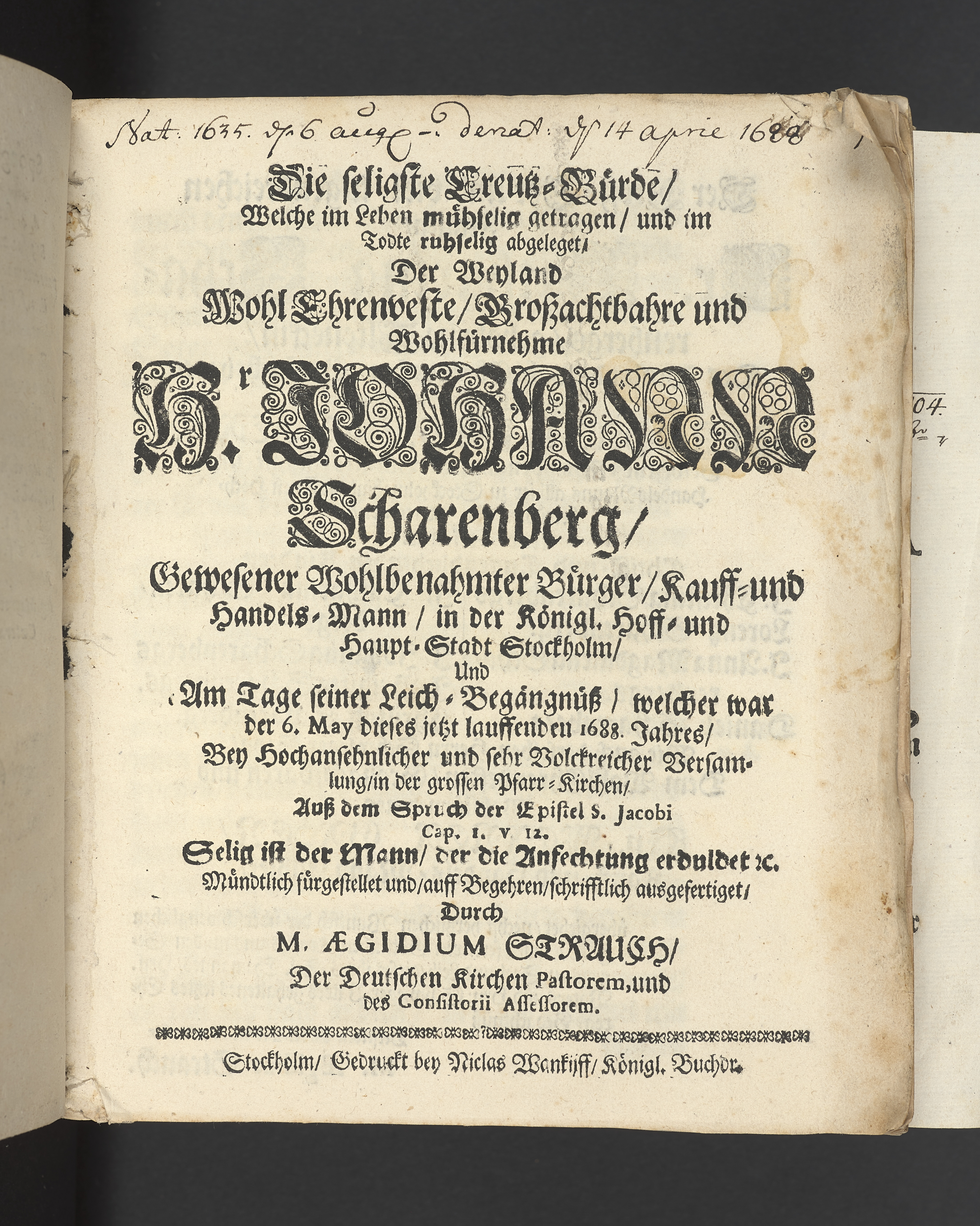 Die seligste Creutz=Bürde / Welche im Leben mühselig getragen / und imTodte ruhselig abgeleget / Der Weyland Wohl Ehrenveste/ Großachtbahre und Wohlfürnehme Hr. JOHANN Scharenberg / Gewesener Wohlbenahmter Bürger / Kauff= und Handels=Mann / in der Königl. Hoff= und Haupt=Stadt Stockholm / Und Am Tage seiner Leich=Begängnüß / welcher war der 6. May dieses jetzt lauffenden 1688. Jahres / Bey Hochansehnlicher und sehr Volckreicher Versamlung / in der grossen Pfarr=Kirchen / Auß dem Spruch der Epistel S. Jacobi Cap. 1. v. 12. Selig ist der Mann/ der die Anfechtung erduldet etc. Mündtlich fürgestellet und / auff Begehren / schrifftlich ausgefertiget / Durch M. AEGIDIUM STRAUCH / Der Deutschen Kirchen Pastorem, und des Consistorii Assessorem. Stockholm / Gedruckt bey Niclas Wankijff / Königl. Buchdr.