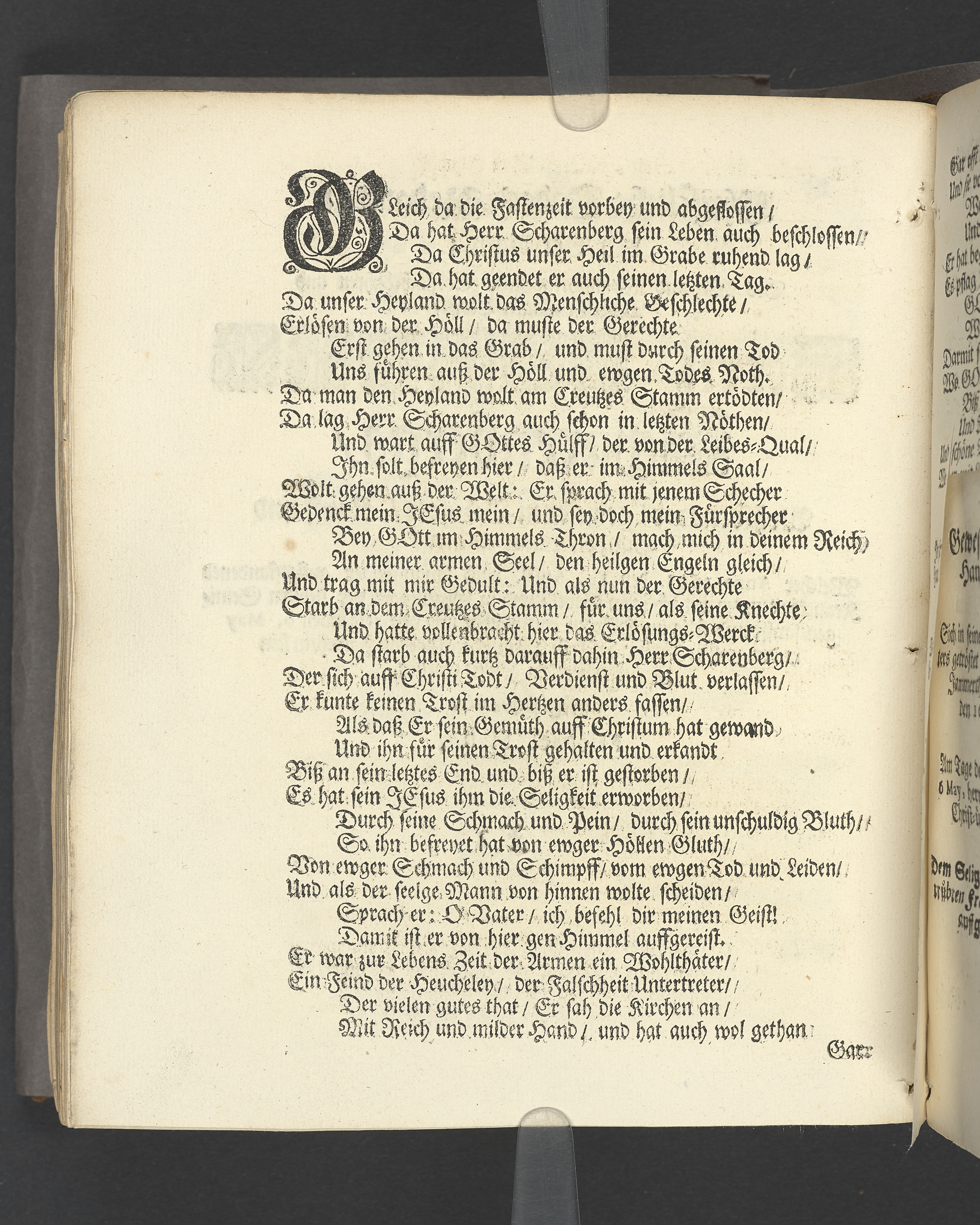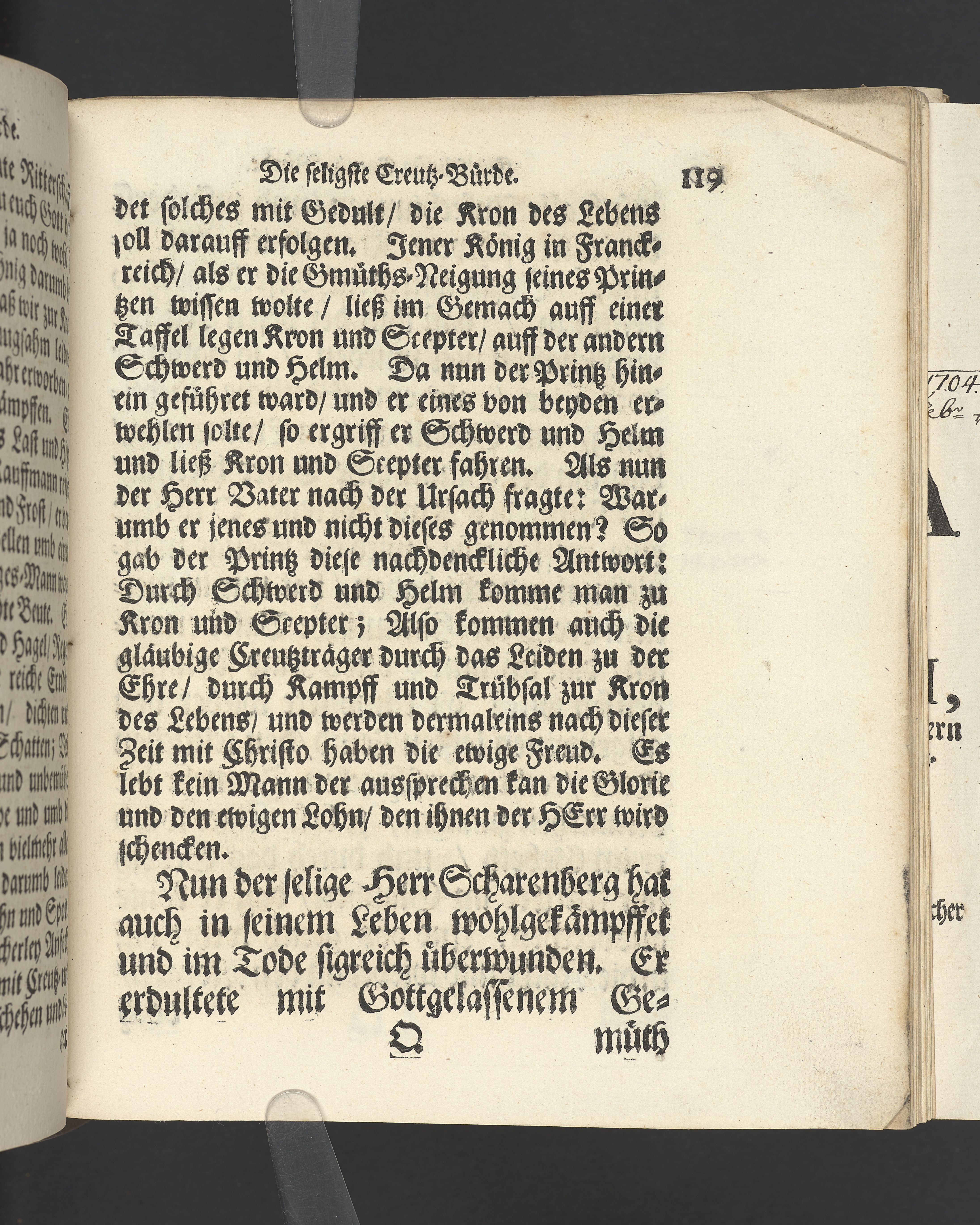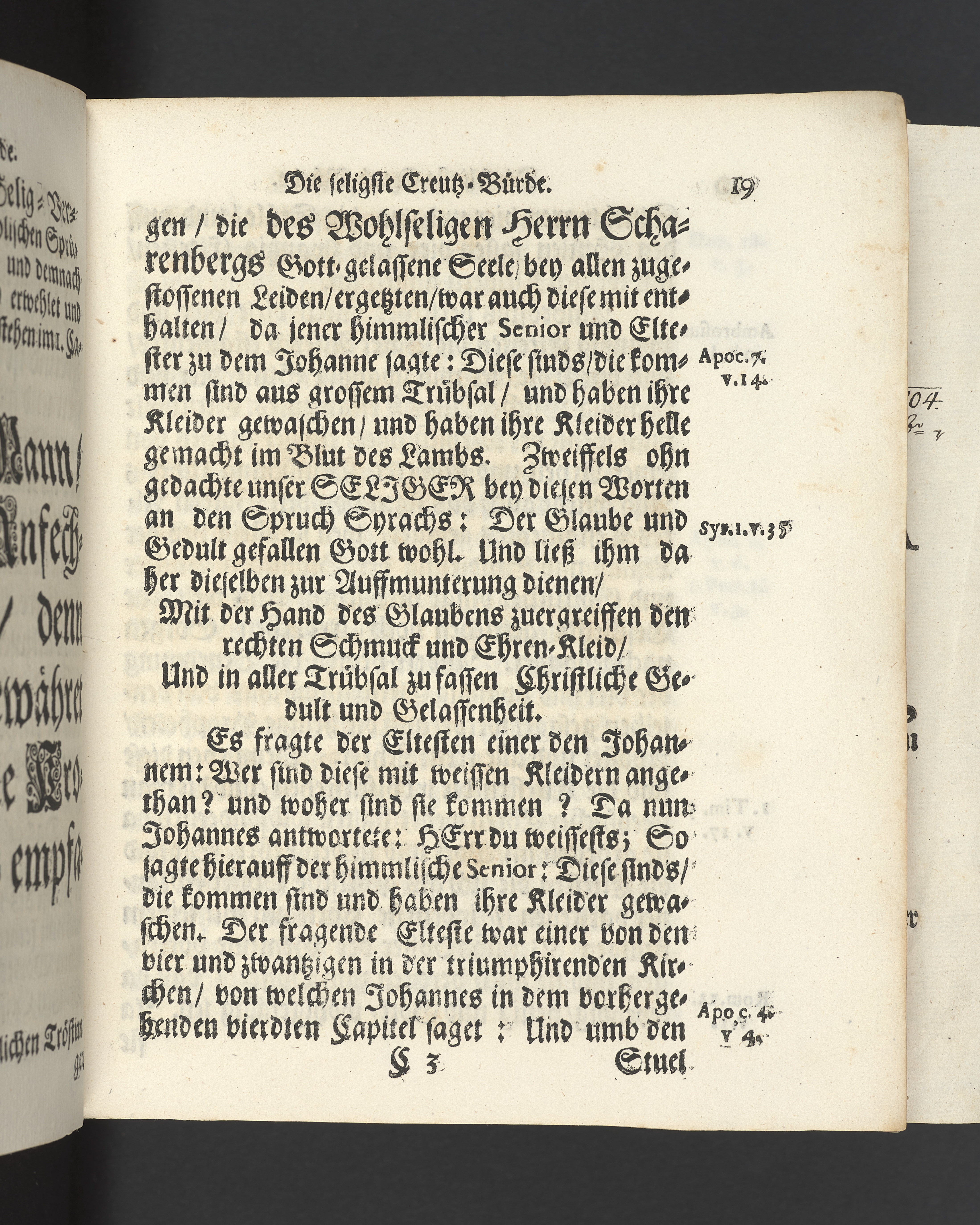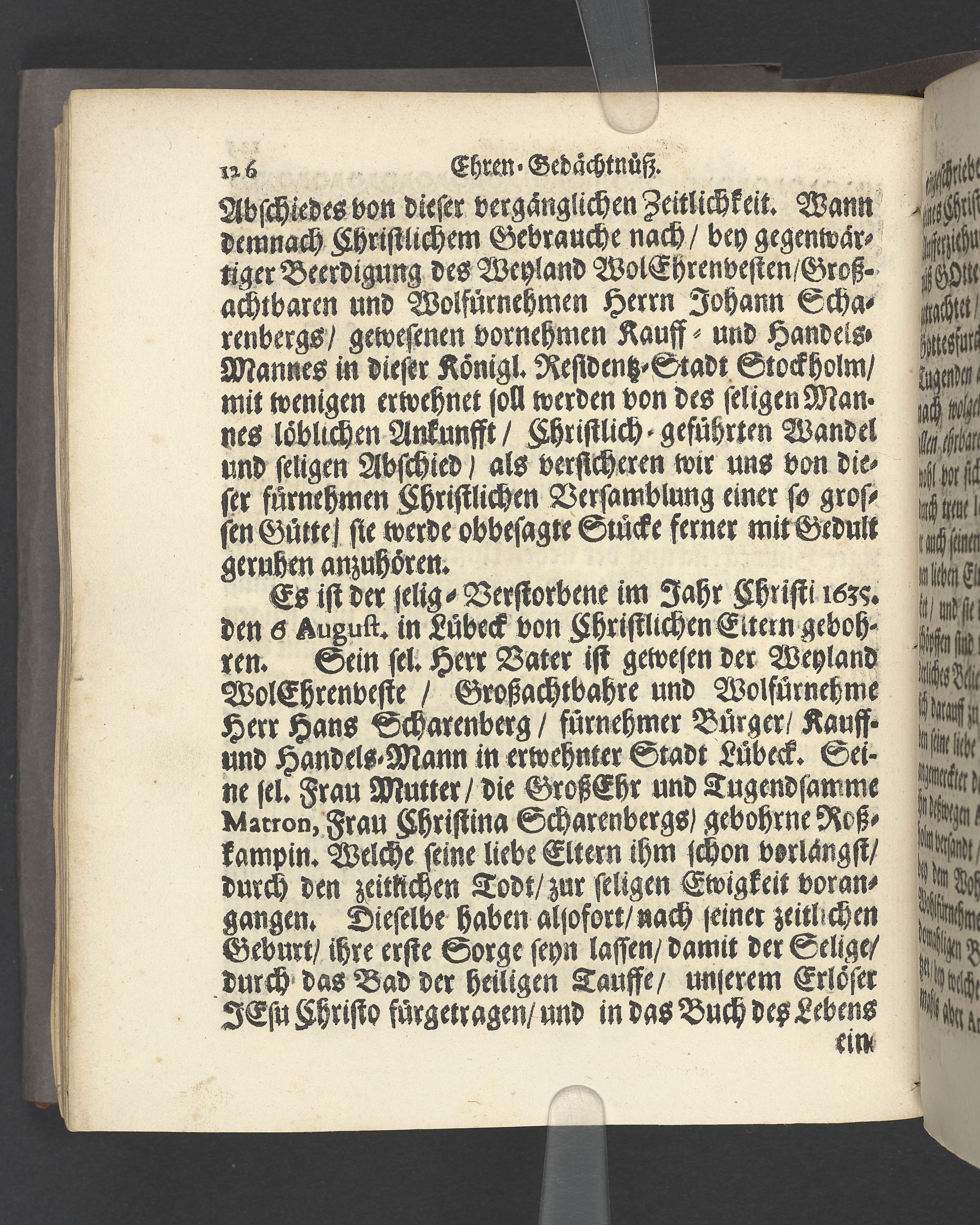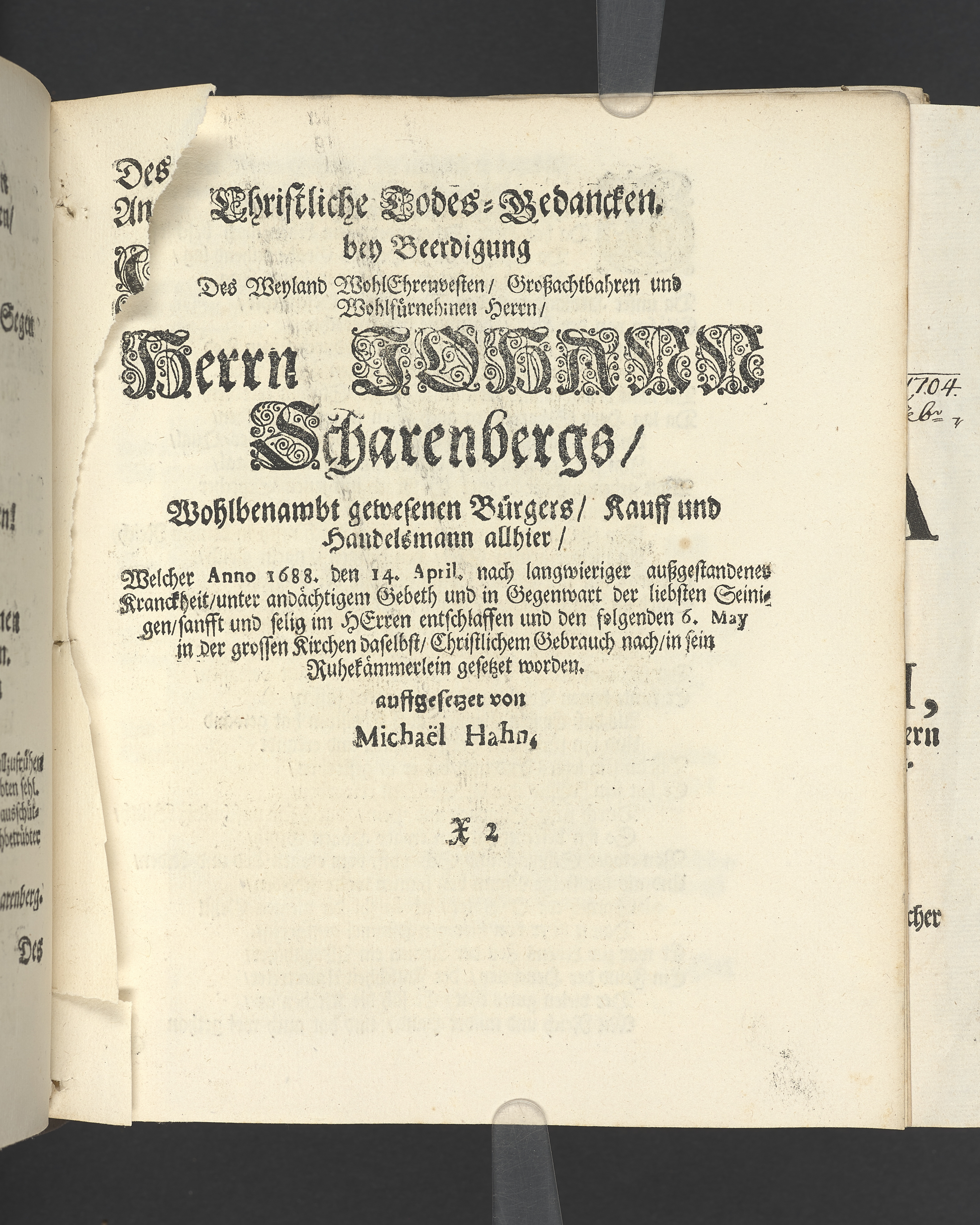 Die seligste Creutz=Bürde / Welche im Leben mühselig getragen / und imTodte ruhselig abgeleget / Der Weyland Wohl Ehrenveste/ Großachtbahre und Wohlfürnehme Hr. JOHANN Scharenberg / Gewesener Wohlbenahmter Bürger / Kauff= und Handels=Mann / in der Königl. Hoff= und Haupt=Stadt Stockholm / Und Am Tage seiner Leich=Begängnüß / welcher war der 6. May dieses jetzt lauffenden 1688. Jahres / Bey Hochansehnlicher und sehr Volckreicher Versamlung / in der grossen Pfarr=Kirchen / Auß dem Spruch der Epistel S. Jacobi Cap. 1. v. 12. Selig ist der Mann/ der die Anfechtung erduldet etc. Mündtlich fürgestellet und / auff Begehren / schrifftlich ausgefertiget / Durch M. AEGIDIUM STRAUCH / Der Deutschen Kirchen Pastorem, und des Consistorii Assessorem. Stockholm / Gedruckt bey Niclas Wankijff / Königl. Buchdr.