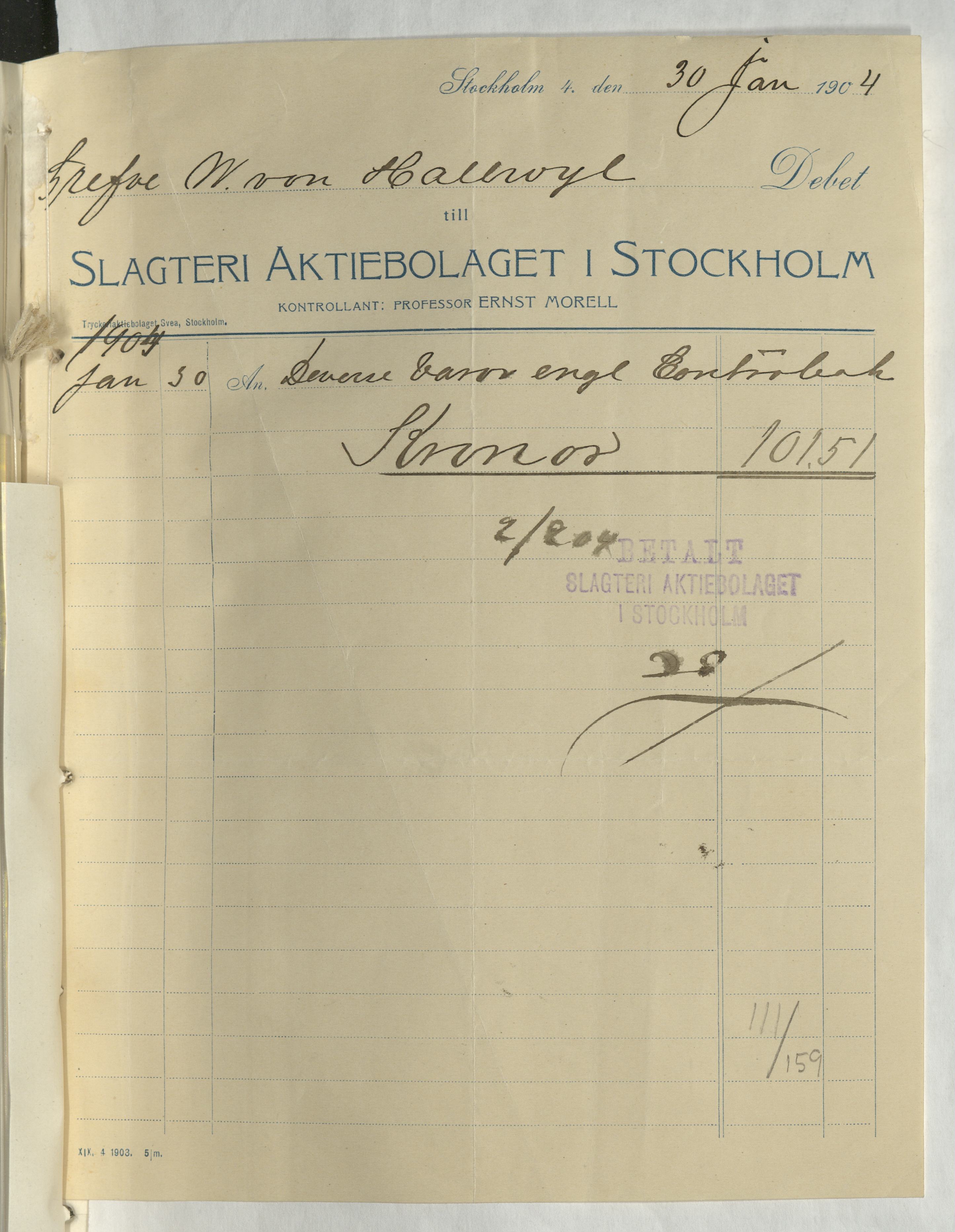 Kvitto från Slagteri Aktiebolaget i Stockholm