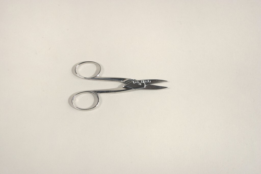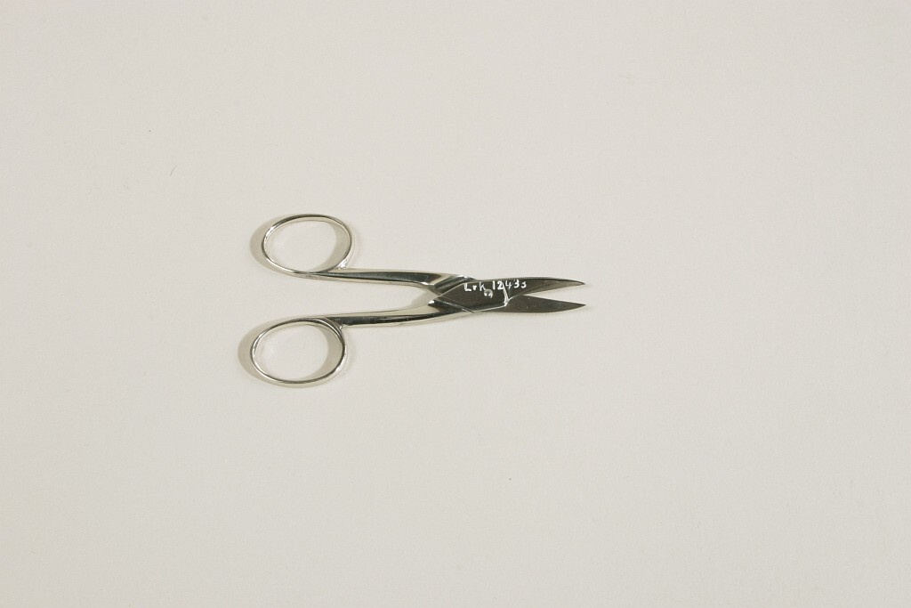 Sax av polerat stål med bladens baksidor räfflade. Otydlig stämpel.