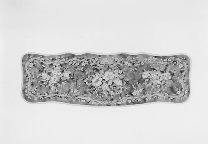 MÖNSTERFÖRLAGA, till möbelklädsel. Utförd i akvarell och gouache på papper, utgörande rygg till soffa, inv nr Gr VI:II:A.a.8 (se: Hallwylska samlingen, gr VI, text s. 273 f.f.) . I skala 1:1 med motiv av blombuketter och kransar och girlander mot blekgrön botten. Påskrift m. blyerts: "Soffa väfvd av Karin Nilsson får ej användas" samt "Börja här" Gåva 1943 av arkitekt Gustaf Clason (se protokoll 54 º 4)