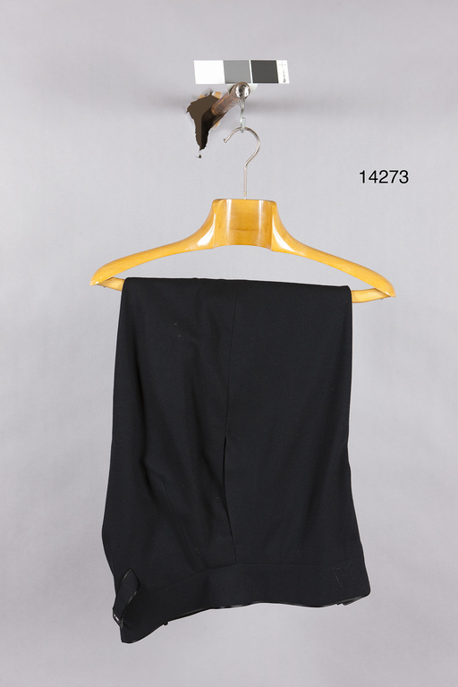 Byxor av svart ylle. Linningen knäppes med tre knappar, samt nedanför linningen en slejf med tre knappar. Gylfen knäppes med fem knappar. Bak i linningen ett sprund samt två spänntampar med en svart metallsölja med ordet "PRIMA". Tamparna löper rörliga mellan fodret och byxans tyg och är fästa vid sidosömmen. Sidosömsfickor samt på höger sida en bakficka samt fram en liten biljettficka. Spänntamparna samt linningen är kantade med svart siden, br: 3 mm. Nedåt avsmalnande ben, vilka längst ned på utsidan har ett sprund, l: 80 mm, vilket knäppes med tre tygklädda knappar. Benen spännes också ihop med en tamp och sölja. Söljans hela ram klädd med slipade, svarta glasbitar. På benets baksida går från sidosöm till inre söm en smal söm. Linningen fodrad med svart siden. Fickor av svart bomull. Bak i linningen en 80 mm lång svart hälla.