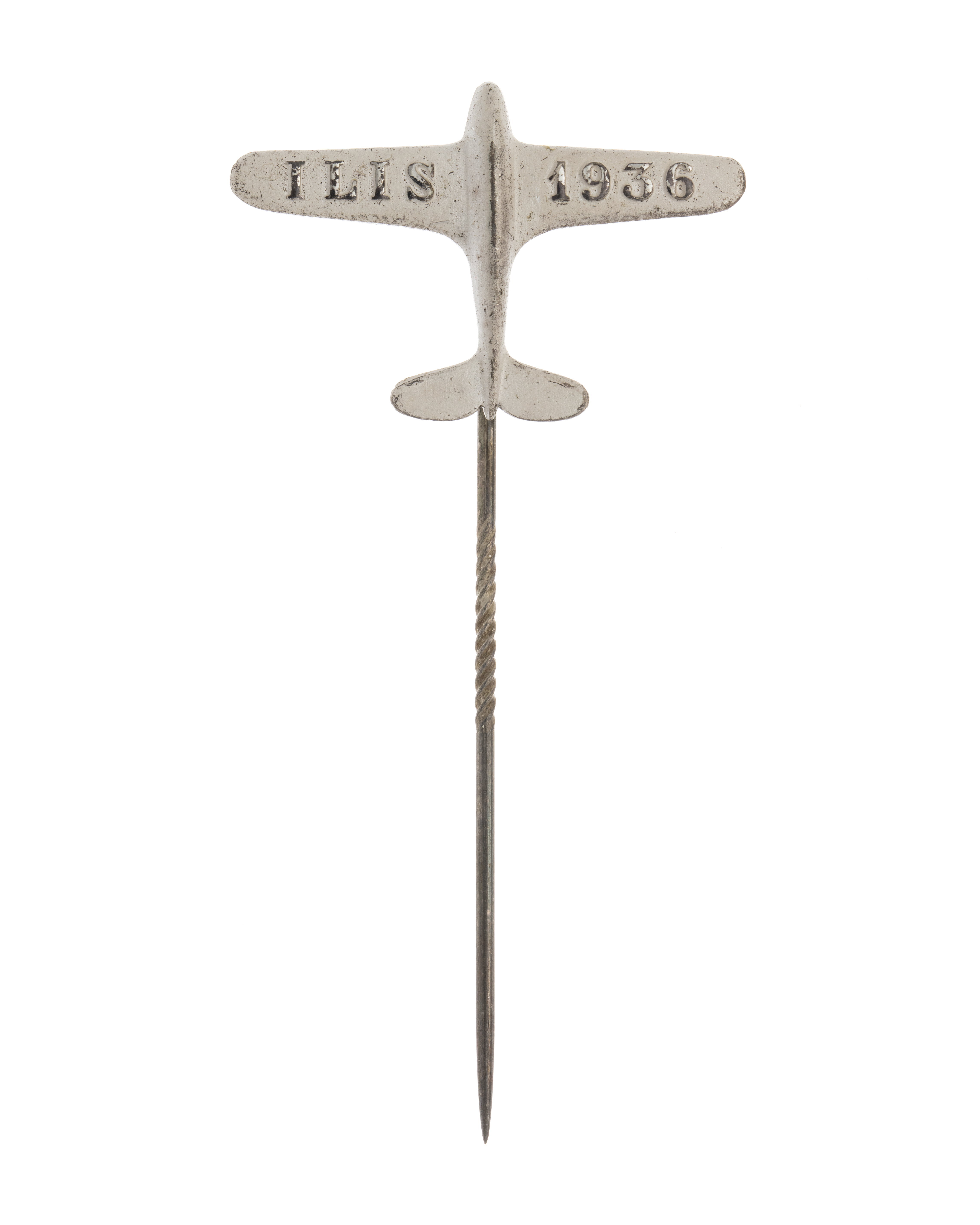 Märke i form av på ovansidan vitmålat flygplan pressat i vitmetall (silver?), på vingarna blank text: "ILIS 1936". På ena vingens baksida stämplat: "C.C.SPORRONG & CO". Nål med spiralvridet mittparti.
