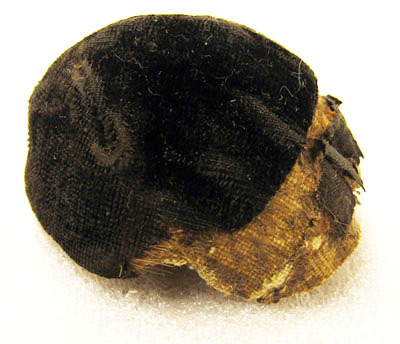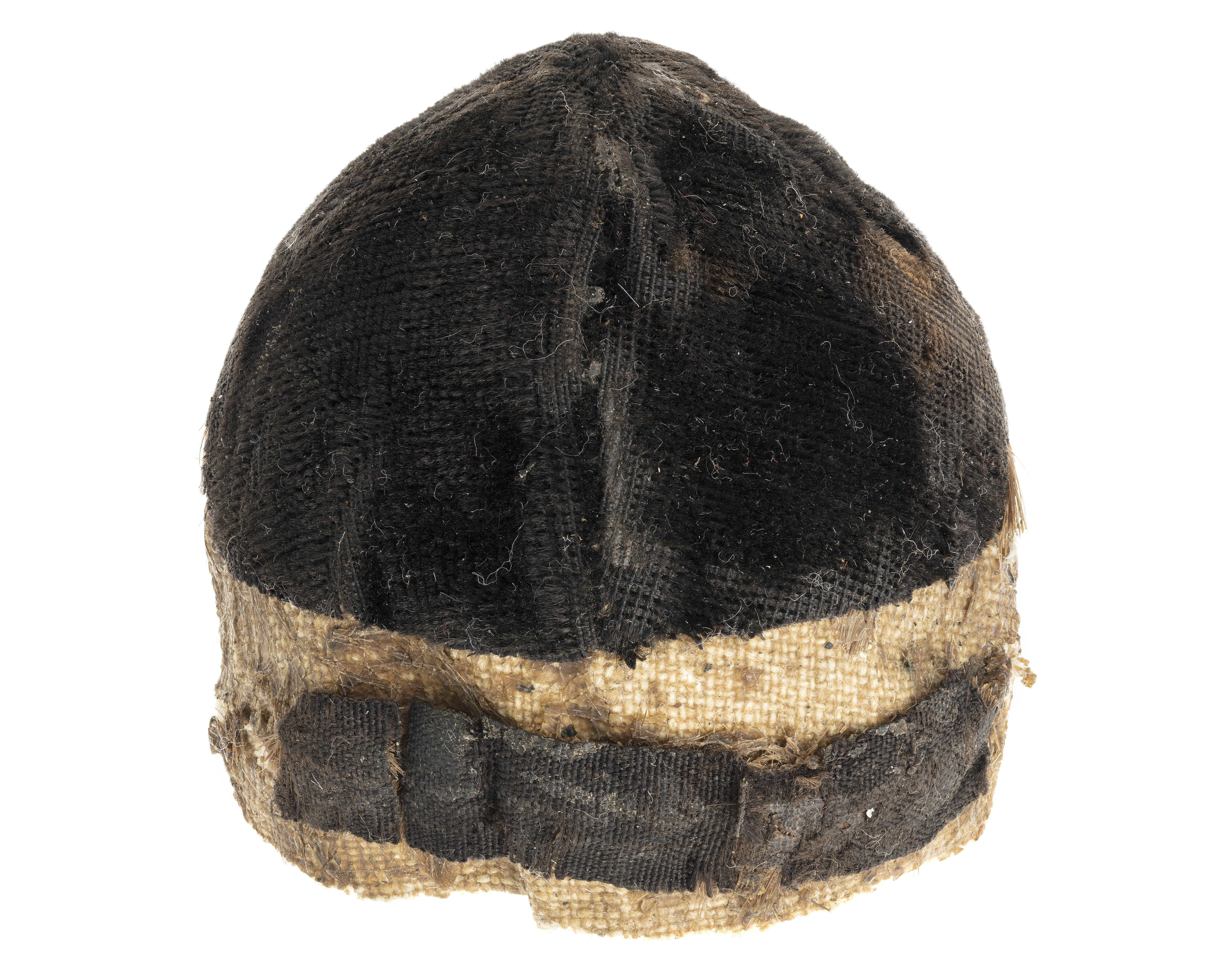 Hätta av förstärkt gulbrun linnelärft, utsidan till största delen klädd med svart silkessammet, över nacken sakans den. Längs kanterna vid tinningen rester av brunt hår. Formen rundad över hjässan med neddragna sidor och nackparti.