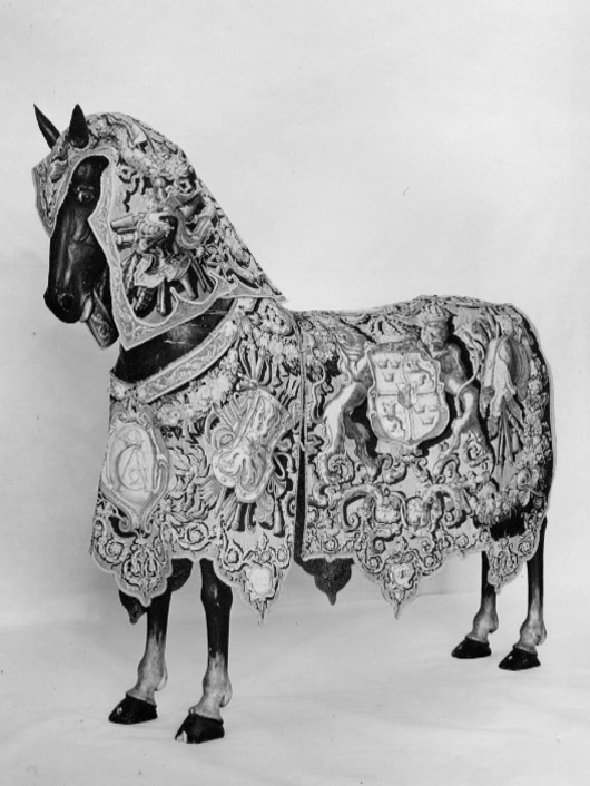 2 Romerska Häst Täcken med 2 halskappor och 2 bröststycken, wäfne som tapeter af silke och fin ull samt prydde med kronor och wapen, gewär, Konungens Namnn samt året 1621.