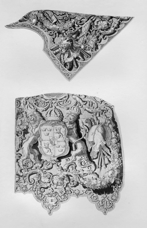 Två romerska hästtäcken, hvardera med halskappan och bröststycke, i gobelinsväfvnad af ull och silke, med ornamenter af trofeer, kronor och vapen, Gustaf II Adolfs namnchiffer samt "Anno 1621".