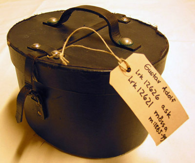Hattask av papp, utvändigt klädd med svart papper, invändigt med påklistrat gult tyg. Oval form. Locket låses med en i hällor fäst läderrem. På locket bärrem av läder. Bärrem och hällor fästade vid locket med förnicklade knappar. På askens undersida fyra förnicklade knappar.