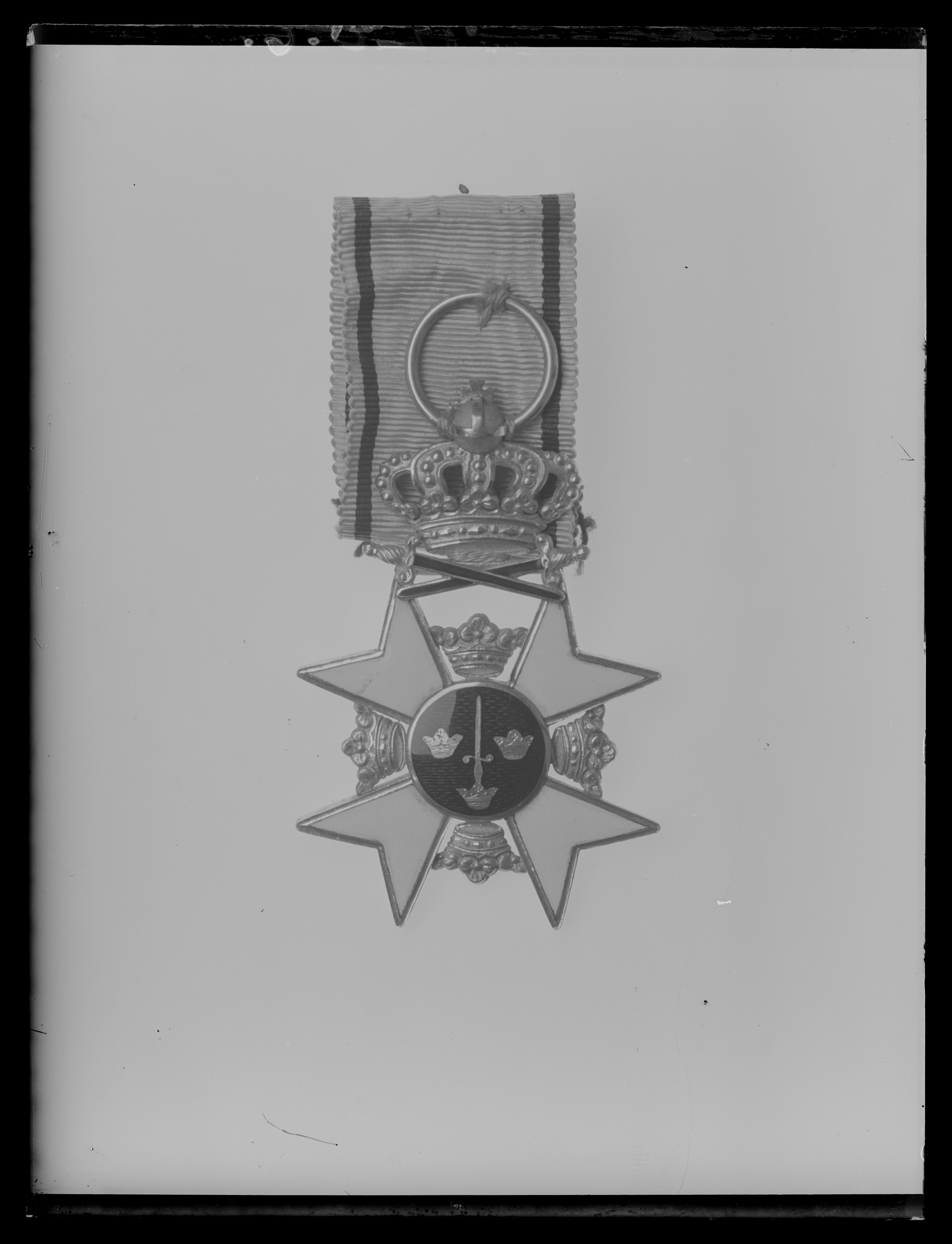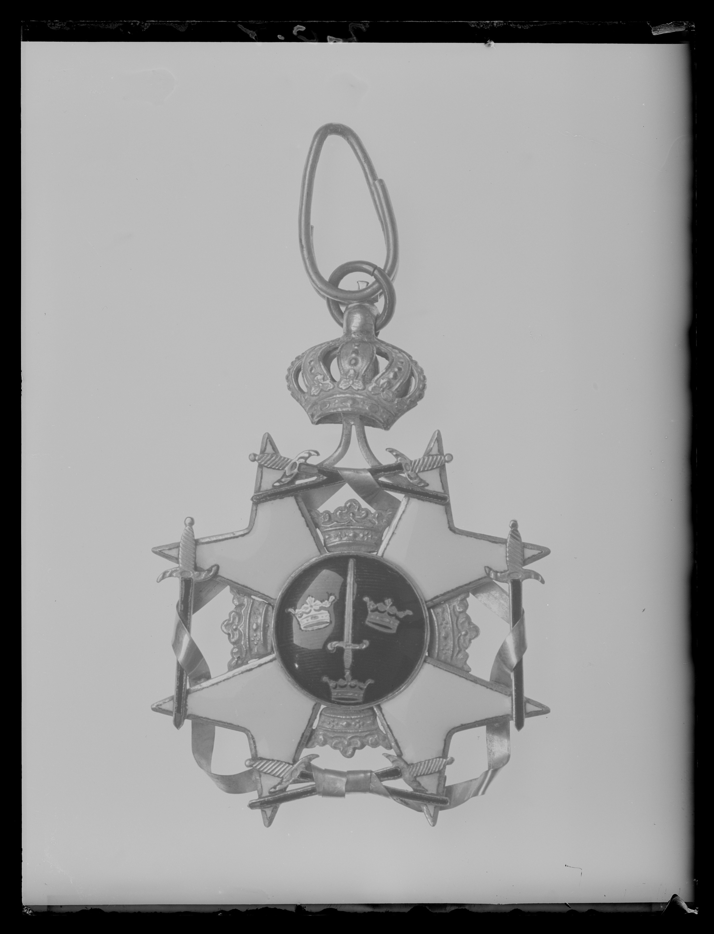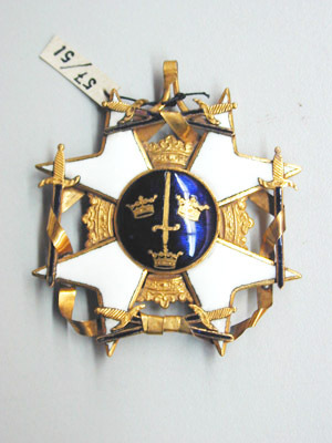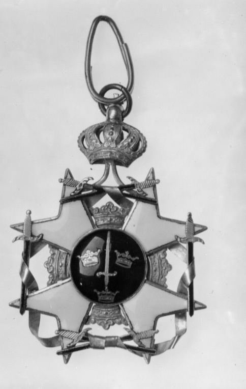 Vitemaljerat, diagonalt malteserkors av guld, utan kulor på spetsarna. Mellan de övre korsarmarna uppstående vinkelformig bygel med rörformig ring. Utseende i övrigt enligt statuterna.