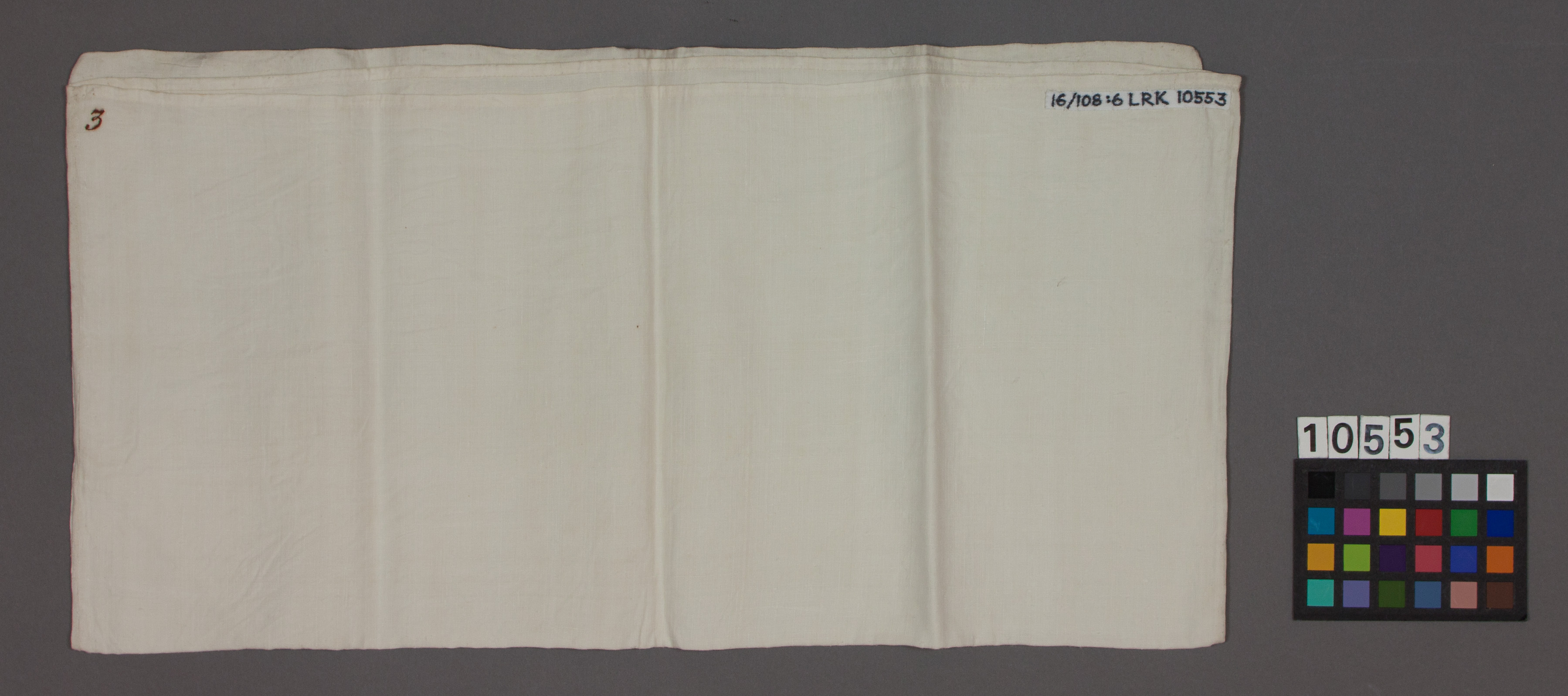 Plagg ingående i en korg med babykläder som använts av Sofia och Oskar (II):s barn. Kvadratiskt örngottsvar av vitt linne med handsydda sömmar. Ena sidanöppen och fållad, i ett hörn med märkbläck "3". L: 420 mm, b: 422 mm.