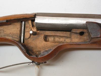 Rund, slätborrad pipa av stål med "åttsidig", på undersidan obearbetad kammare, rektangulärt, rakt svansskruvblad. Fänghålet saknas (!, möjligen igensatt). Fästning: Två häften. Pipan fäst med krysskruv underifrån, nitad över svansskruvbladet samt två pipstift av trä. Hjullås av västeuropeisk typ med välvt låsbleck. Utvändigt hjul fäst med studel kl. 6. Fängpanna med rundad nederkant, låg, rak krutskärm. Fängpannelock med rörlig arm. Hane med rak, fasad kropp och hals, käke med fasade kanter, underkäken lös, fyrsidigt käkskruvhuvud. Hanfjäder med fasade kanter, fjäderlöv med platta och upprullad spets. Eldstålsformig, platt hanstudel. Fästning: Tre låsskruvar. Avtryckaren saknas. Helstock av björk med beslag av stål och ben. Spetsoval kolvkappa fäst med skruv med kulformig skalle och ett genomgående stålstift inslaget från sidan. Låsskruvbrickor av ben. Varbygel av stål, framstolpen inskruvad i stocken, bakänden fäst med skruv.. Anmärkning: Fänghål saknas (igensatt?). Avtryckare, laddstock och näsband saknas. Varbygelstolpen fäst med modern skruv. Krysskruven nitad vid pipan. Kolven sprucken vid kolvänden, missfärgad där samt vid låset, framstocken sprucken i längsriktningen, bitar saknas framför främre pipstiftet, delen vid näsbandet saknas helt.