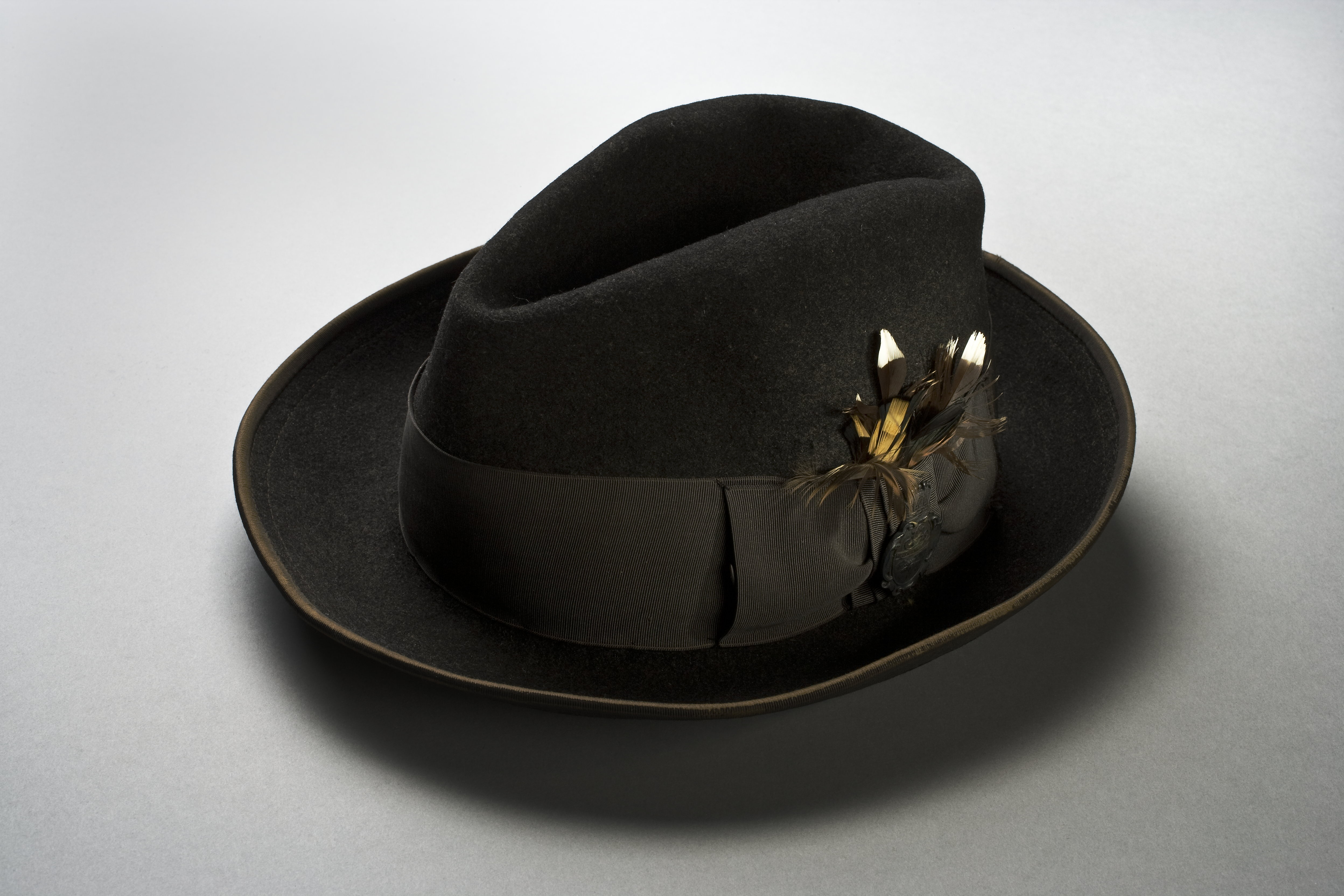 Hatt av brun-svart filt. Brättet kantat med brunsvart ripsband. Hattband av samma material 52 mm brett, på höger sida format till en stel rosett, på vilken Ornö jaktklubbs märke, av silver, är fästat. I rosetten nedstucken fjädrar, gula och bruna, vit och brun samt en grön. Foder av vitt siden. I kullen tryckt firmaetikett: " A.F. BODECKER )) H.M. KONUNGENS HOFLEVERANTÖR )) 6 Fredsgatan 6)) STOCKHOLM" samt Gustav V:s namnchiffer. Svettrem av ljusbeige läderimitation 49 mm bred.