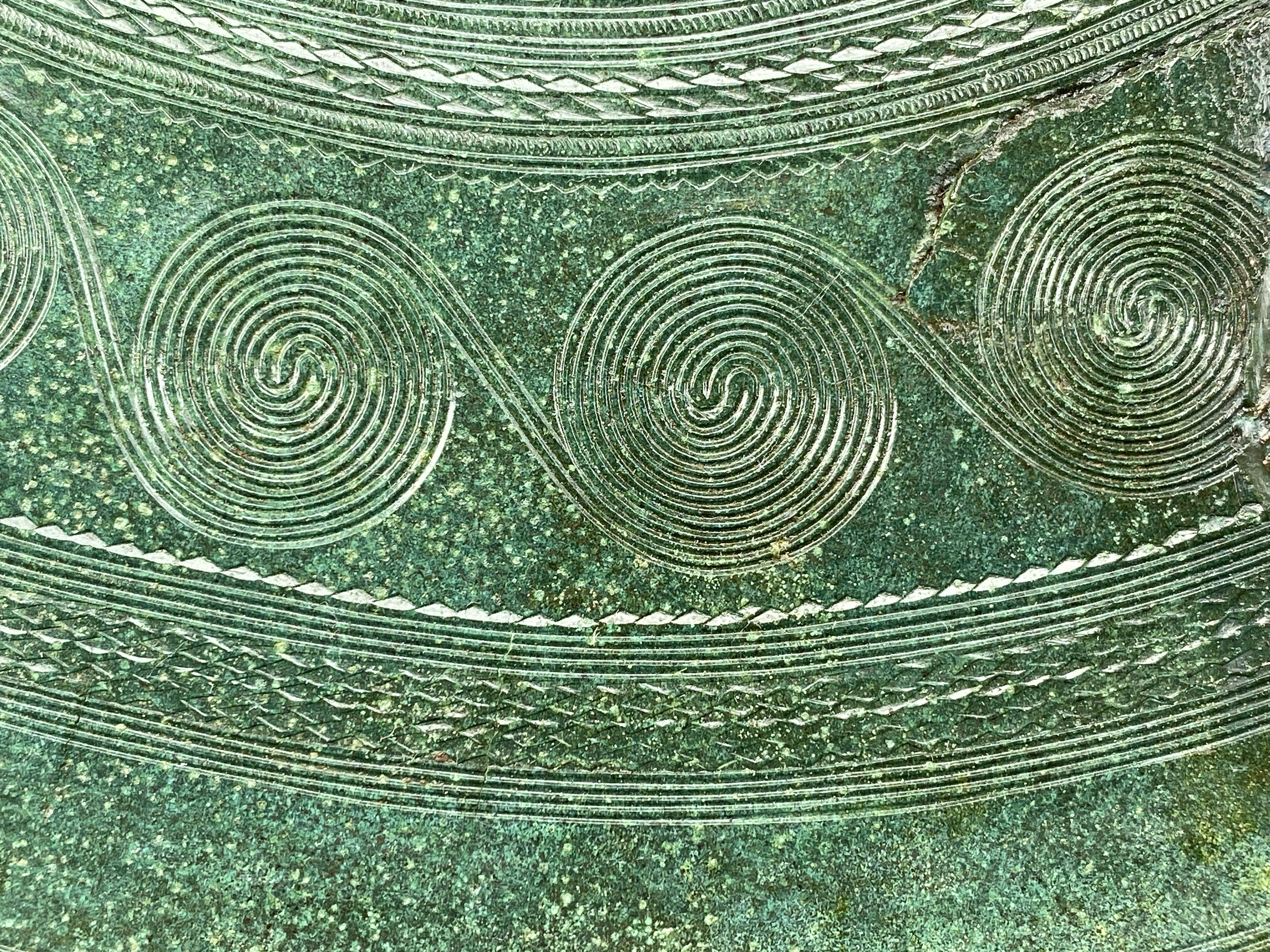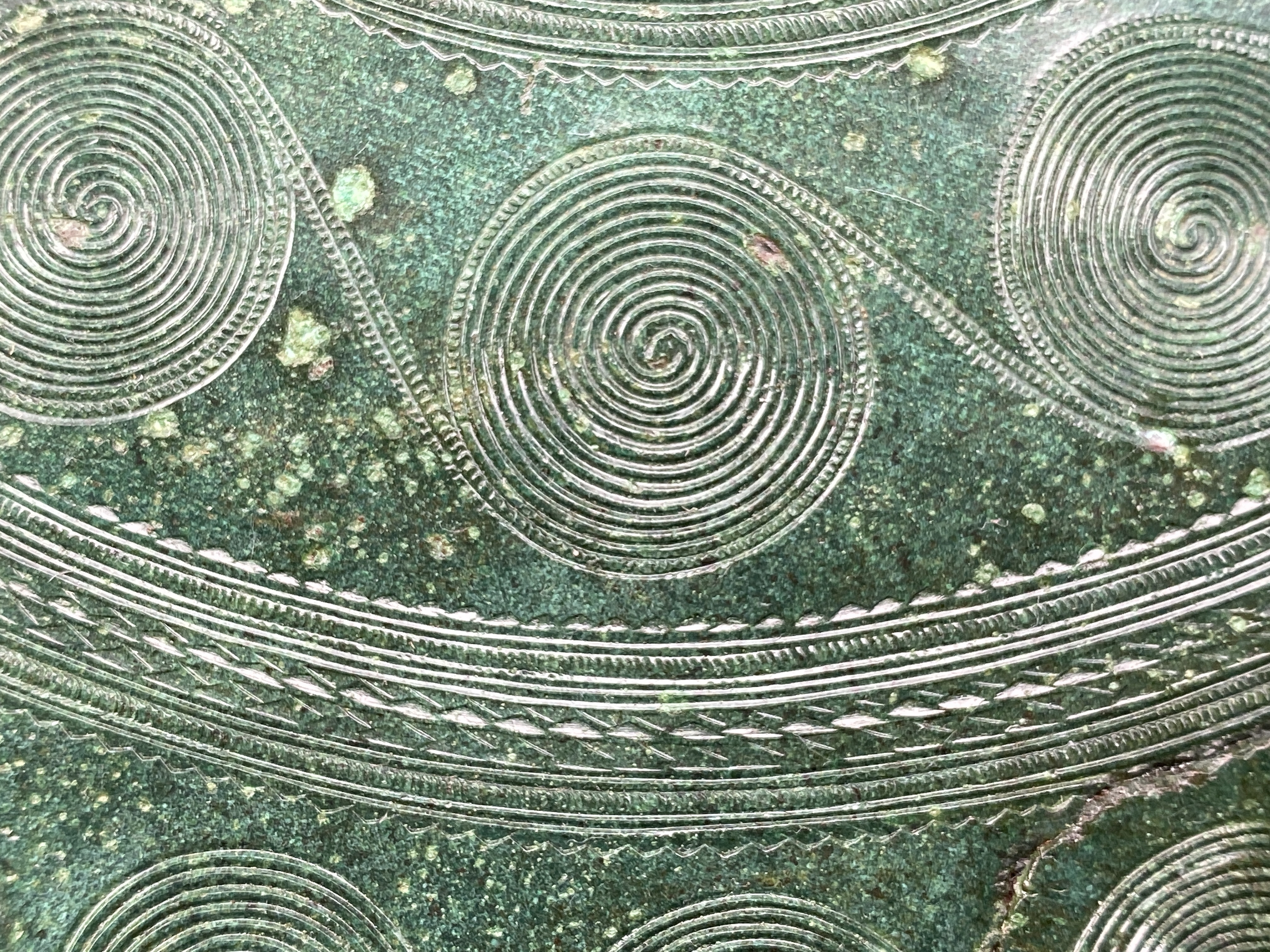 Bälteplatta av brons ornerad med inpunsad spiralornamentik. hög pigg i mitten med dekor. På baksidan odekorerade med en fästeanordning med dubbla valv som bildar fyra öppningar