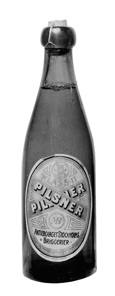 PILSNER, KLASS II, AB, Stockholms Bryggerier (Münchens Bryggeri), Stockholm, tre 1/2 literbuteljer. Av brunt glas. Cylindriska, med starkt sluttande skuldra och kort, svagt konisk hals, kring mynningen en bandliknande utsvällning (s. k. stärkring); bottnen insänkt. Etikett stående oval, i vitt, rött och svart, något nedanför mitten bryggerimärke i rött (M. B. i monogram inom två ringar), överst Stockholms stads vapen (S:t Erik i bröstbild). På korken stämpel. (Ovanpå korken en extra kork, överbunden med mässingtråd i huset Hamngatan 4.) Höjd: 21,4 cm.; diameter: 6,5 cm. Inköpta av Wilhelmina von Hallwyl den 25 November 1929, från AB Stockholms Bryggerier (Münchens Bryggeri).