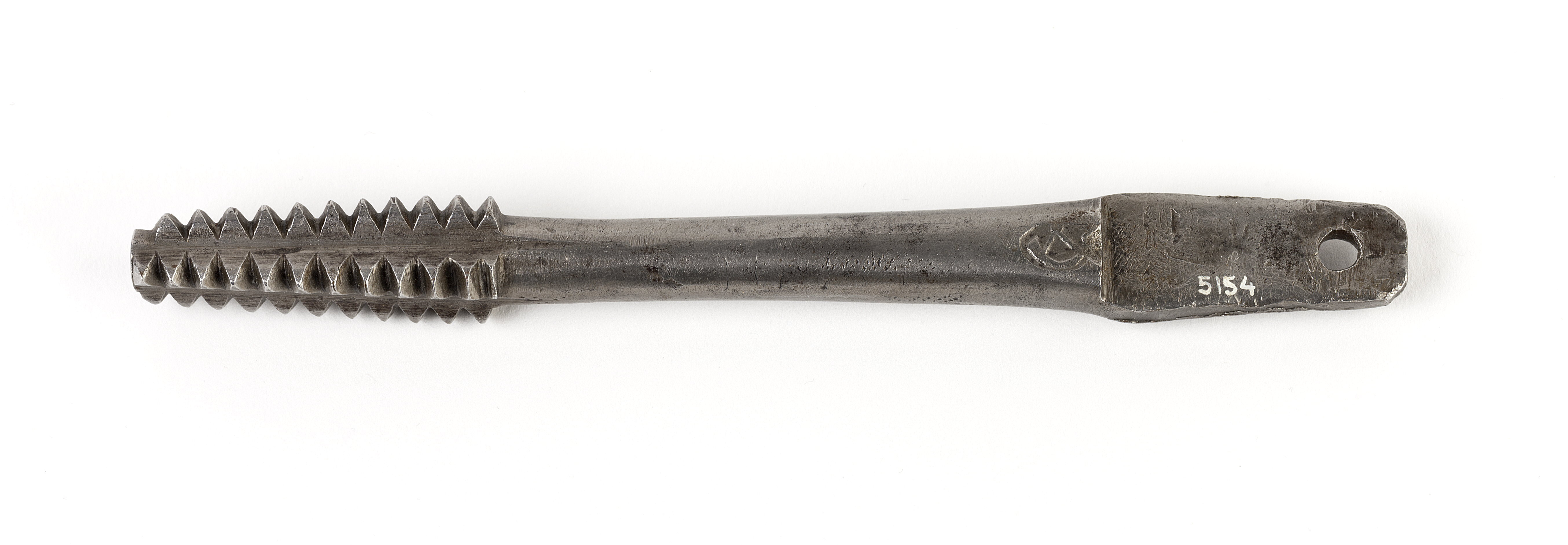 Konisk, med fyra rader pyramidformade skär. Runt skaft, upptill utsmitt till platt tånge med runt hål. Stämpel: halvcirkel, förtjockad i ena änden, i andra änden avslutad med punkt, med två radier förenad med en annan punkt. Gängornas stigning 5 mm.
