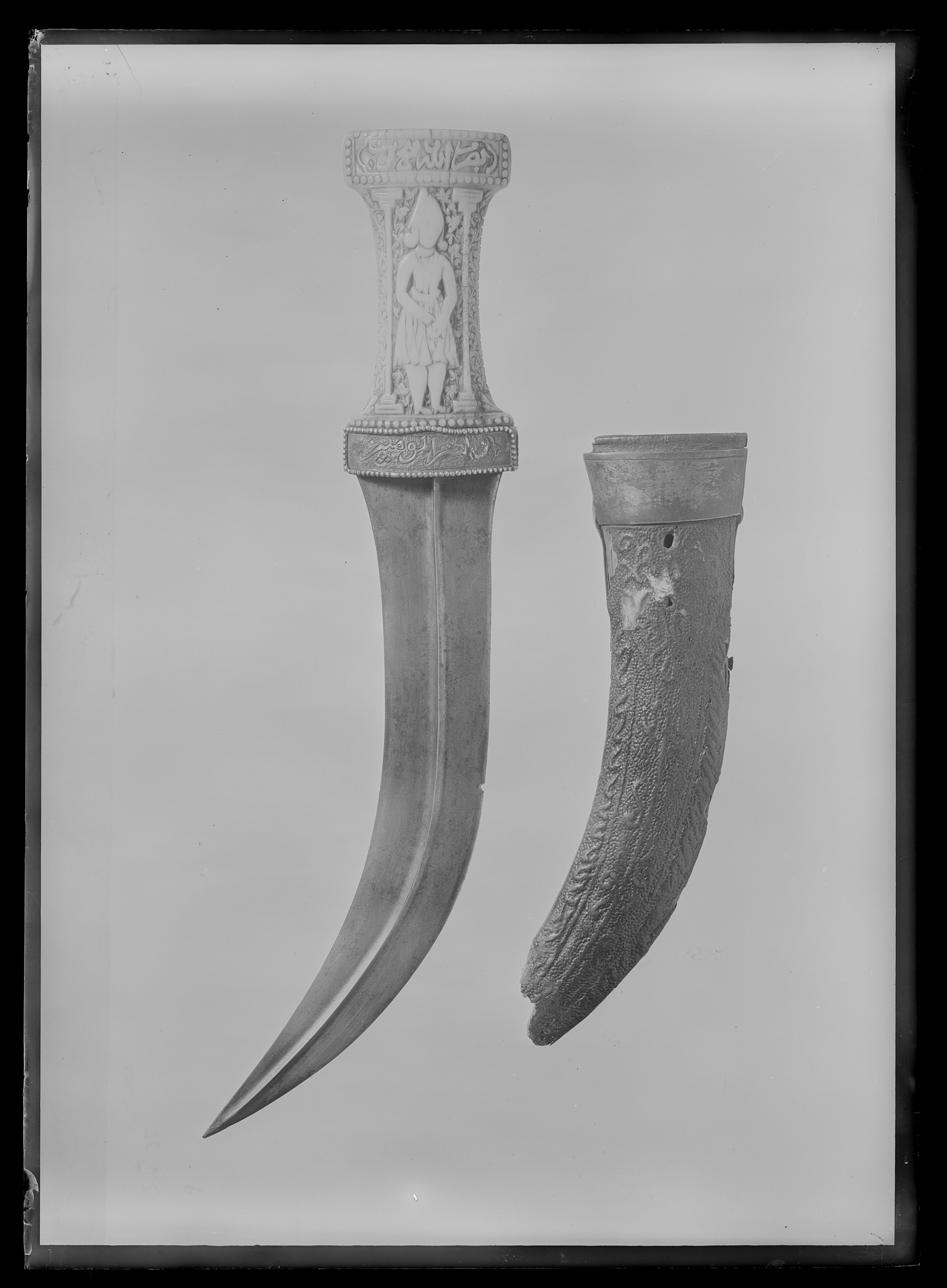 Timglasformigt fäste med spetsovalt tvärsnitt av ben med snidad yttäckande ornering av blad- och blomornament. På insidan en mansfigur. Fästet nedtill belagd med driven och ciselerad silverplåt med kant av pärlstav, inneslutande arabiska skrivtecken:"NasRé Menallah va Fathén Ghareeb (Med guds hjälp är segern nära) Va basher al moamenin (Meddela de som tro på Gud)" (se kat.kort) Klinga böjd, tvåeggad med mittås.