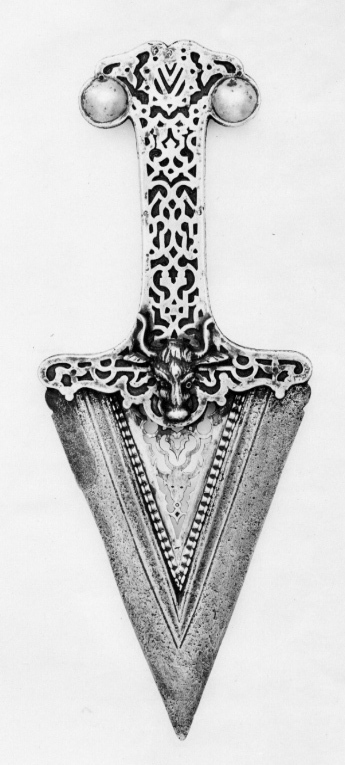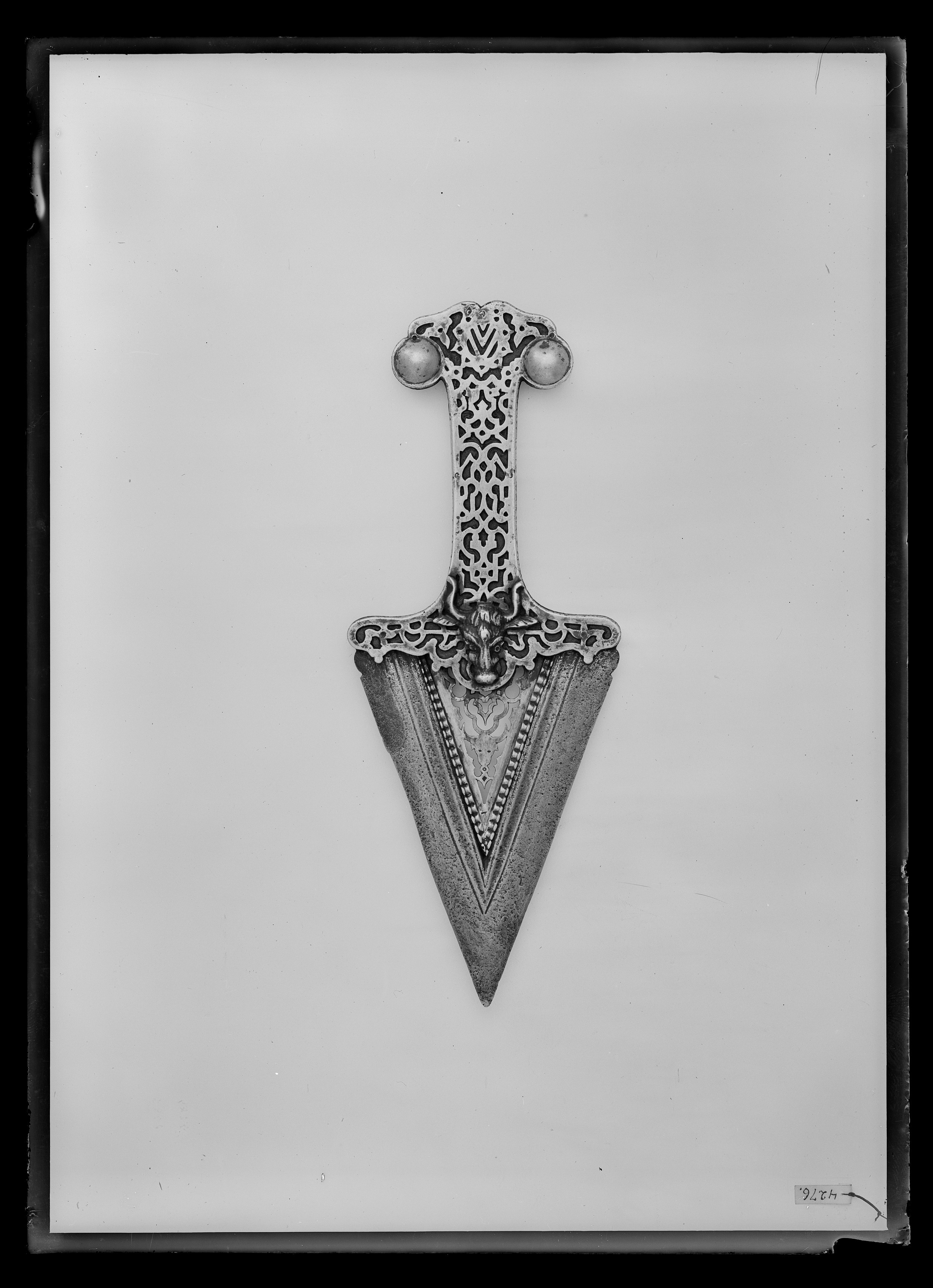 Platt, symmetriskt fäste, upptill och nedtill utvidgat med plattor av mässing, nitade genom tången och täckt av genombrutna, fastnitade plattor av silver. Gallerverk, upptill två stora runda, välvda nitar. Nedtill ett ciselerat tjurhuvud på var sida. Trekantig klinga av stål, rak, tvåeggad med genombruten triangel av silver med oxhuvud i mitten, omgiven av hålkälar.