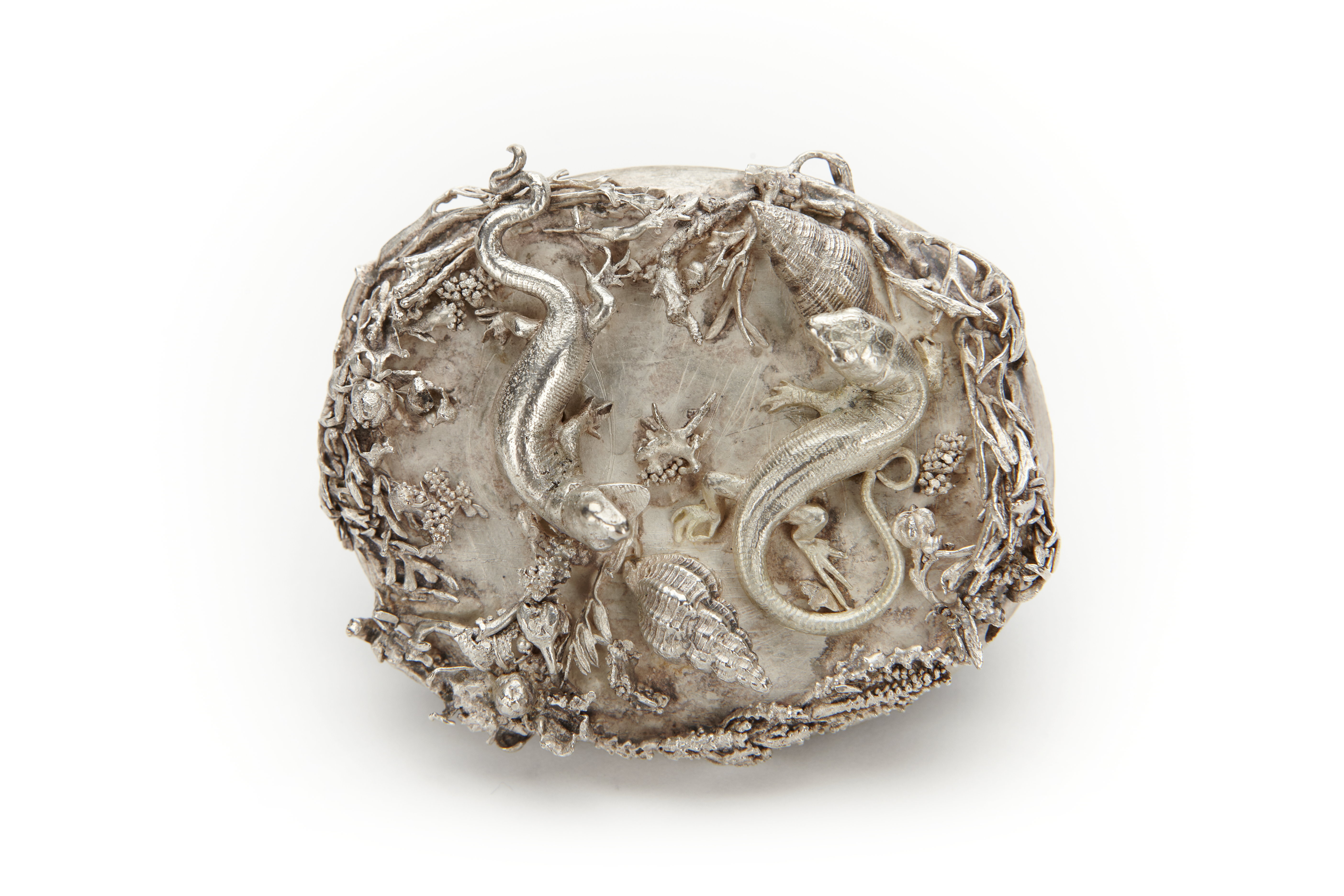 Pokalen tillverkad c:a 1780-1800, locket 1500-talets andra hälft. Vid mynningen lös bård av filigran. Fyrsidig fotplatta. Lock av ebenholtz helt täckt av silverplatta med gjutna ödlor, snäckor och kvistar i friskulptur. Locket i form av naturavgjutning med ödlor och växter i Wensel Jamnitzers art. Locket troligen Tyskland (Nürnberg?) omkring 1500 andra hälft. Pokalen i övrigt troligen Skandinavien eller England omkr 1780-1800. Ostämplad.