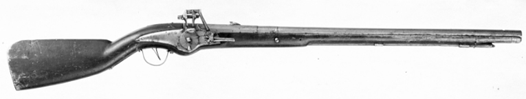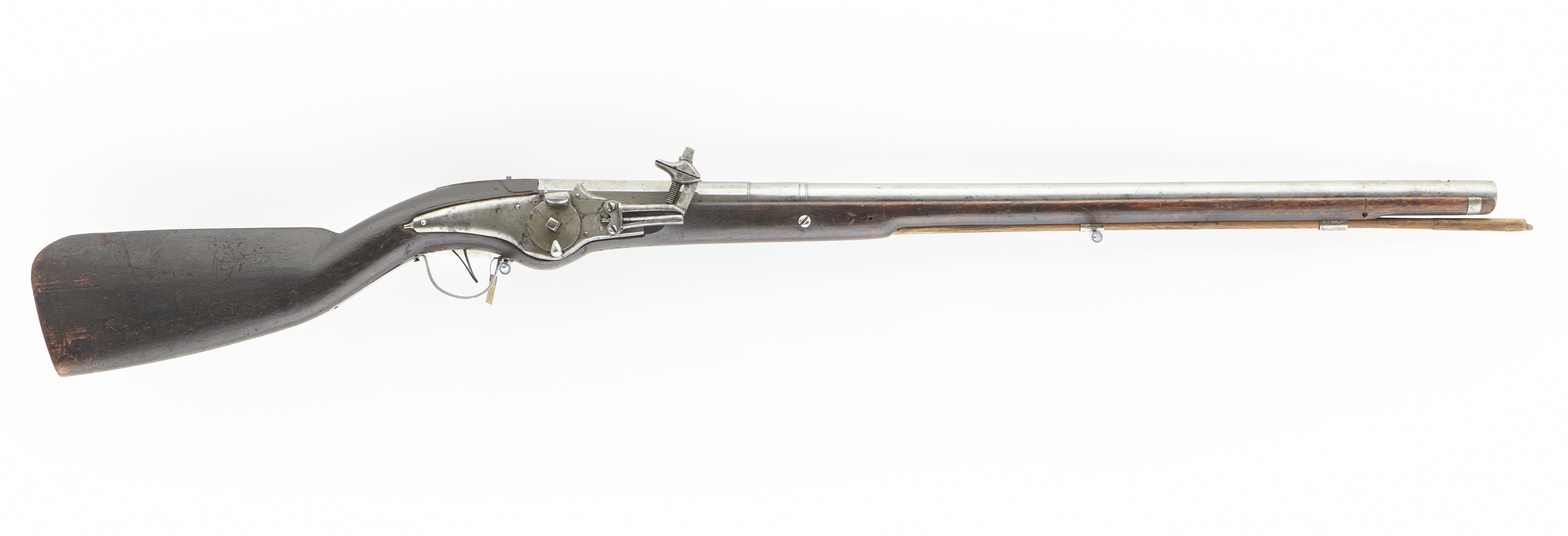 Rund, slätborrad pipa av stål, åttsidig kammare med fasade kanter framtill, därframför ett 35 mm långt parti omgivet av en ring baktill och en profilerad ring framtill (ej parallella). Rakt, baktill tvärt avskuret svansskruvblad. På kammarens ovansida graverat: N.Z1, därbakom en stämpel: öppen krona. På v. sidofas kvadratisk stämpel I H, på h. K tre gånger. På undersidans mittfas en kronstämpel. Romersk siffra XII inslaget på sidan. Riktmedel: Inlaxat, hjärtformigt ståndsikte, b: 14 mm, 102 mm från pipbasen. Laxning för korn 36 mm från myningen. Fästning: Två häften. Pipan fäst med krysskruv underifrån (främre varbygelskruven), samt ett pipstift av stål (trådspik). Hjullås av västeuropeisk typ med välvt låsbleck, framför hjulet en stämpel I H. Utanpåliggande hjul urspr. fäst med studel kl. 6. Fängpanna med låg, rak krutskärm och svängd undersida med rundad ytterkant, fängpannelock med rörlig arm, utan tryckknapp (enbart stoppfjäder). Hane med rak kropp, rundad ytterkant. Rak, fyrsidig hals, huvud med lös underkäke, välvda över- resp. undersidor, kubiskt skruvhuvud. Hanfjäder med rundade kanter, omvänt B-formig hanstudel med kantlist mot fjädern. Fästning: Tre låsskruvar. Avtryckare omvikt till fjäder. Helstock av brunbetsad björk (al?). Kolv med rak, smal, plan rygg och rundad undersida, kindstöd med skuren bladvolut framtill och plan yta på nederkanten. Rak kolvände med svängd övergång till kolvryggen. Beslag av stål, på kolvänden märken efter bakplåt över hälen. Smala, bandformiga rörkor och näsband, b: 10 mm. Sidbleck - karbinstång med karbinring, d: 32 mm, sidblecket för de två bakre låsskruvarna, platta med nederkanten filad i två markerade rundade flikar, bakre delen närmast rektangulär. Karbinstången, l: 205 mm, framtill fäst med skruv genom framstocken, platta med två nedåtriktade flikar. Bandformig varbygel med baktill rundad bakre arm fäst med två spikar, framtill fäst med krysskruven. På kolvänden inslaget C W K samt M(?), i låsurtaget märkning XII, på framstockens undersida inskuret ligatur A P.