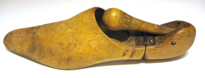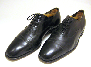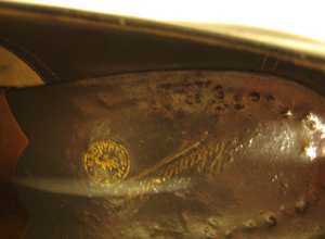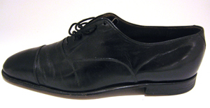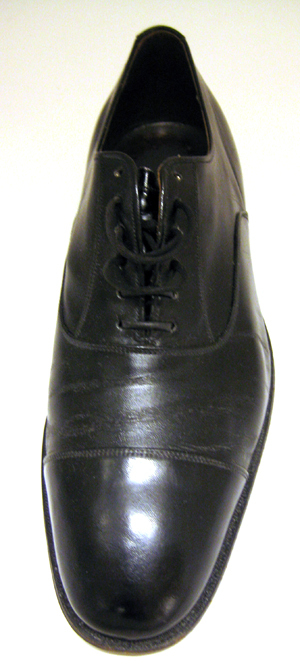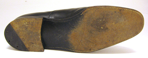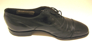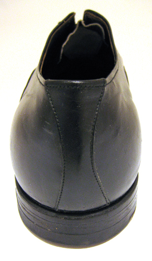 Skon är tillverkad av blankt svart kalvskinn och har sluten snörning. Modellen är en enkel Oxfordsko med en tvåtrådssöm som löper längs med den svagt rundade tåhättan samt gränsen mellan bladet och siddelarna. Bakkappan är delad med bakrem. Skon snörs med sex par snörhål. Den underliggande svarta plösen är fodrad med benvit filt. Skon har randsydd sula och bred låg klack Den främre delen av skon är fodrad med benvitt linne och bakkappan med grått kalvskinn. Innersulan är av brunt nötläder som i hälpartiet har täckts med en grå halvsula av kalvskinn. Klacken uppbyggd av tre läderdelar. Stiftlapp av läder är fastsatt med 21 små metallstift. Den är förstärkt baktill med en svart diagonalt skuren gummilapp?