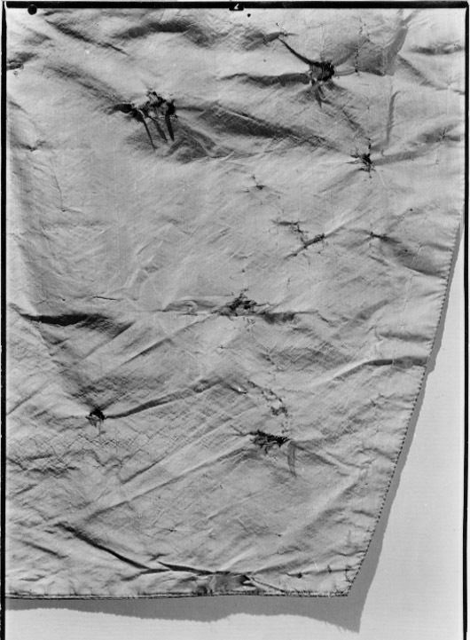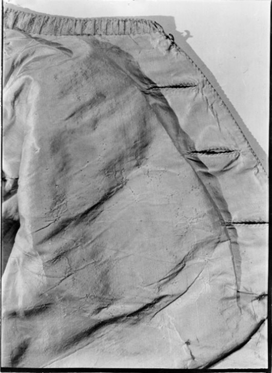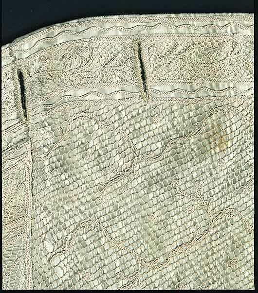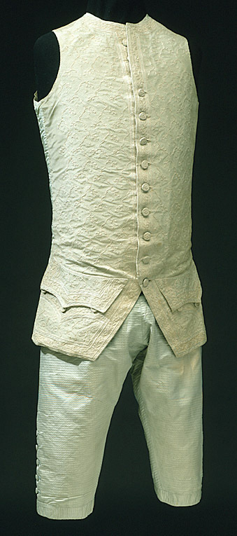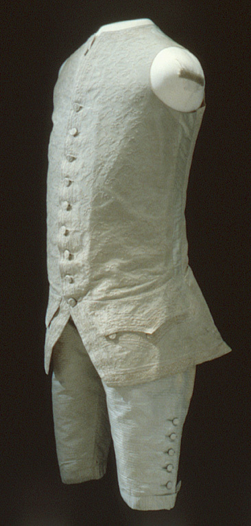 Väst i celadonfärgad siden där framstycket är helt överklätt med en tunn nätliknande spets. Modellen är figurnära med svagt rundat framkant som öppnar sig nedåt och kan knäppas i halsen. Sprund finns i sidan och mitt bak. Framstycket är längre än bak och skörten mycket kraftigt snedställda bakåt. Tyget är en varprips utom ett parti i sidan som är enklare grön taft. I sidan på framstycket är infällt en remsa i grönt enklare siden utan spetsöverklädnad. Halsen har en halsförstärkning som troligen funnits från början Västen har 18 knappar (12 mm). 12 knappar sitter längs med framkanten och 9 knapphål. Knapphålen är sydda rakt igenom spetsen. Knapphålen sitter från ficklockets höjd och uppåt med 55 mm mellanrum till 180 mm från halsen. Den översta delen saknar knapphål mn knappar finns ända upp. På framstyckets skört sitter spetsklädda ficklock med tre knappar halvvägs under locken, knapphål saknas. Dessa knappar gick inte att knäppa. Ficköppningen under locken är halvmånformad. I ficklocken finns en styvnad, (pappersljud om man vickar på locken) Framstycket är helt klätt med en nätliknande sydd spets som fått sin dekor av tambursöm. Den bildar ett mönster med uppåtriktade blomsterslingor som ett helt rutnät i rokokomönster. Ryggen är i samma taft som fodret. Foder i vitt eller benvitt siden. Enkla bandöglor sitter som stora hällor eller stroppar i sidsömmarna. de är troligen till att fästa om byxornas sidknapp, för att plaggen ska sitta stadigare på plats. Äldsta inventarieuppgift från 1790 se nnr 21445