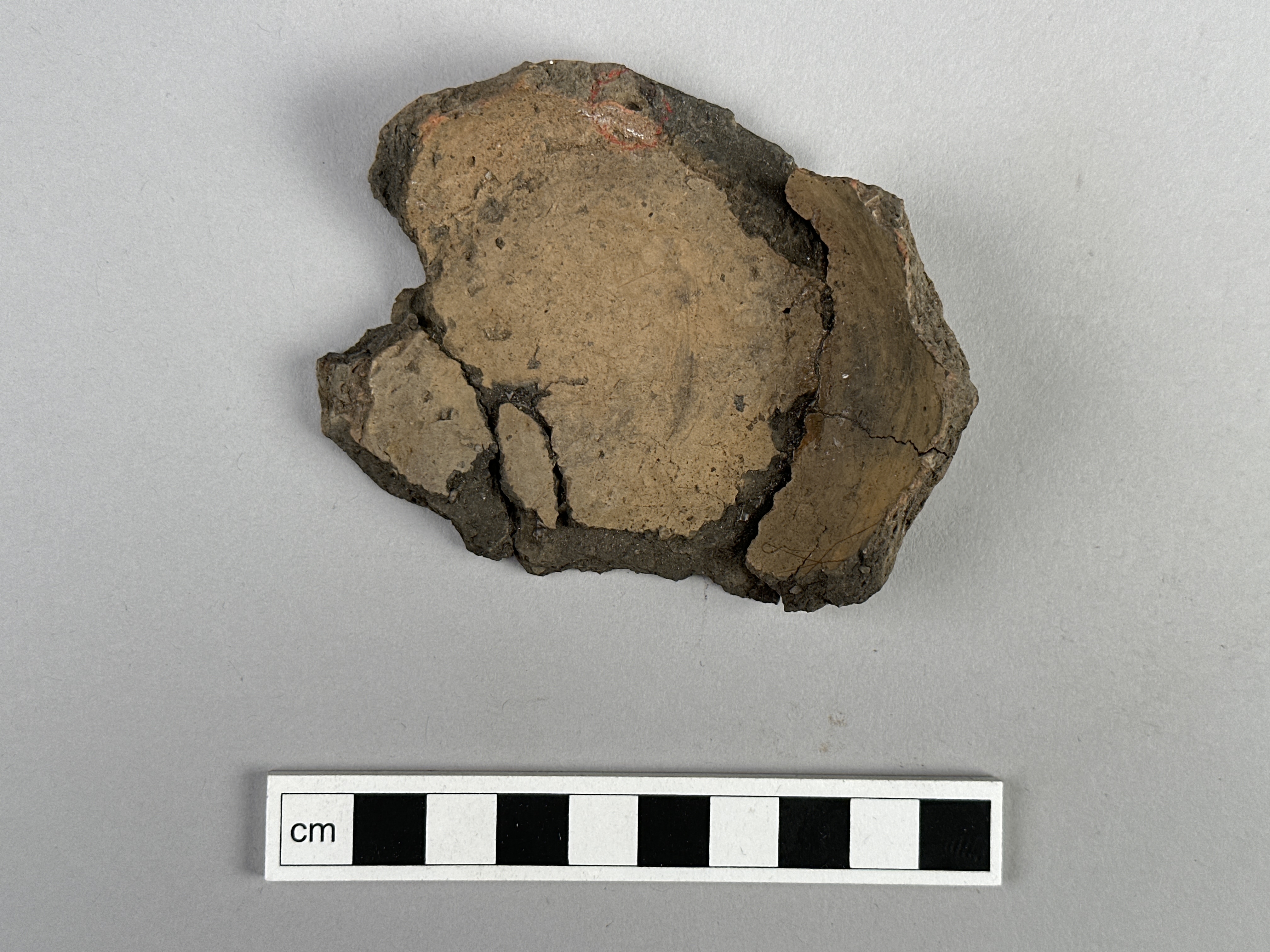 Fragment av kärl med fast magring. Troligen ett lock till lerkärl? Brun, slät yta.