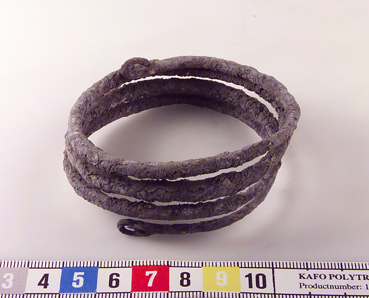 Rundad ten lagd i tre och ett halvt varv. Ändarna tillbakaböjda till öglor. Spiralornerad? Kraftigt skadat ytskikt.
