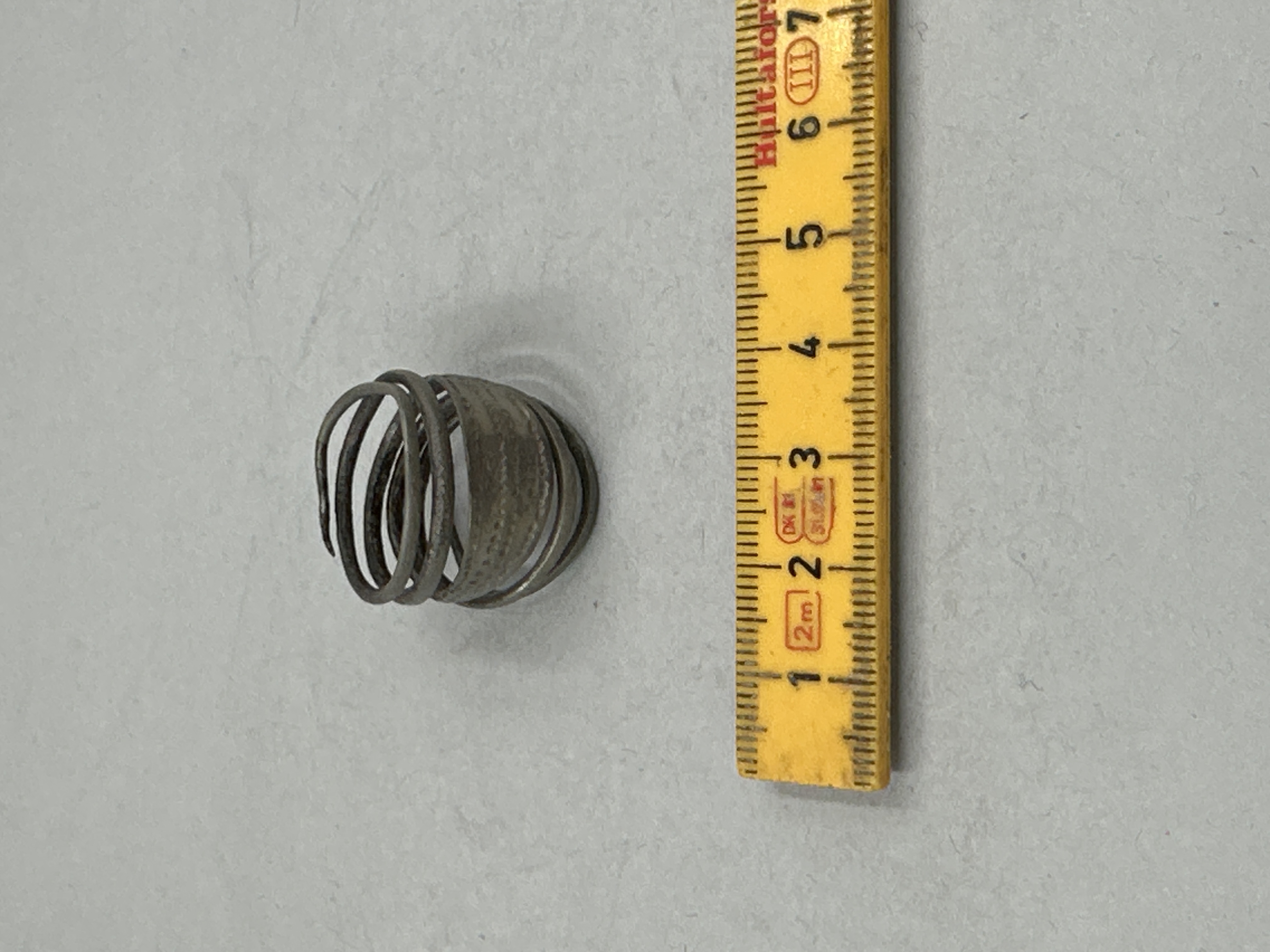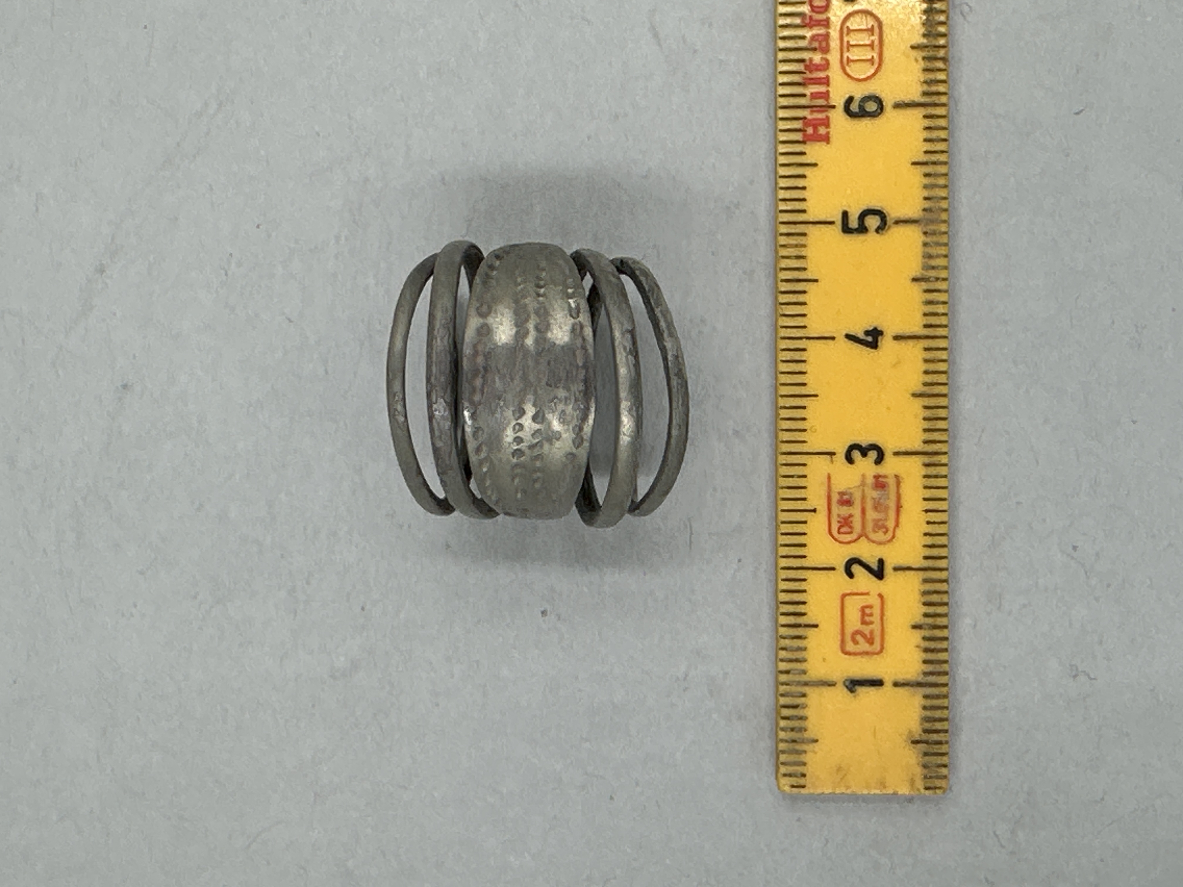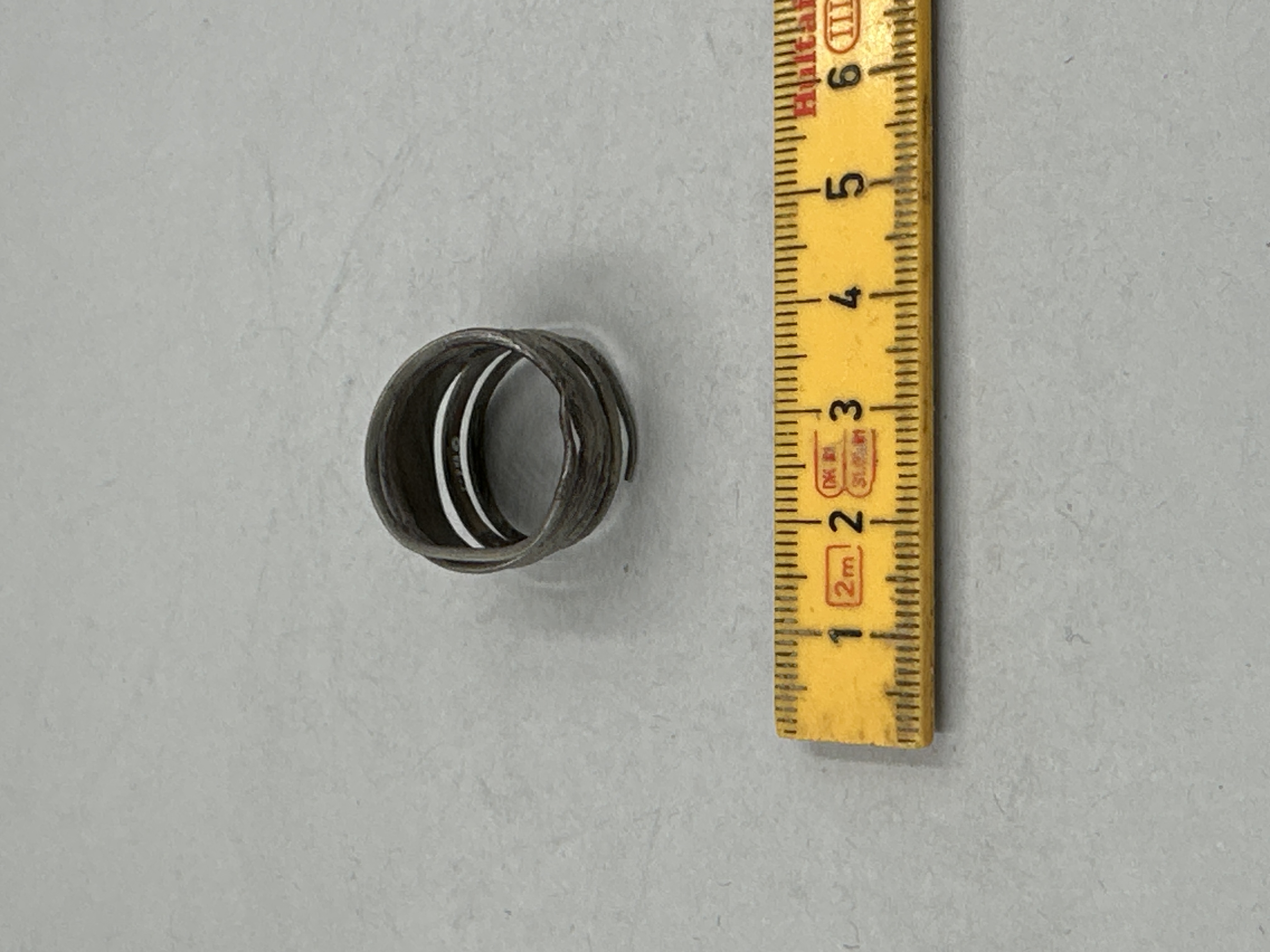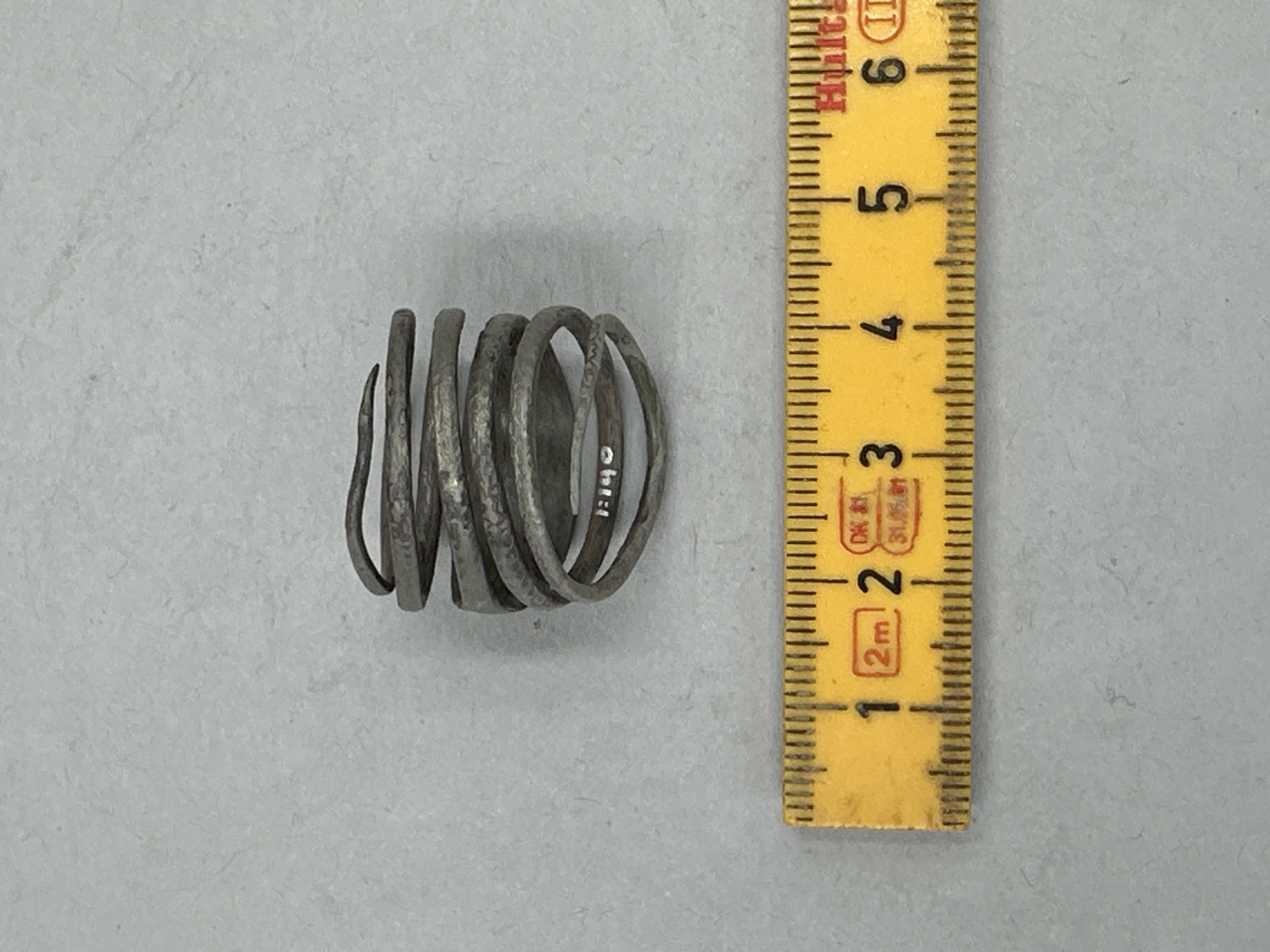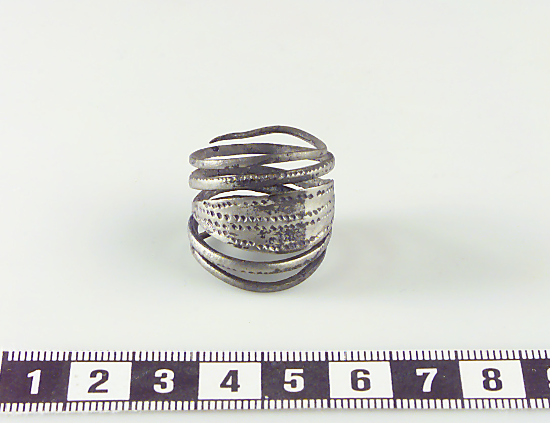 Spirallagd i fem varv. Mittdelen utsmidd till oval platta ornerad med kantföljande punktrader samt två längsgående punktrader på mitten. Tenen i övrigt ornerad med punktrad.