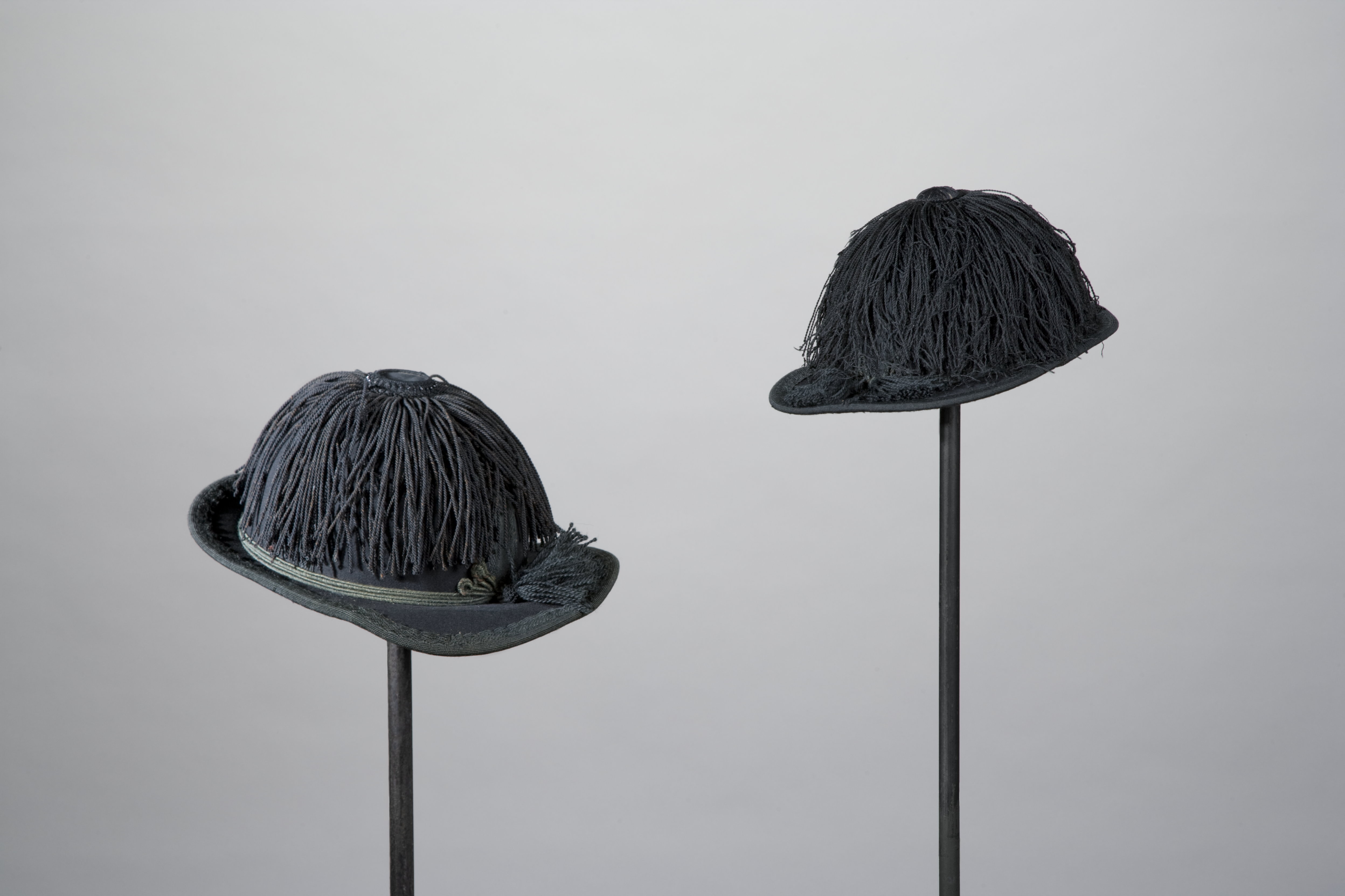 Svart mössa av kläde med brätte runtom som framtill bildar skärm. Mössan kantad med mönstervävda svarta ylleband. Mössband i form av beläggningssnöre, svart ylle, som framtill är knyten till rosett med tofsar. På hattkullen svarta fransar, fästa med en rund, välvd knapp, d: 33 mm, klädd med svart yllegarn. Foder av mörkbrunt appreterad bomull. Svettrem av mörkrött, rutpressat läder, b: 41 mm.