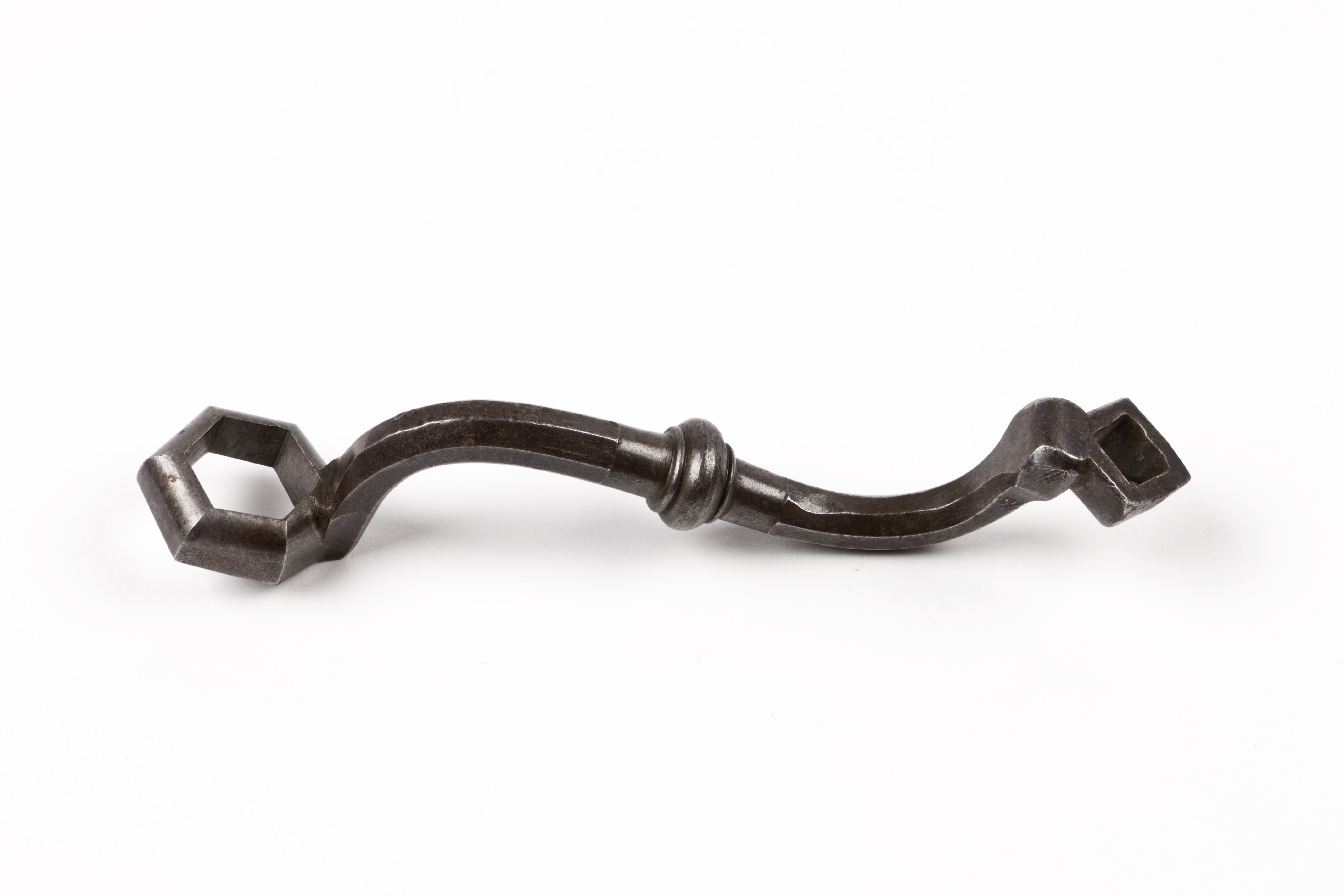 I ena änden för sexsidig mutter, diag 21 mm, i den andra för fyrsidig, diag 14 mm. S-formigt, fasat skaft med vulst på mitten.