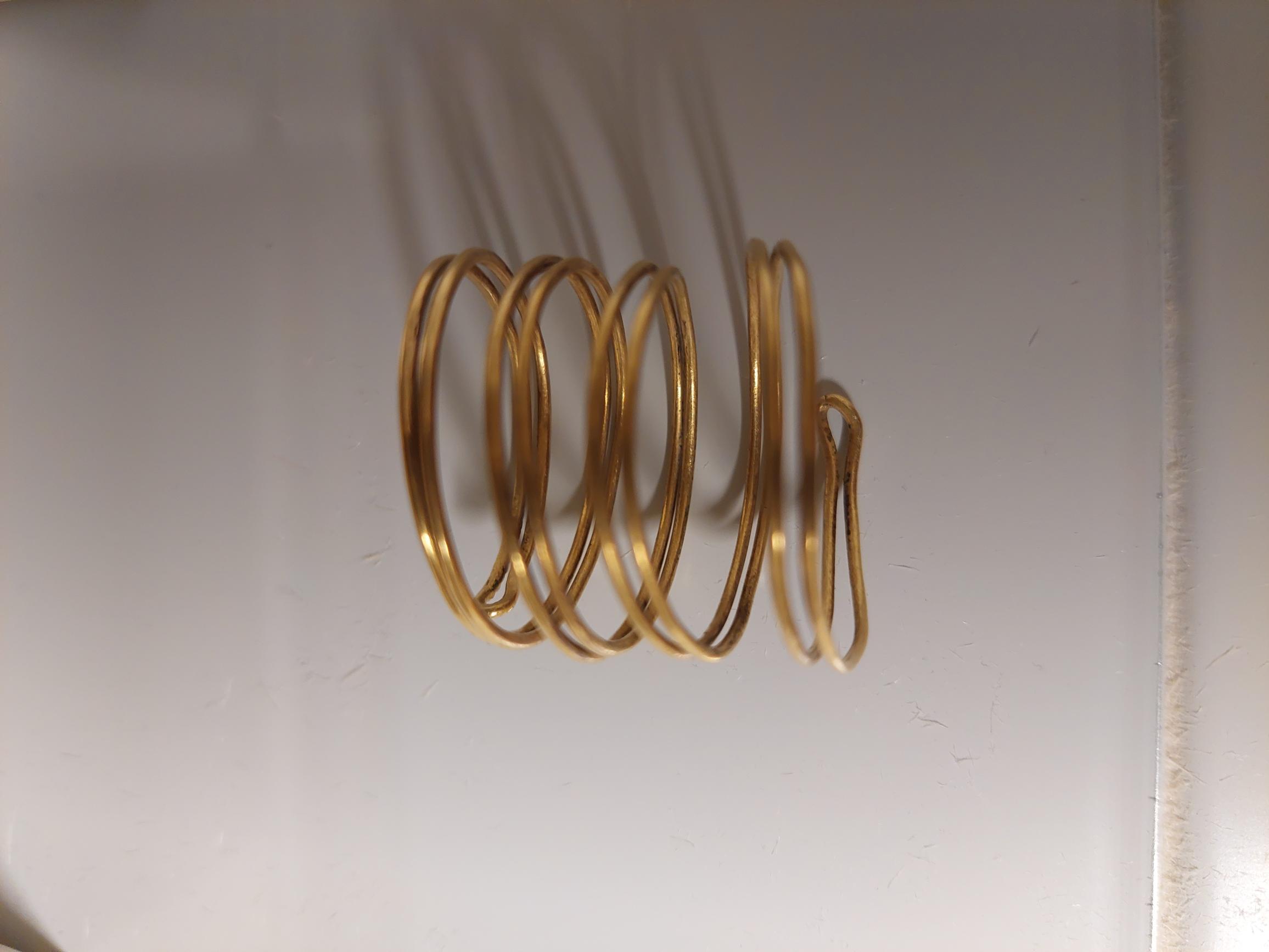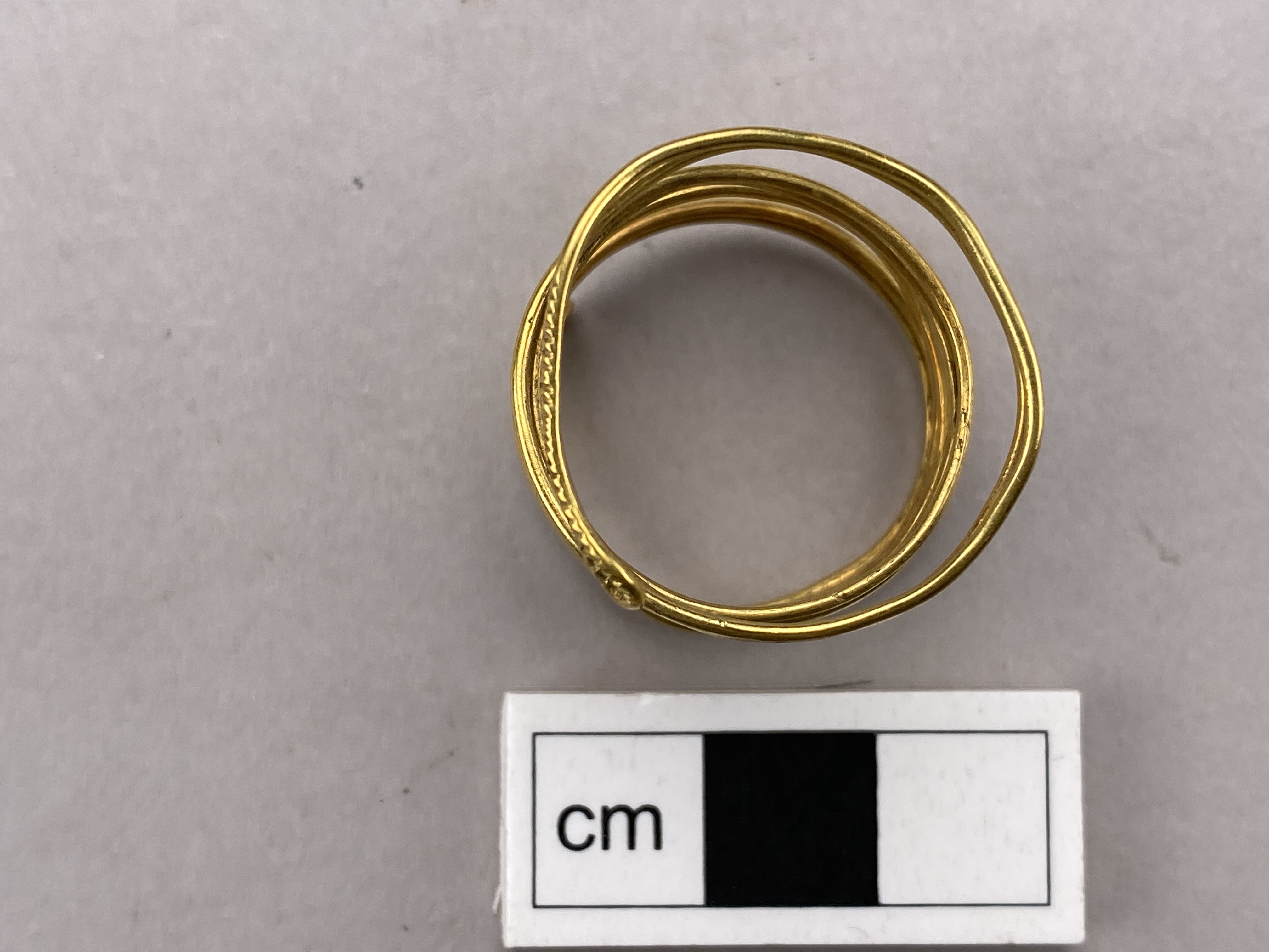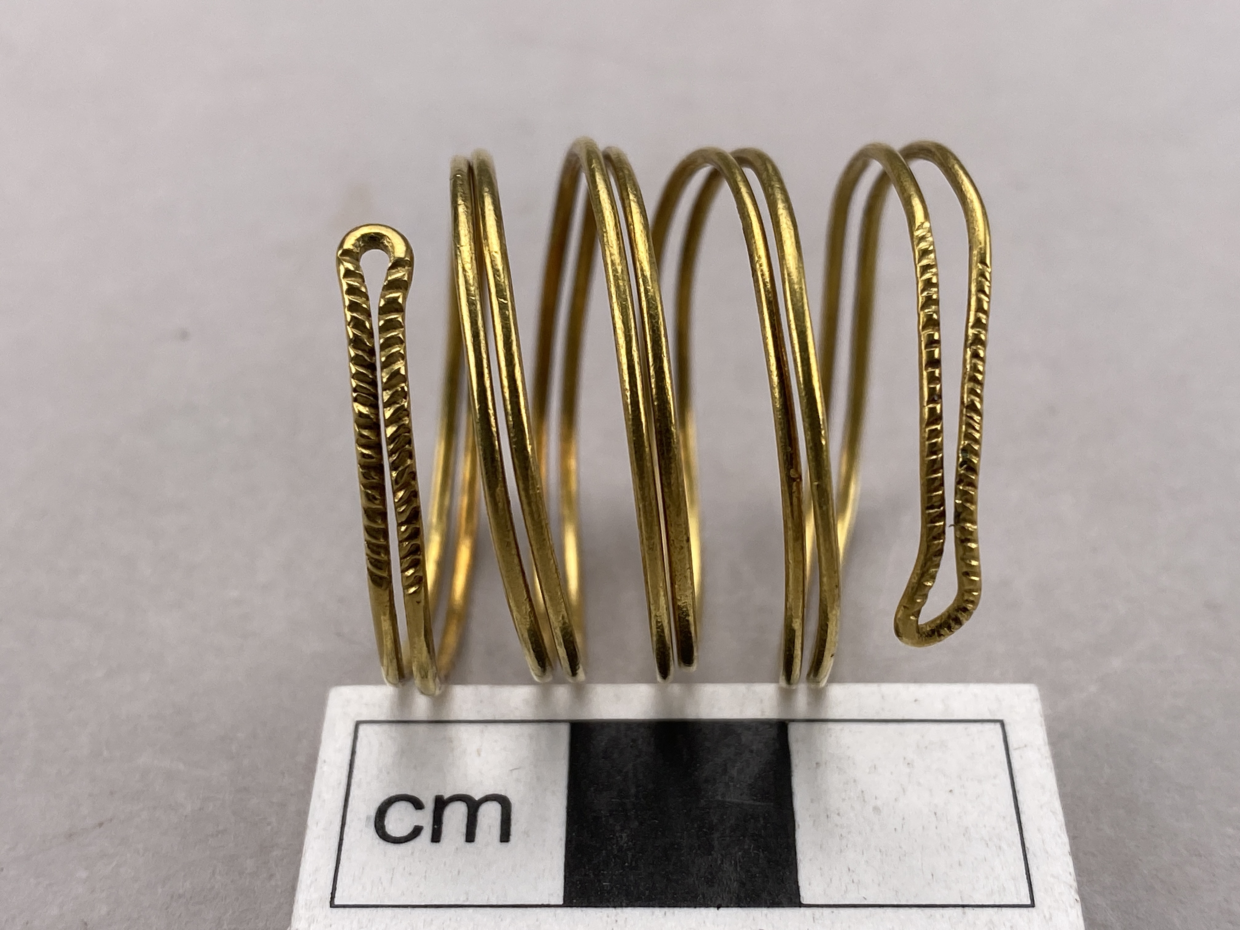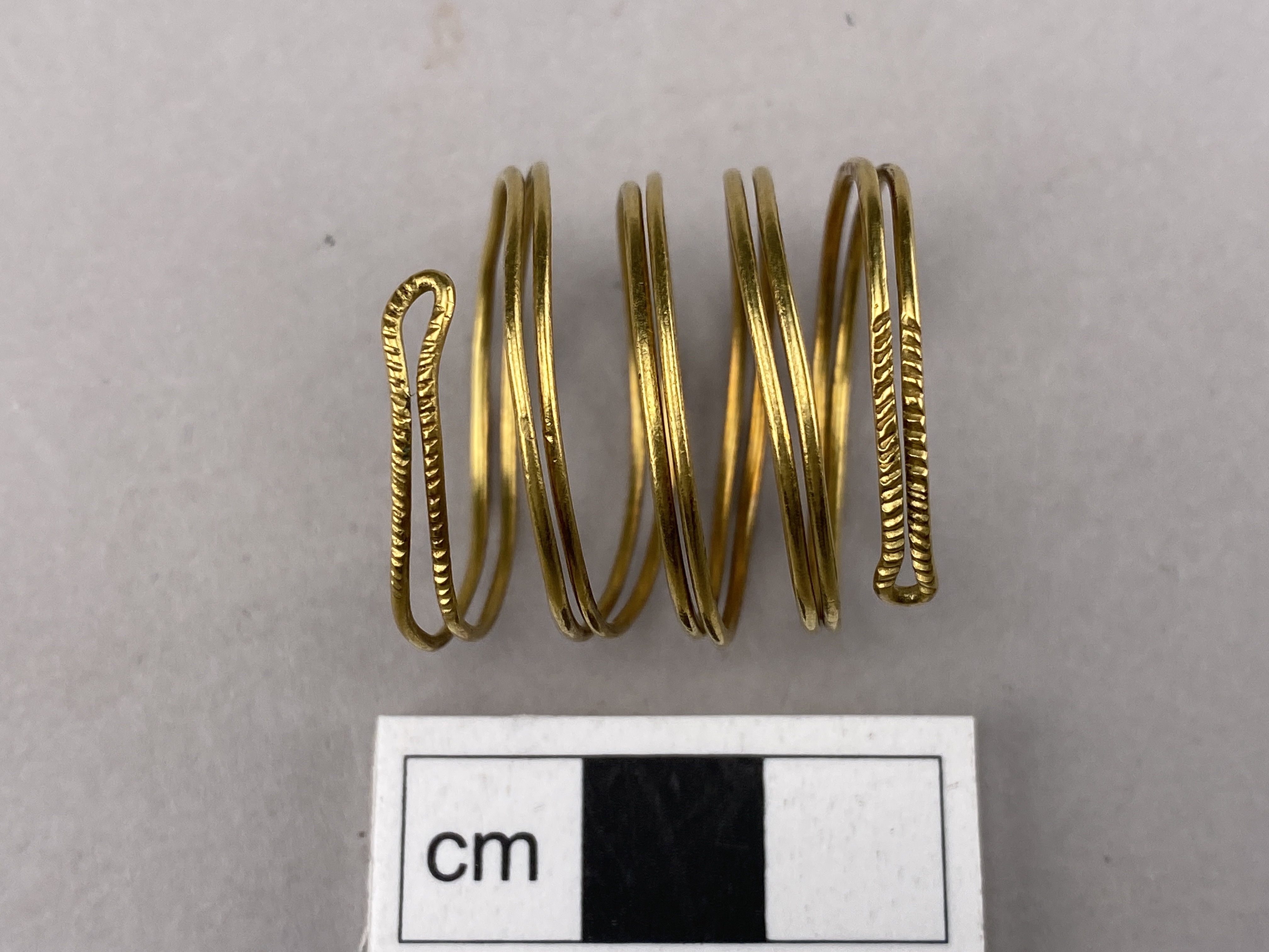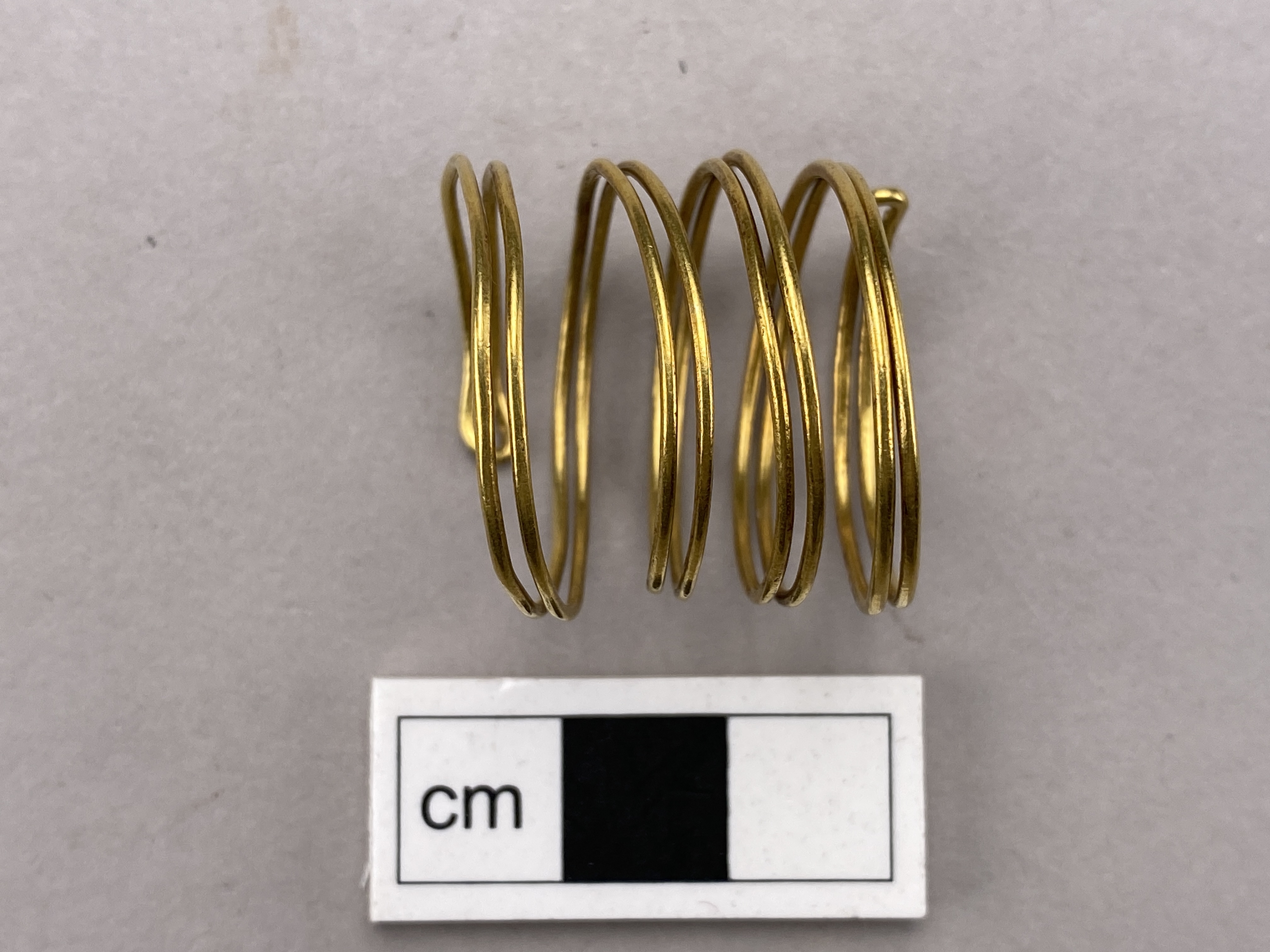 Spirallagd dubbell guldtråd med slutna ändar. Funnen tills med ytterligare en smalare guldspiral uppträdda på en bronshalsring med öppen undersida, vid grävning i en äng. jfr mm 1046. Den aktuella spiralen, är av något tjockare tråd med vinkelställda dekorinslag vid vikningarna. Inga synliga ändar utan tråden är i ett stycke