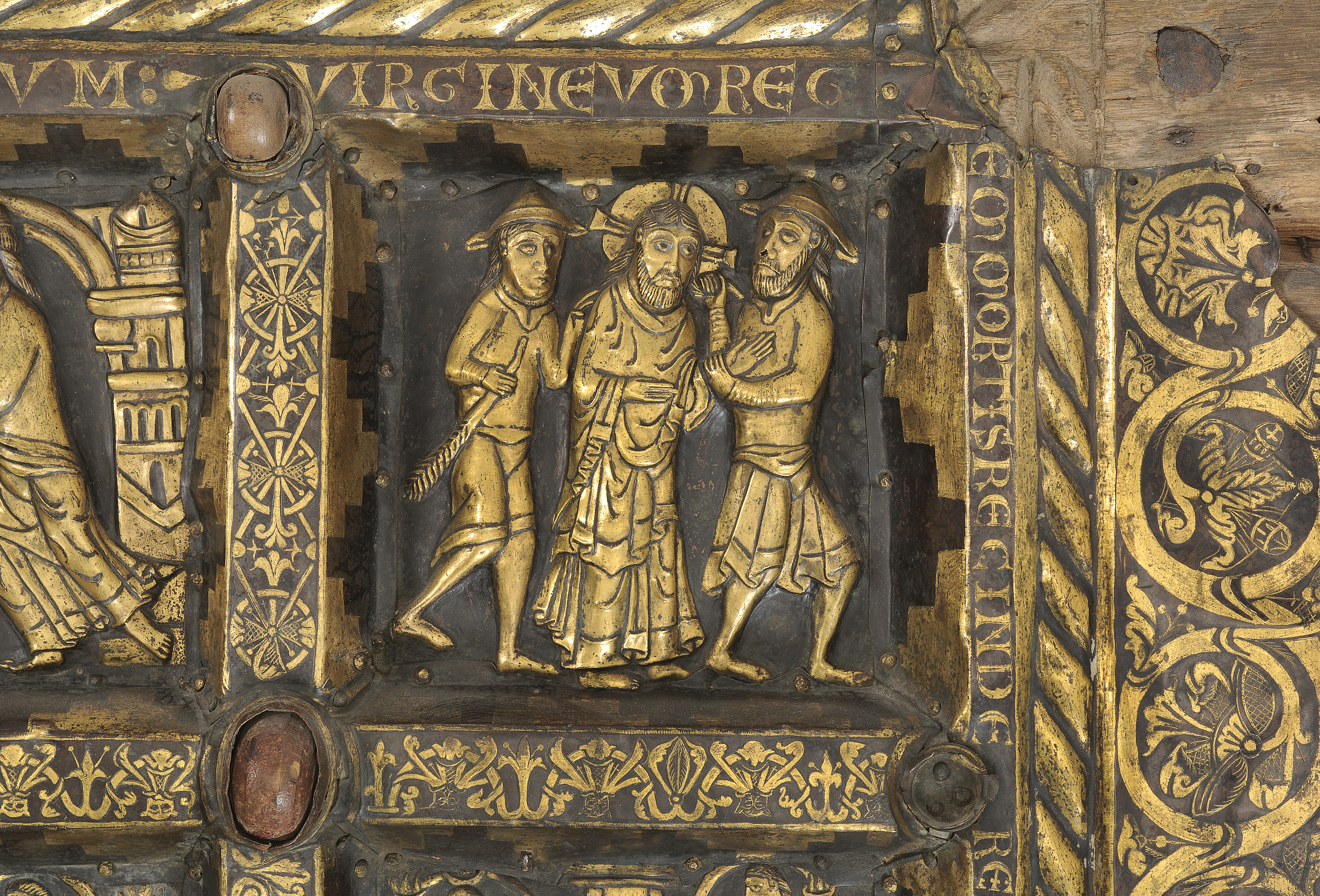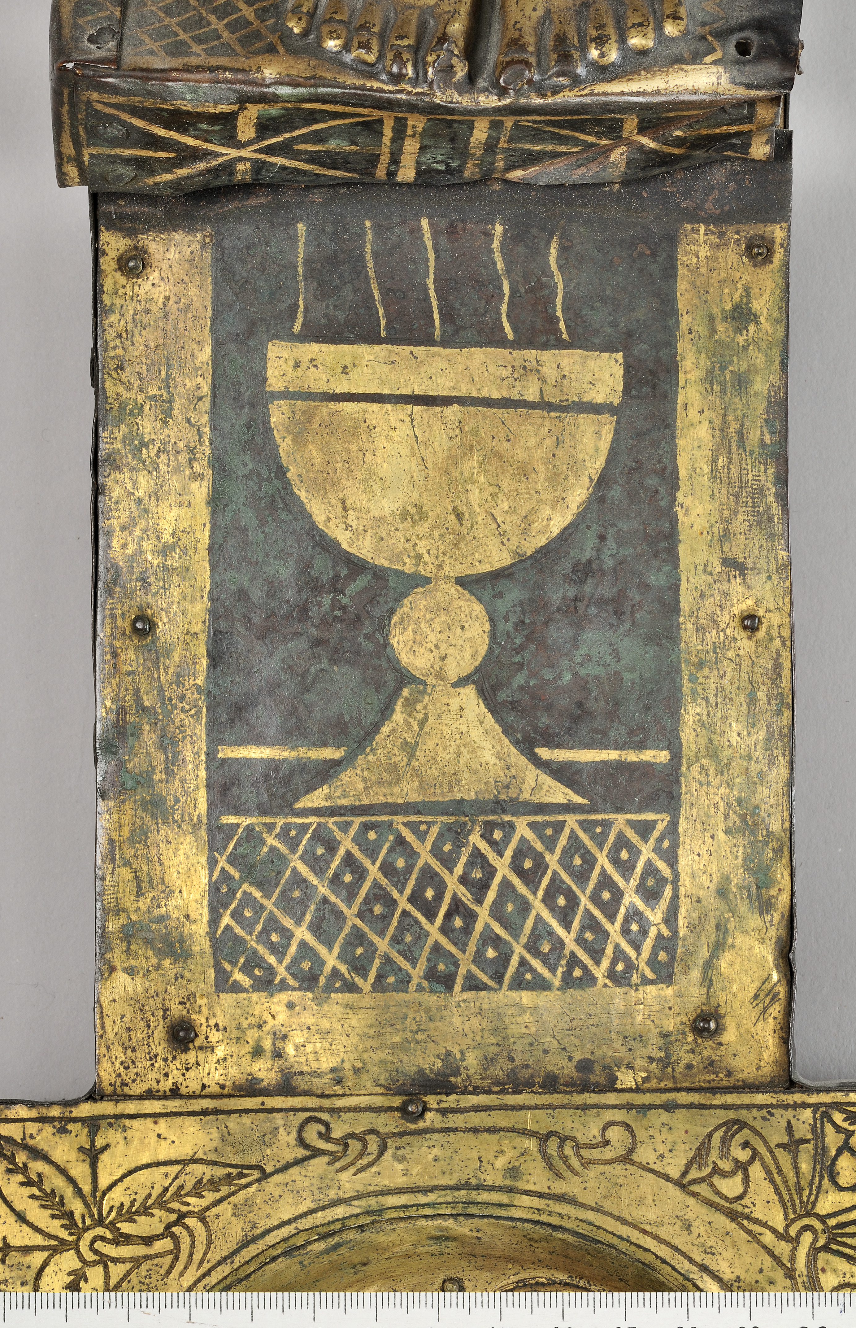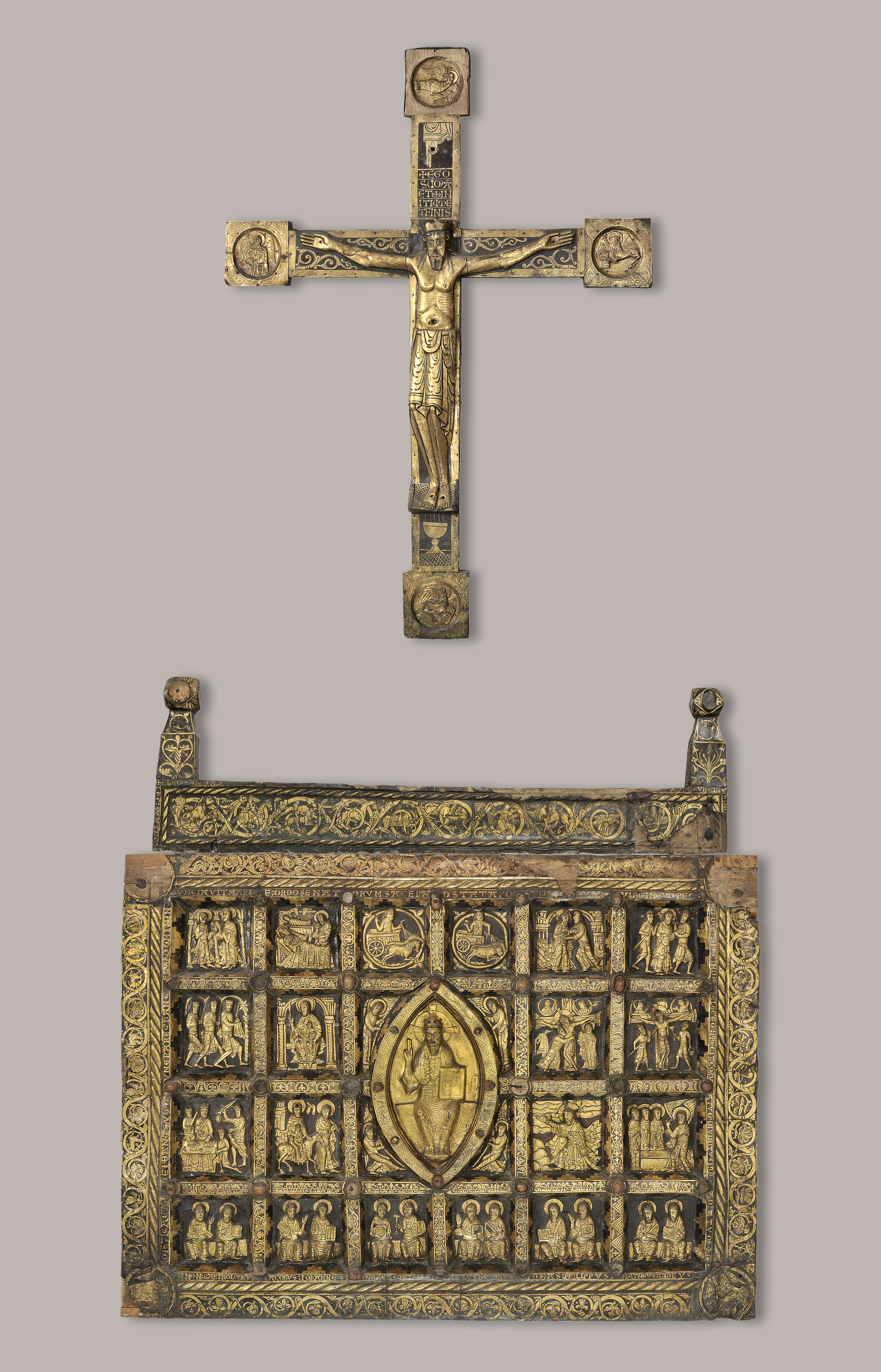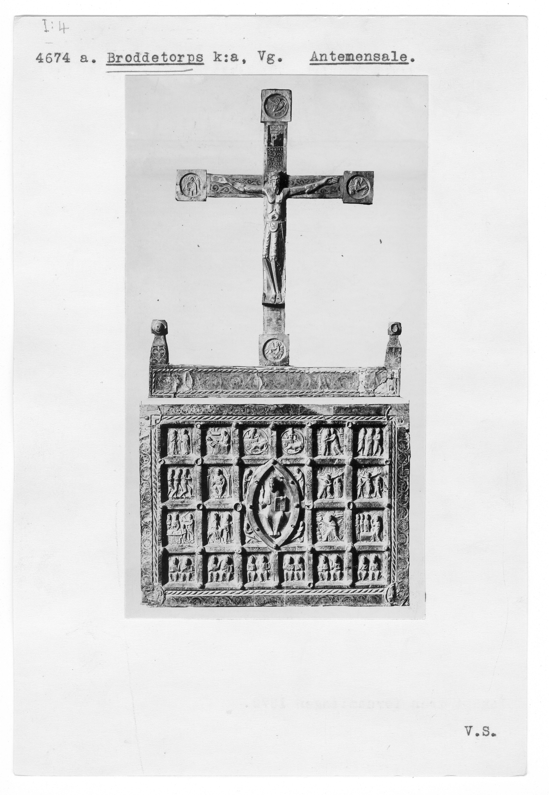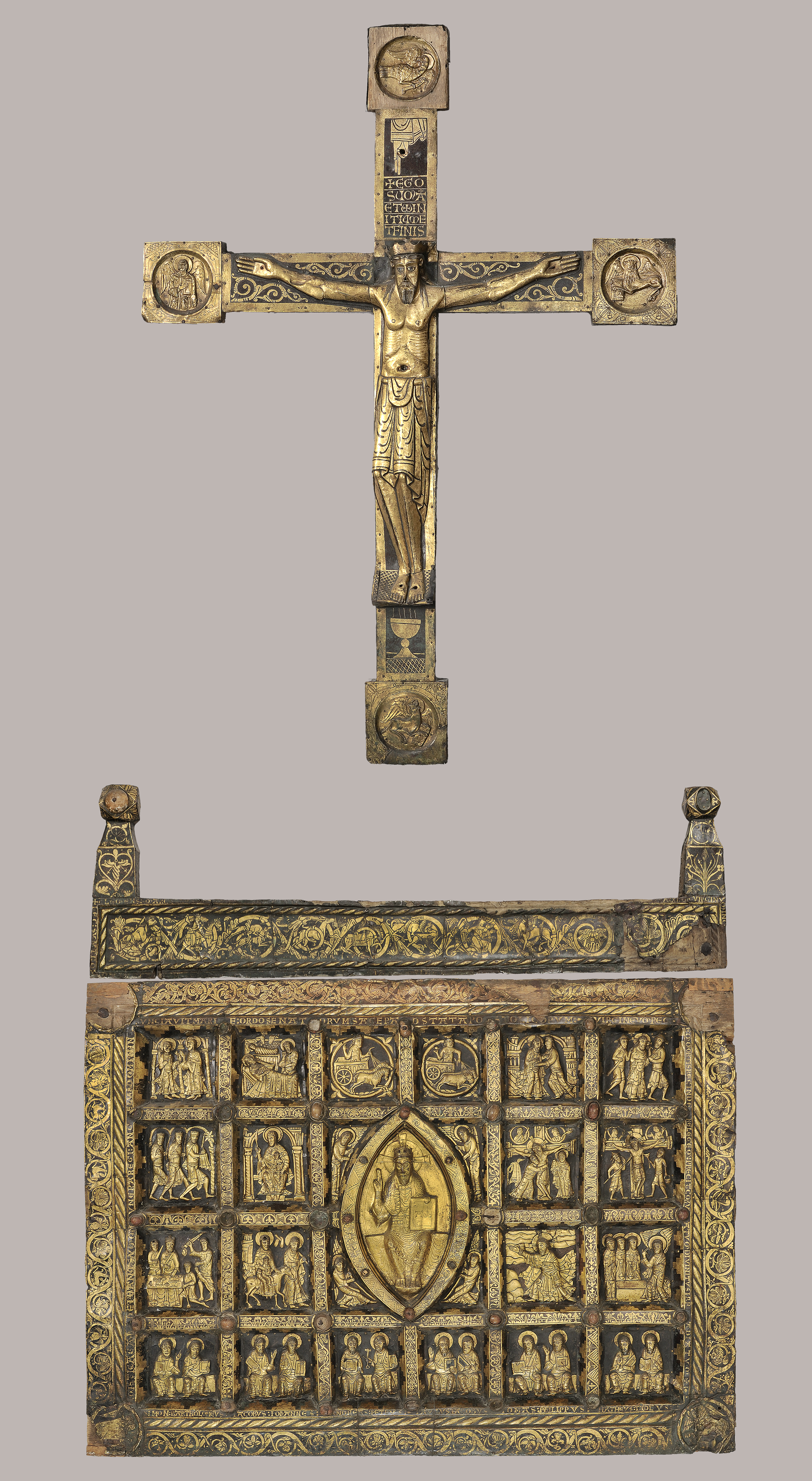 Antemensale av driven, förgylld koppar på träkärna samt tillhörande krucifix och superfrontale i samma teknik.