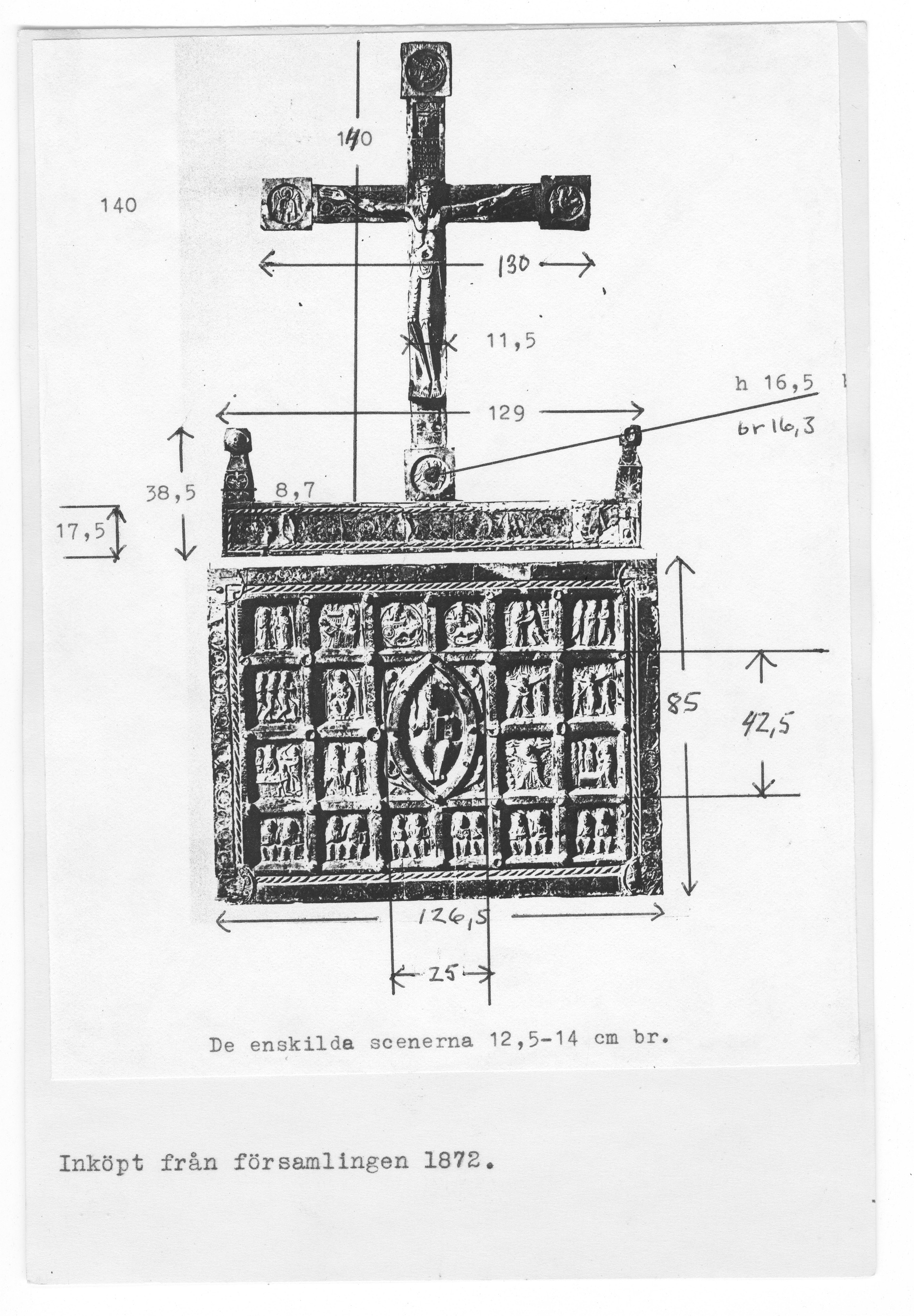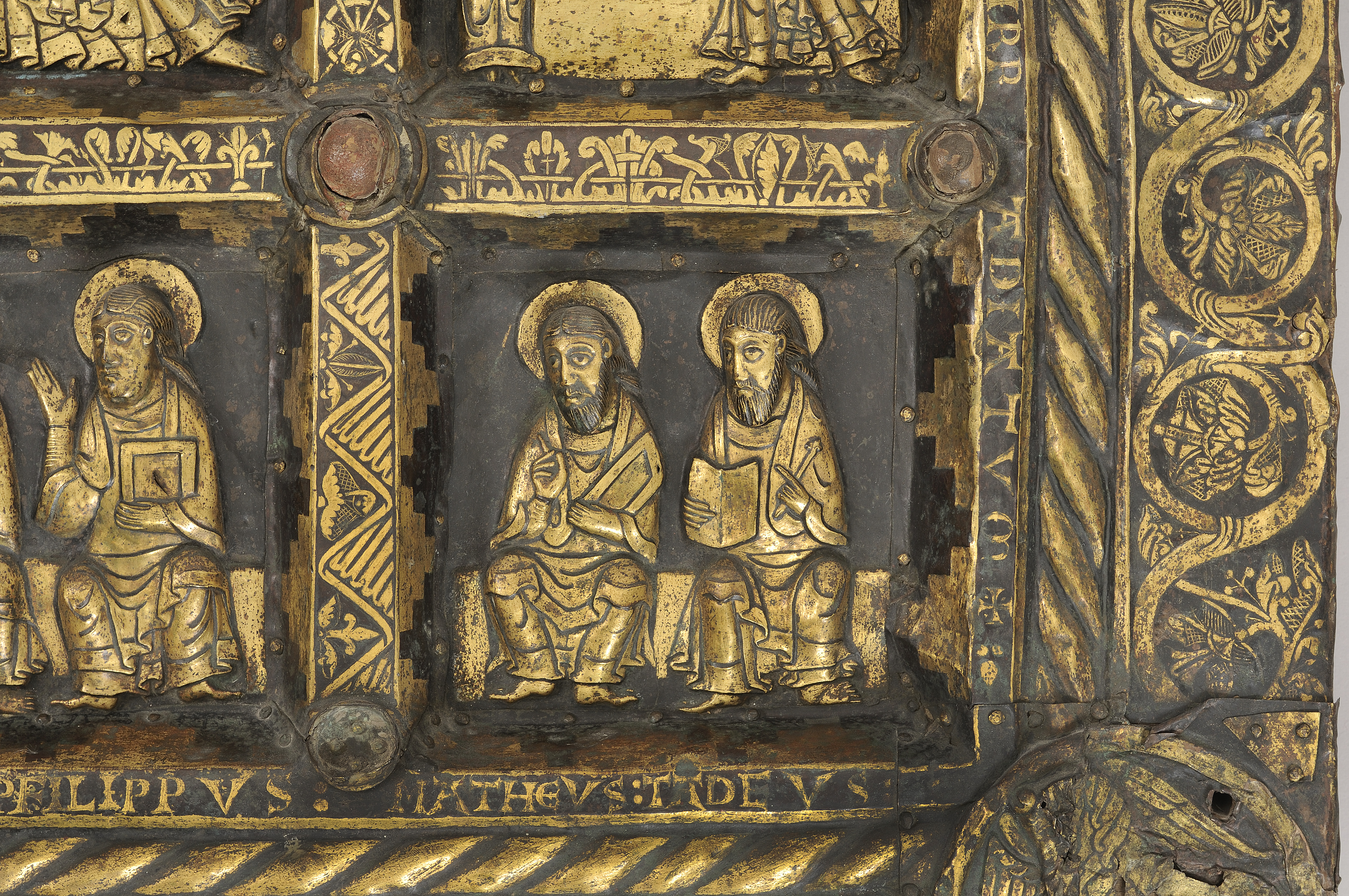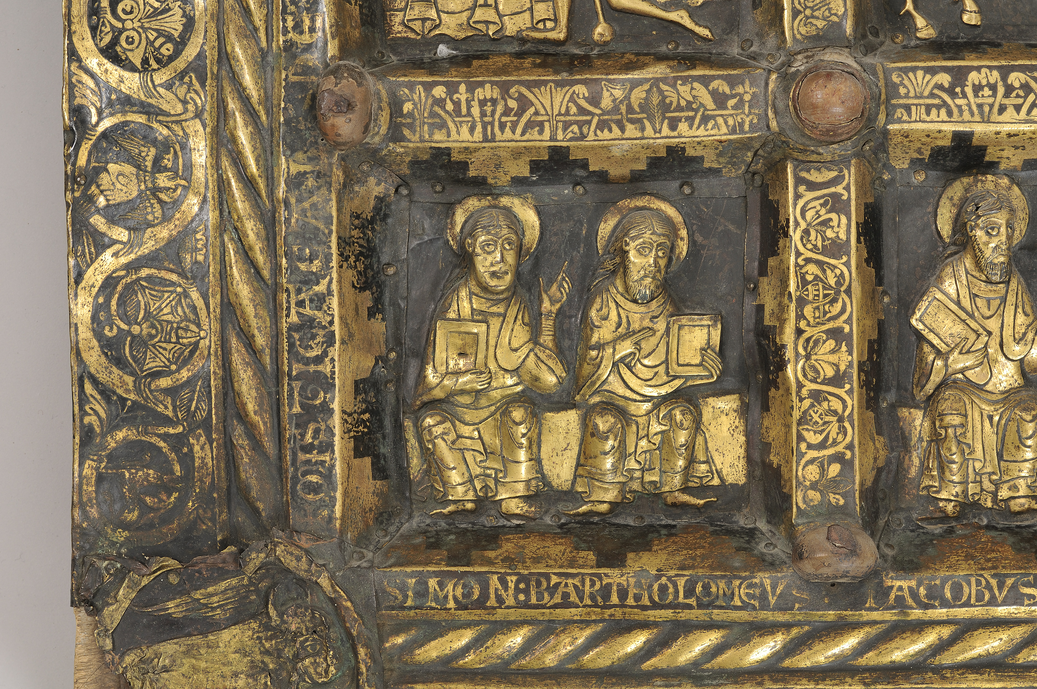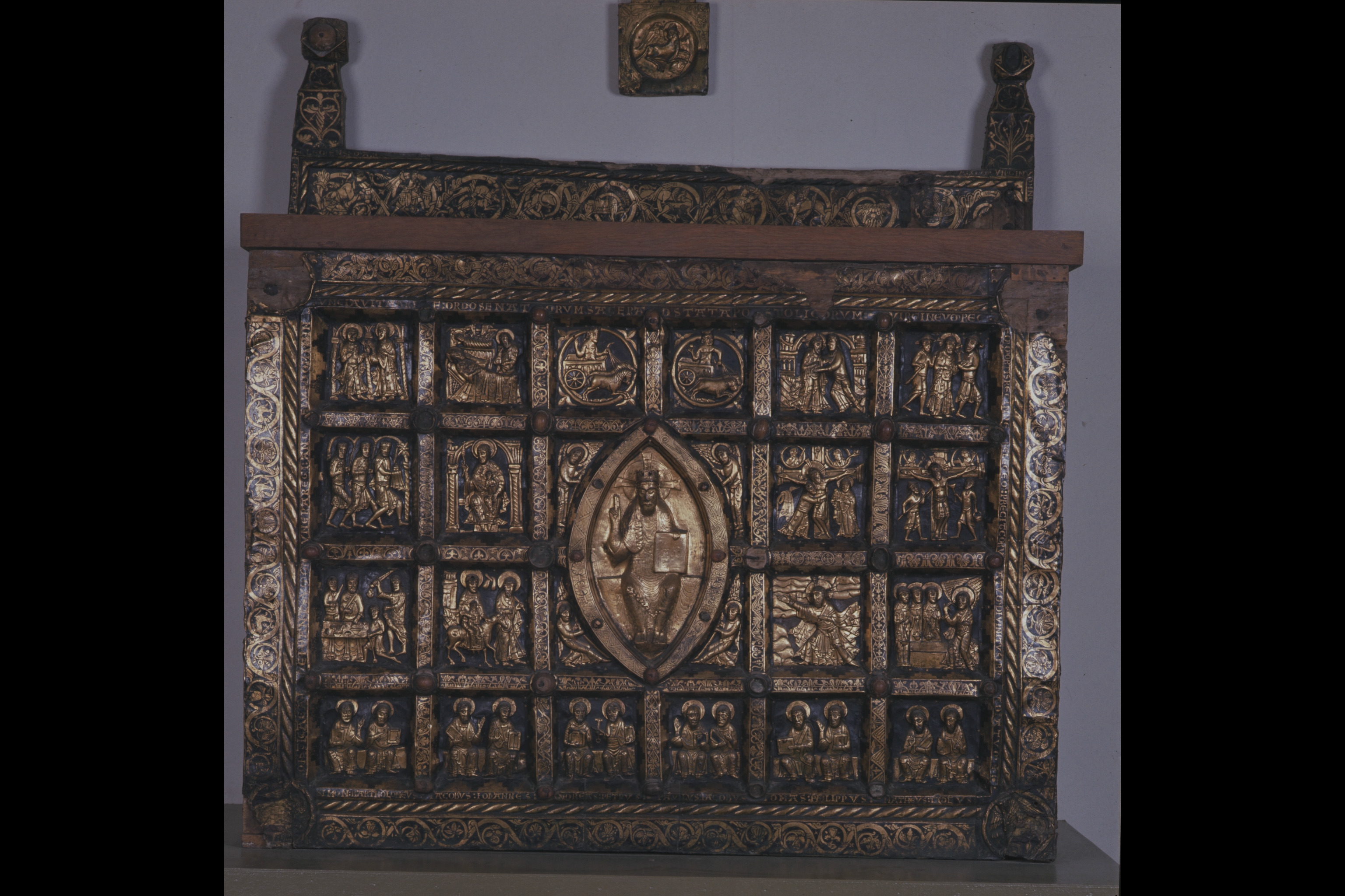 Antemensale av driven, förgylld koppar på träkärna samt tillhörande krucifix och superfrontale i samma teknik.