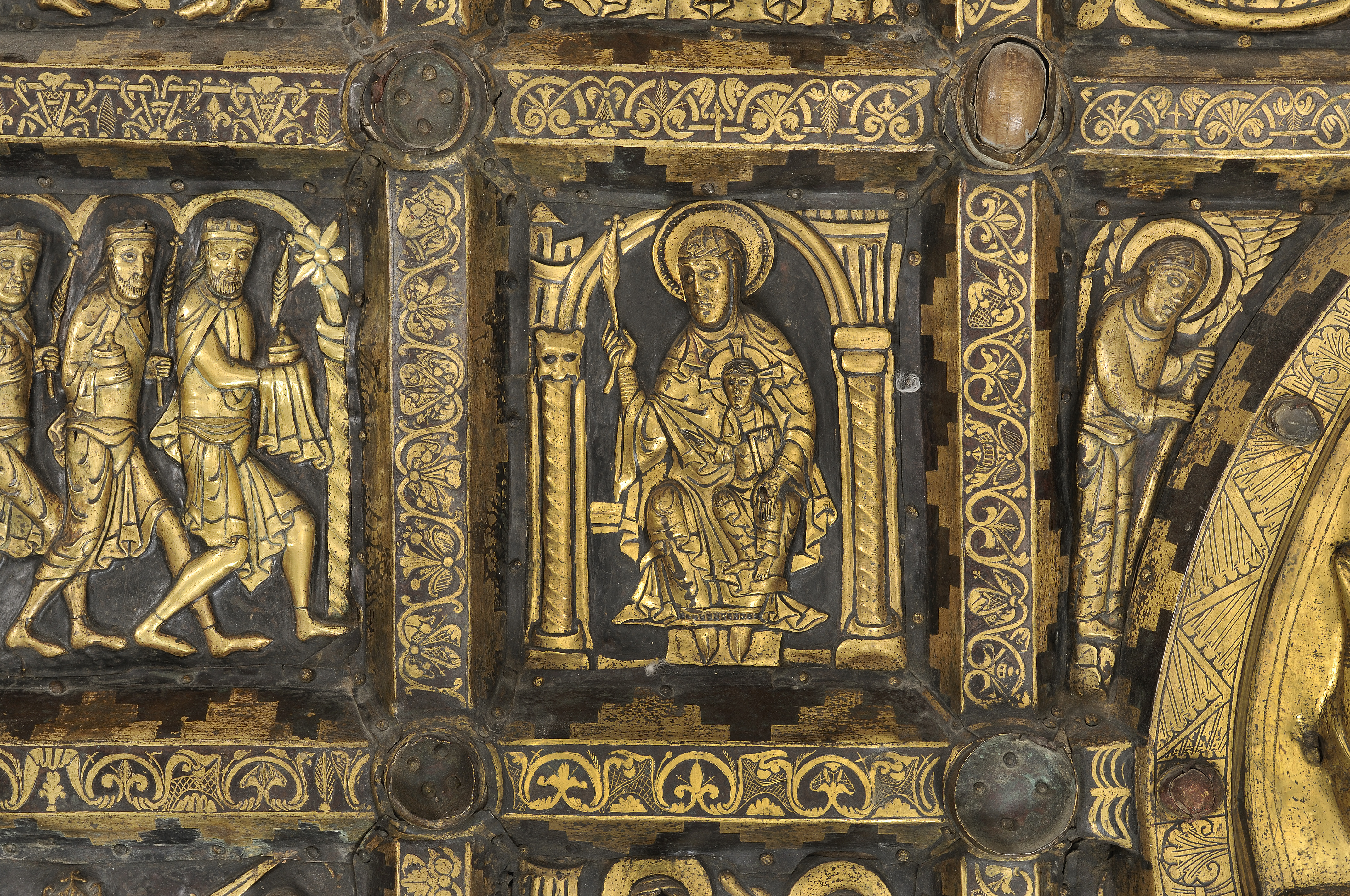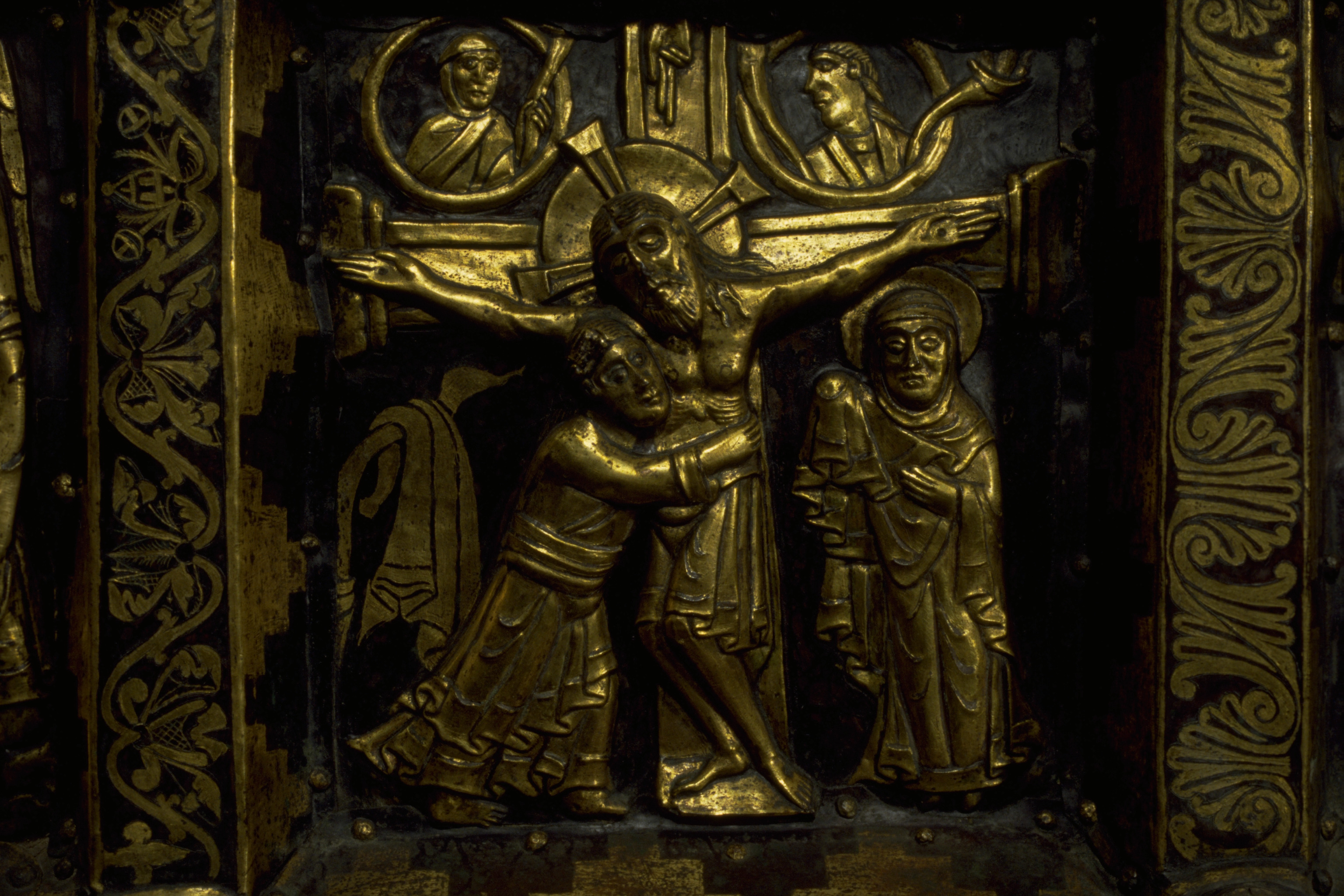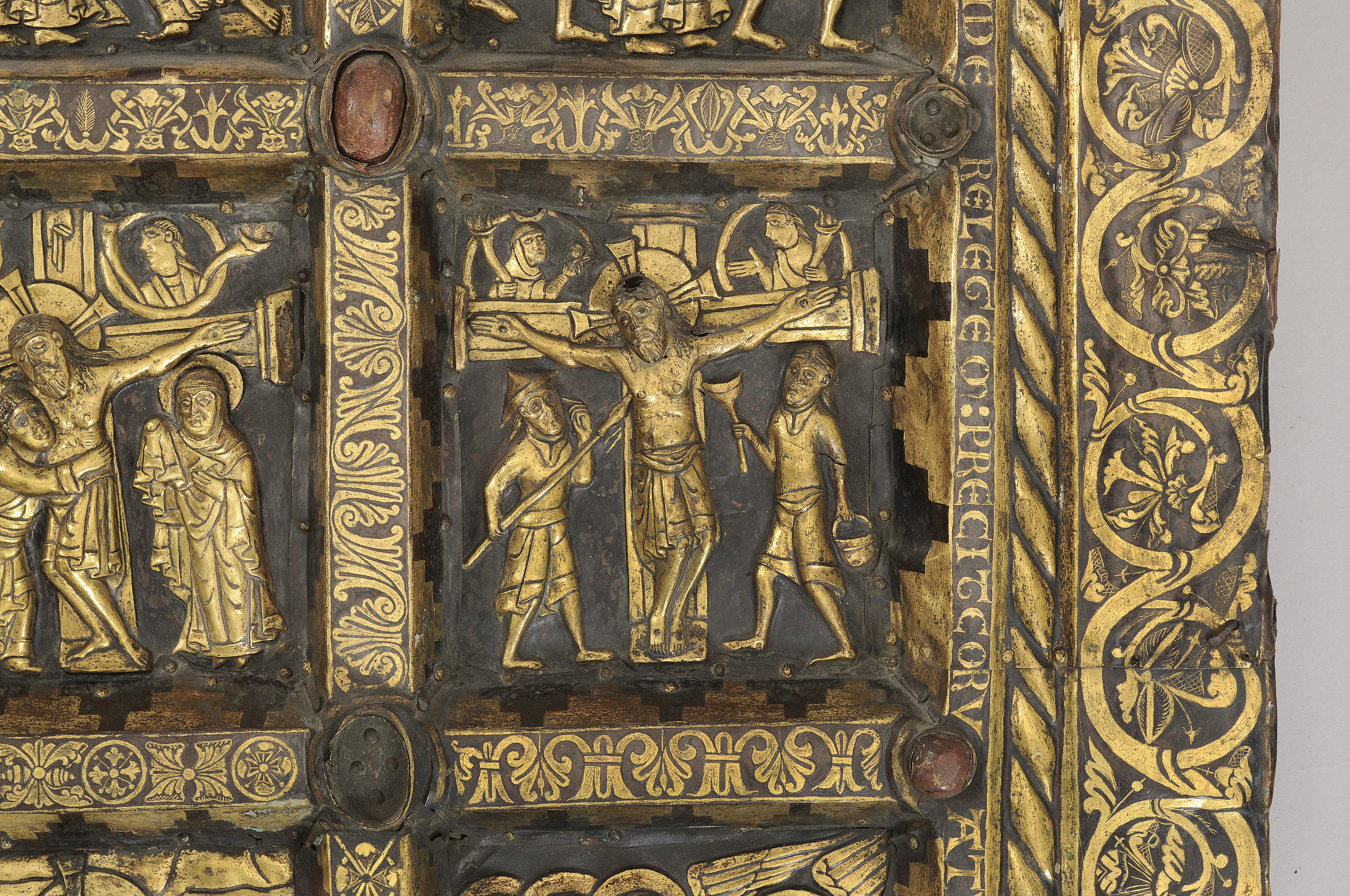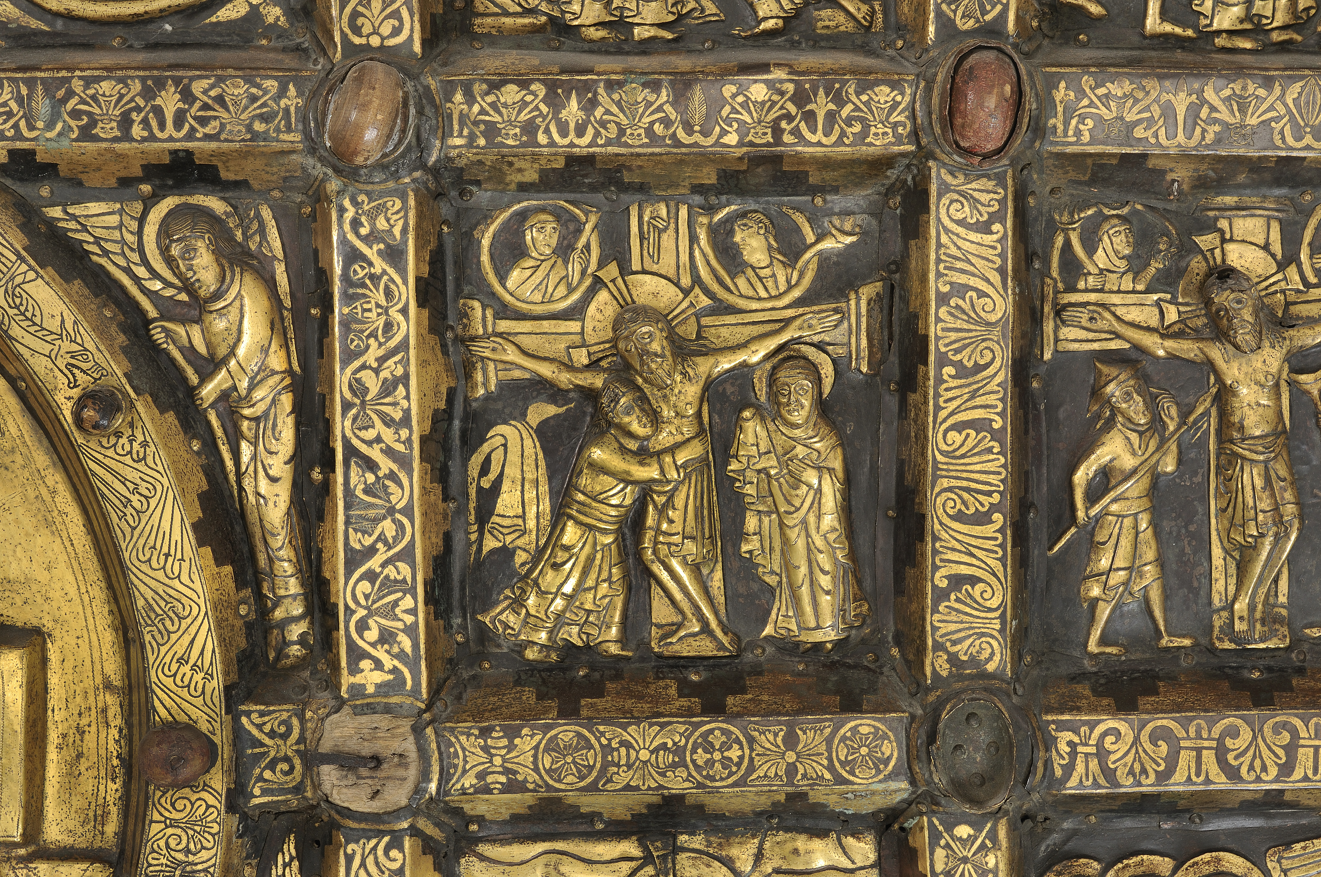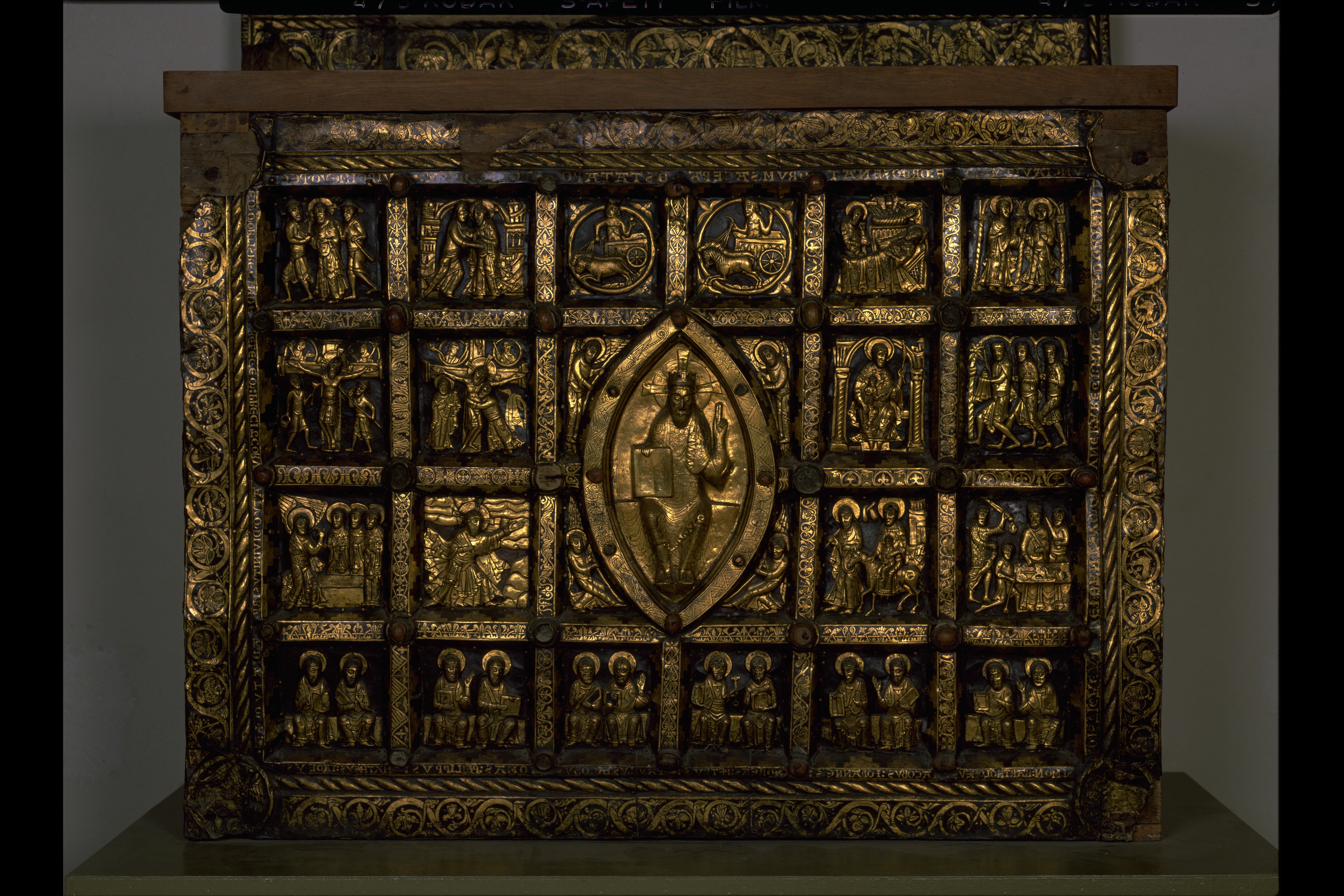 Antemensale av driven, förgylld koppar på träkärna samt tillhörande krucifix och superfrontale i samma teknik.