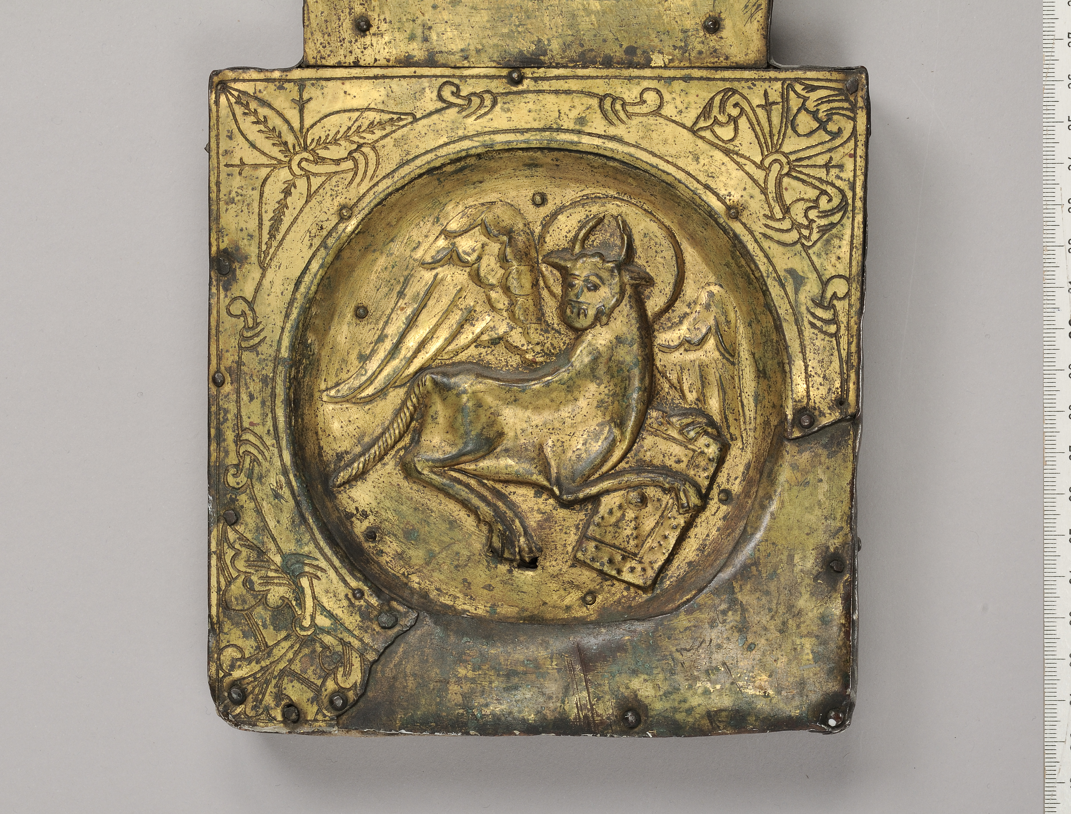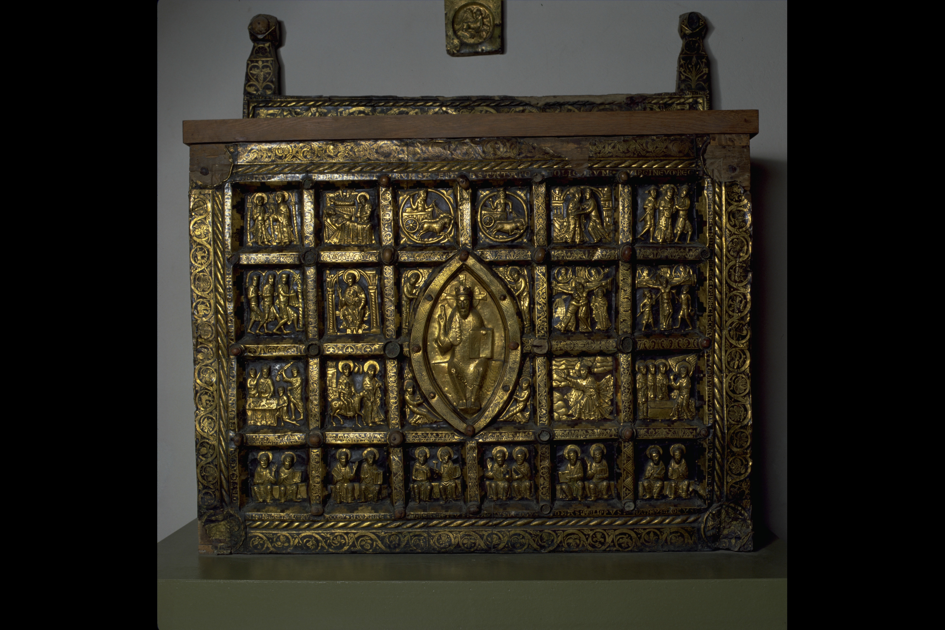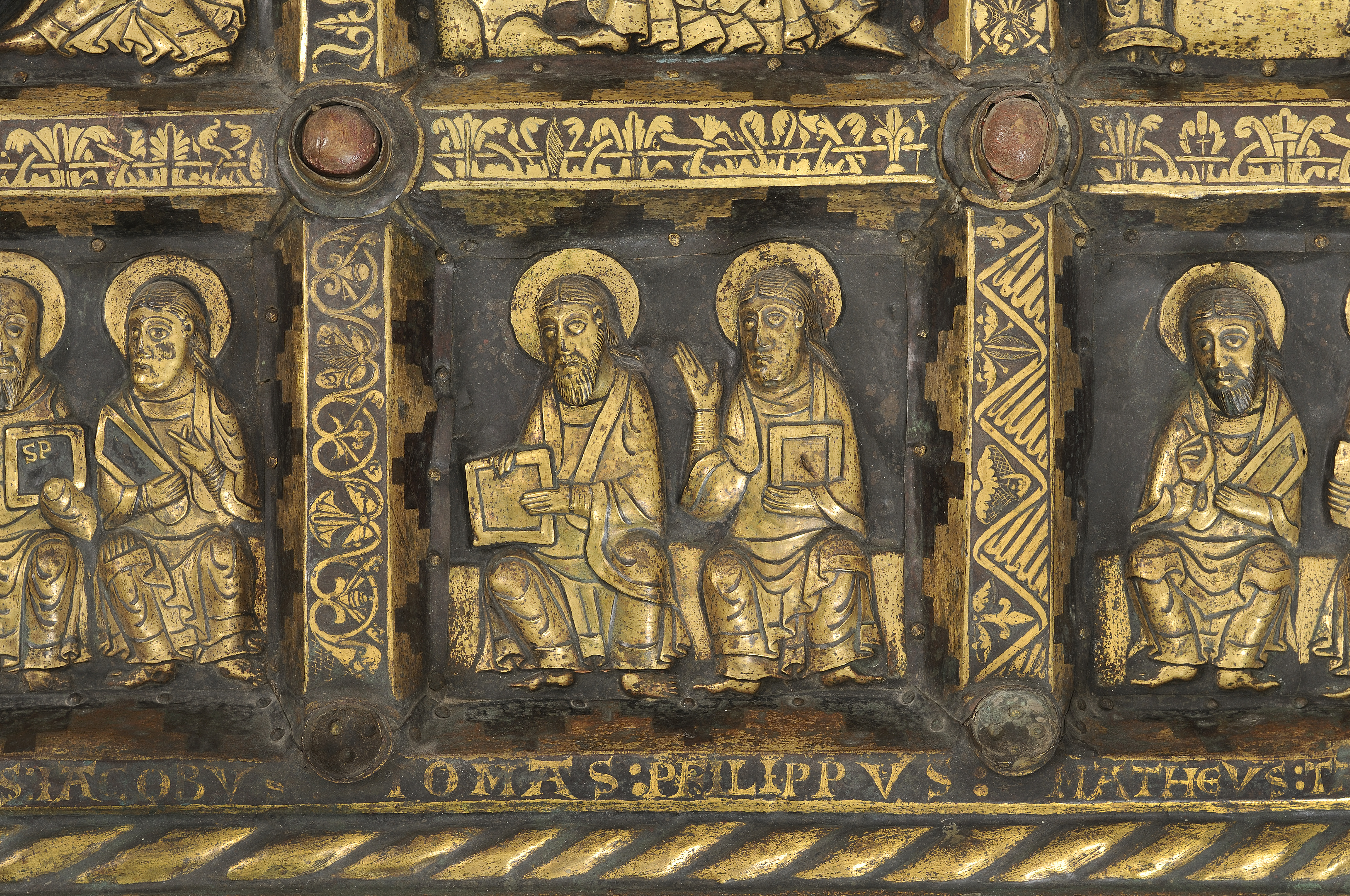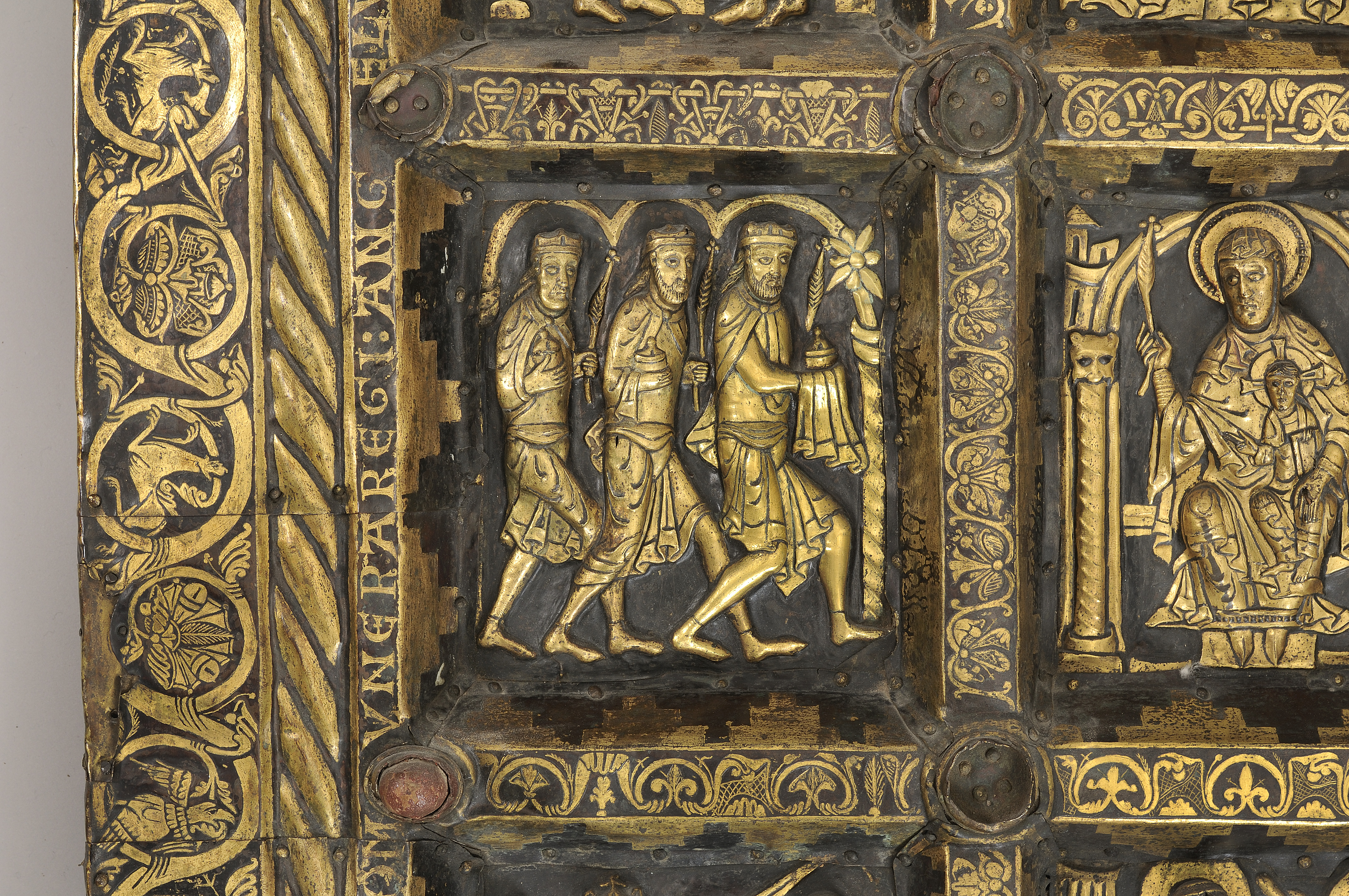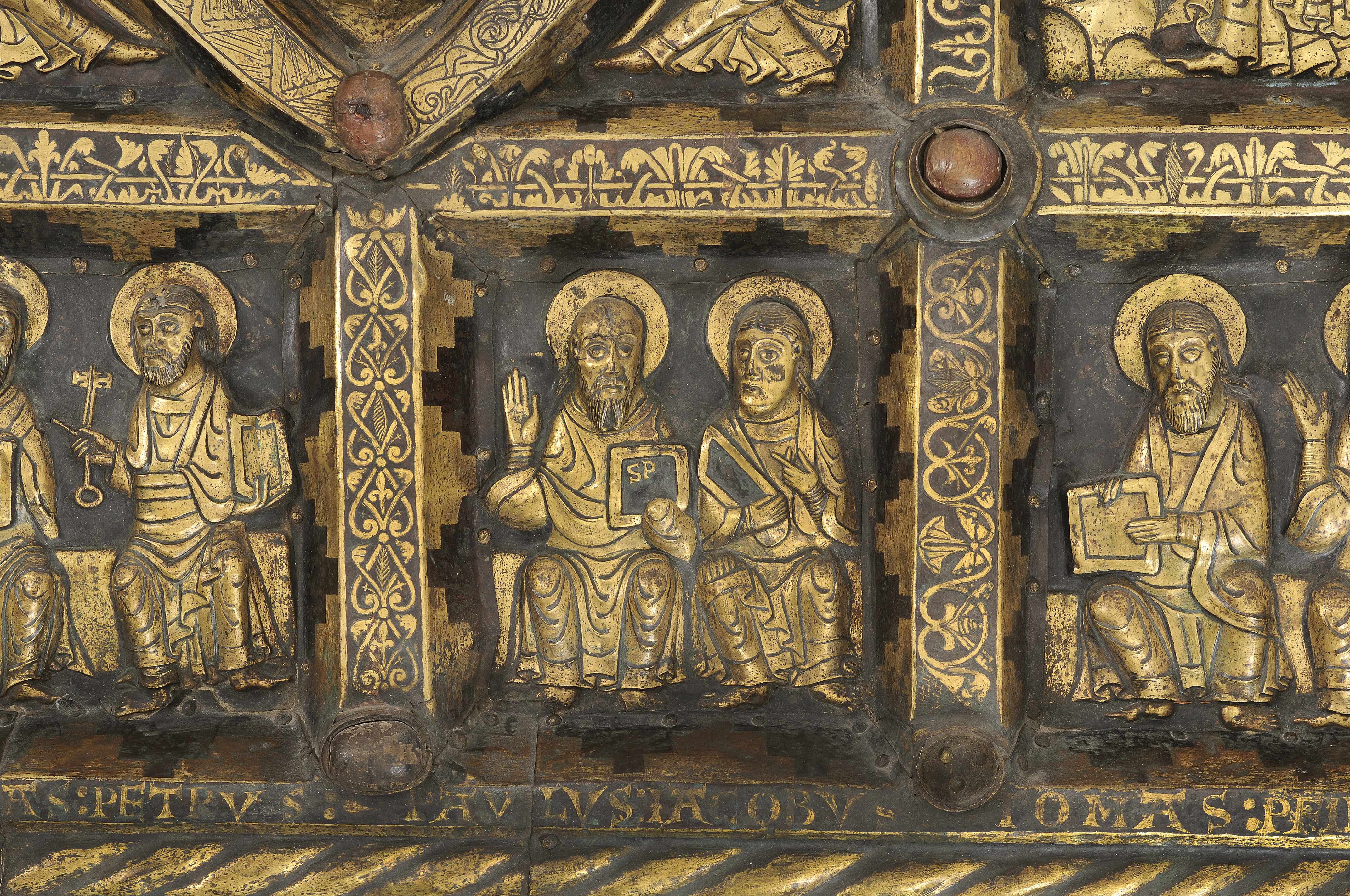 Antemensale av driven, förgylld koppar på träkärna samt tillhörande krucifix och superfrontale i samma teknik.