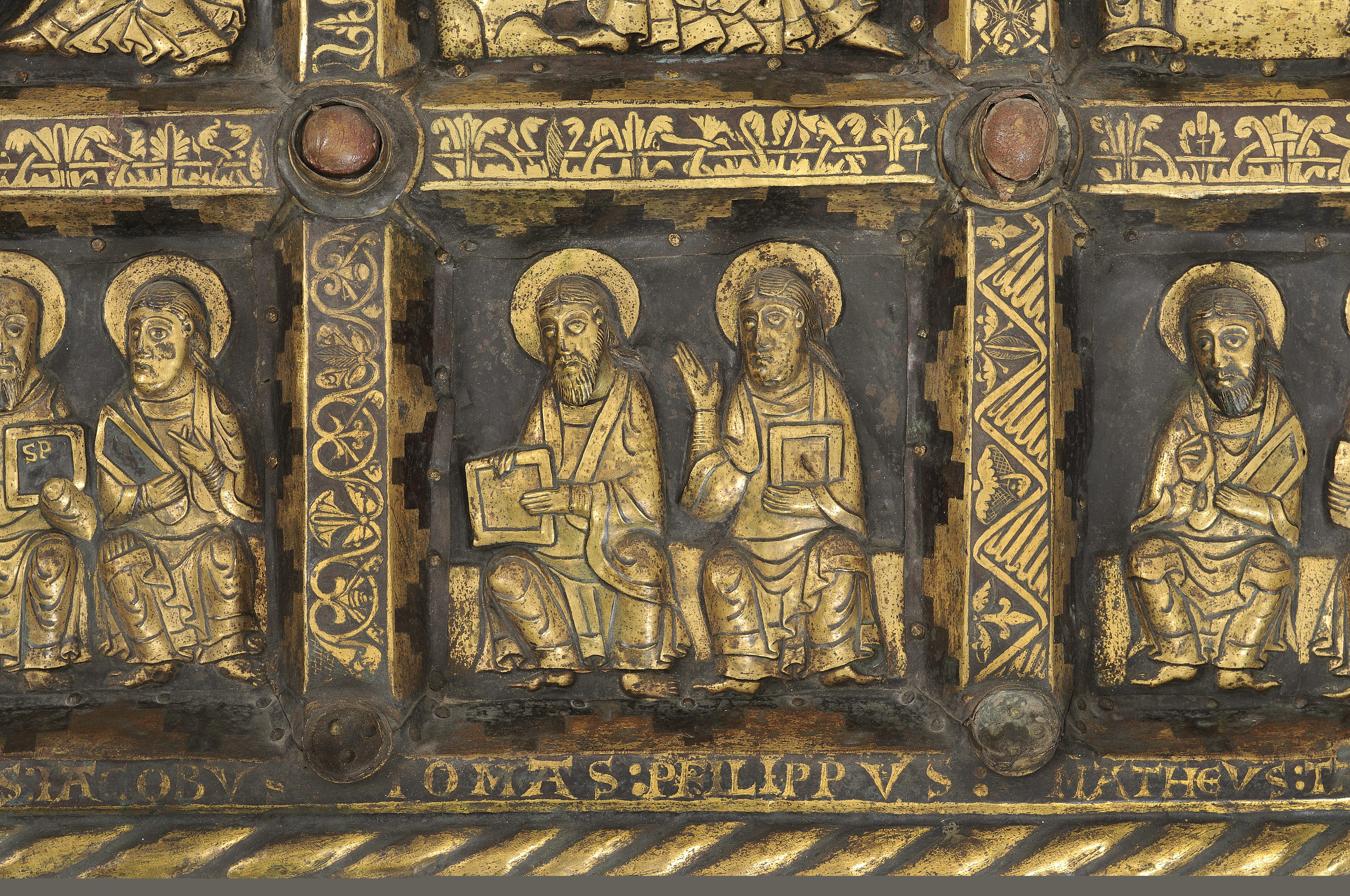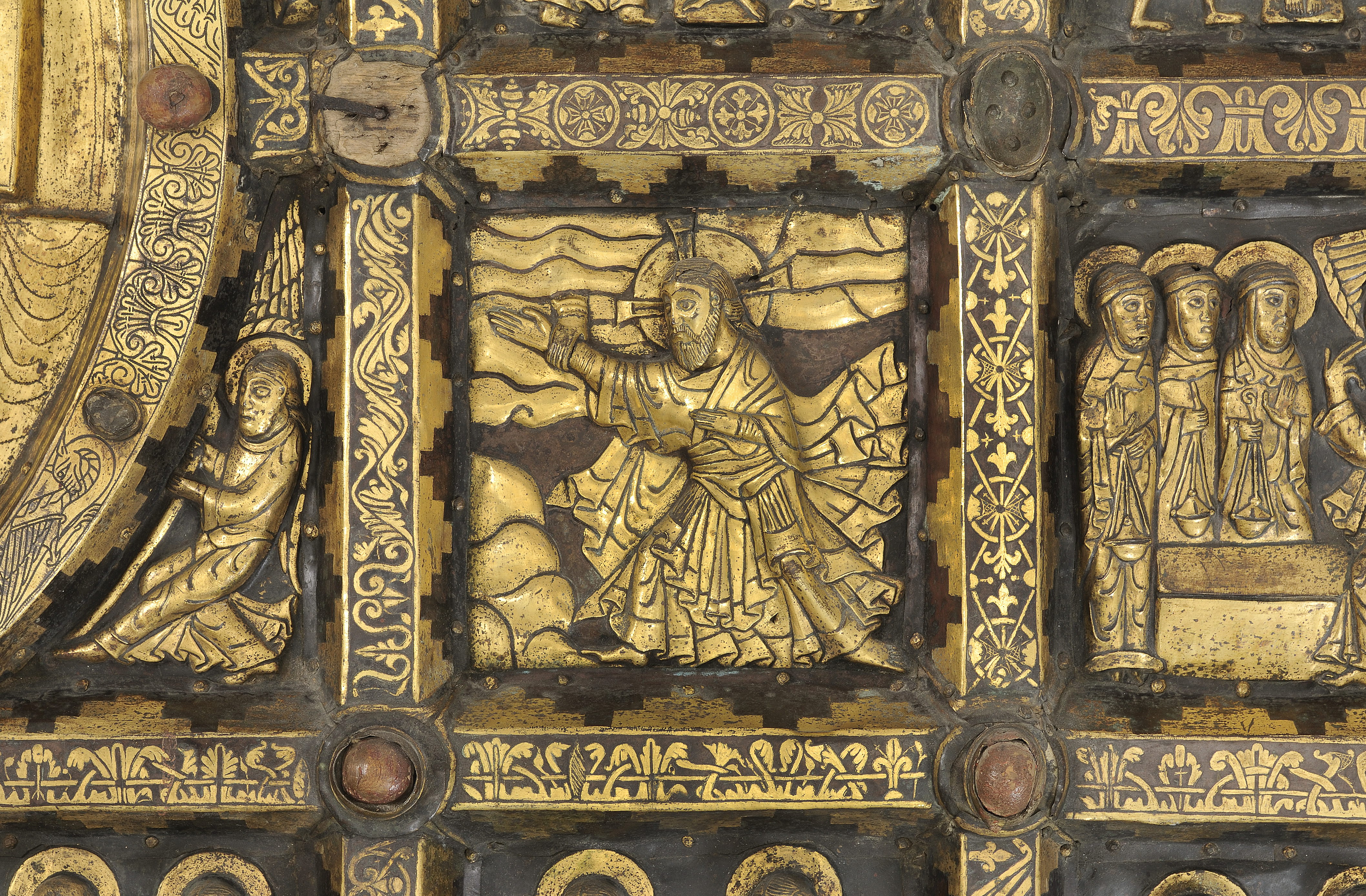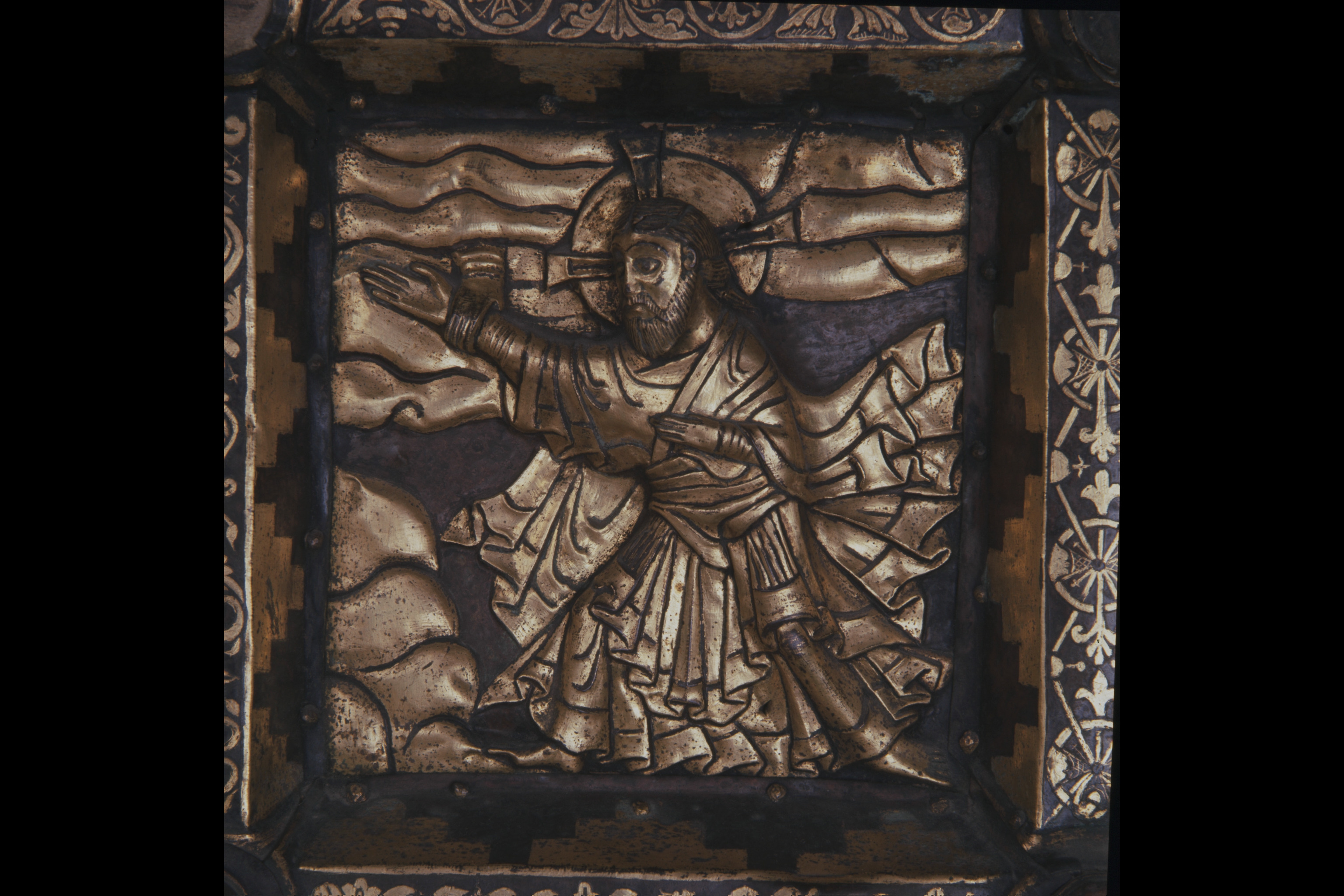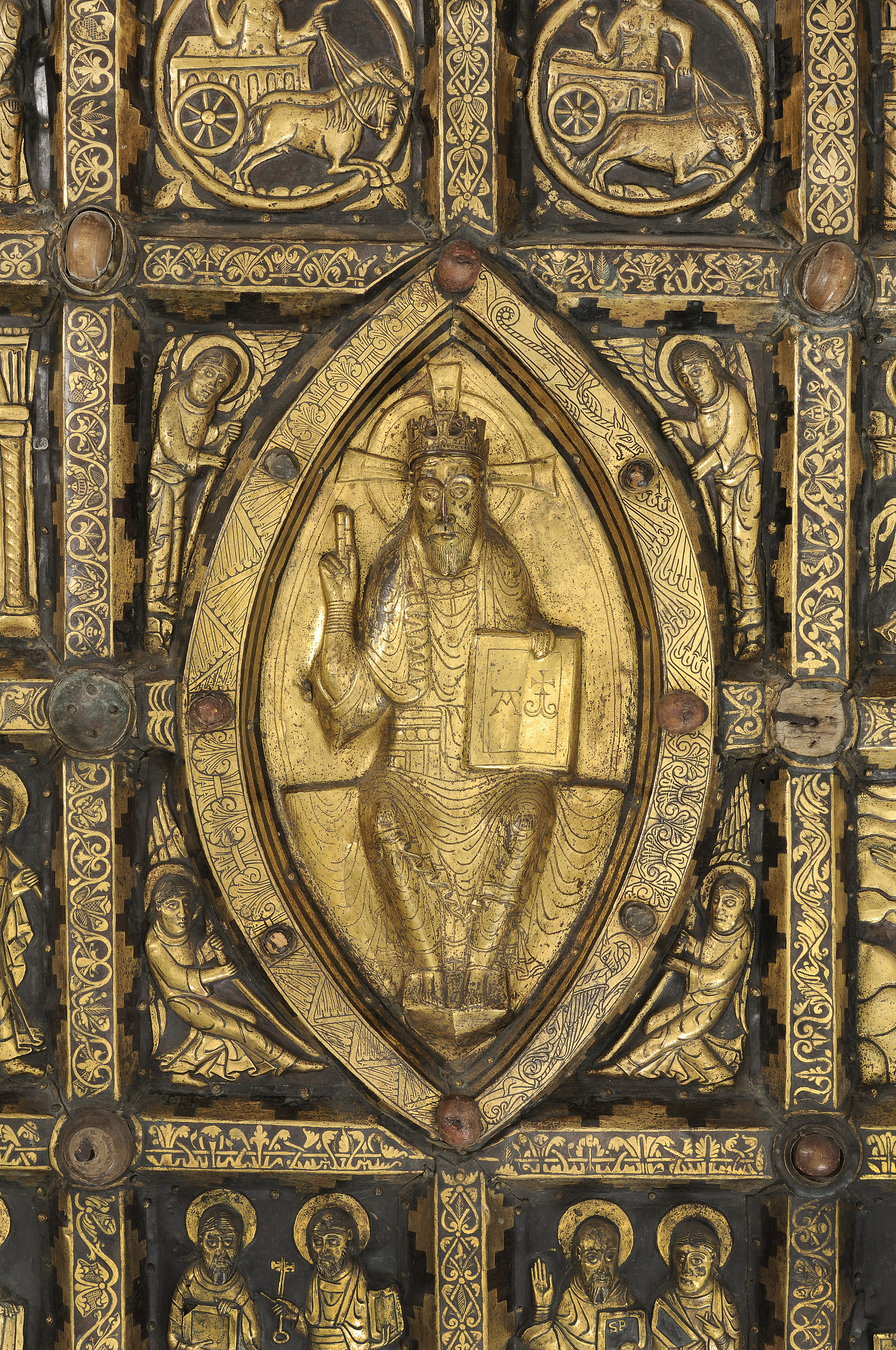Antemensale av driven, förgylld koppar på träkärna samt tillhörande krucifix och superfrontale i samma teknik.
