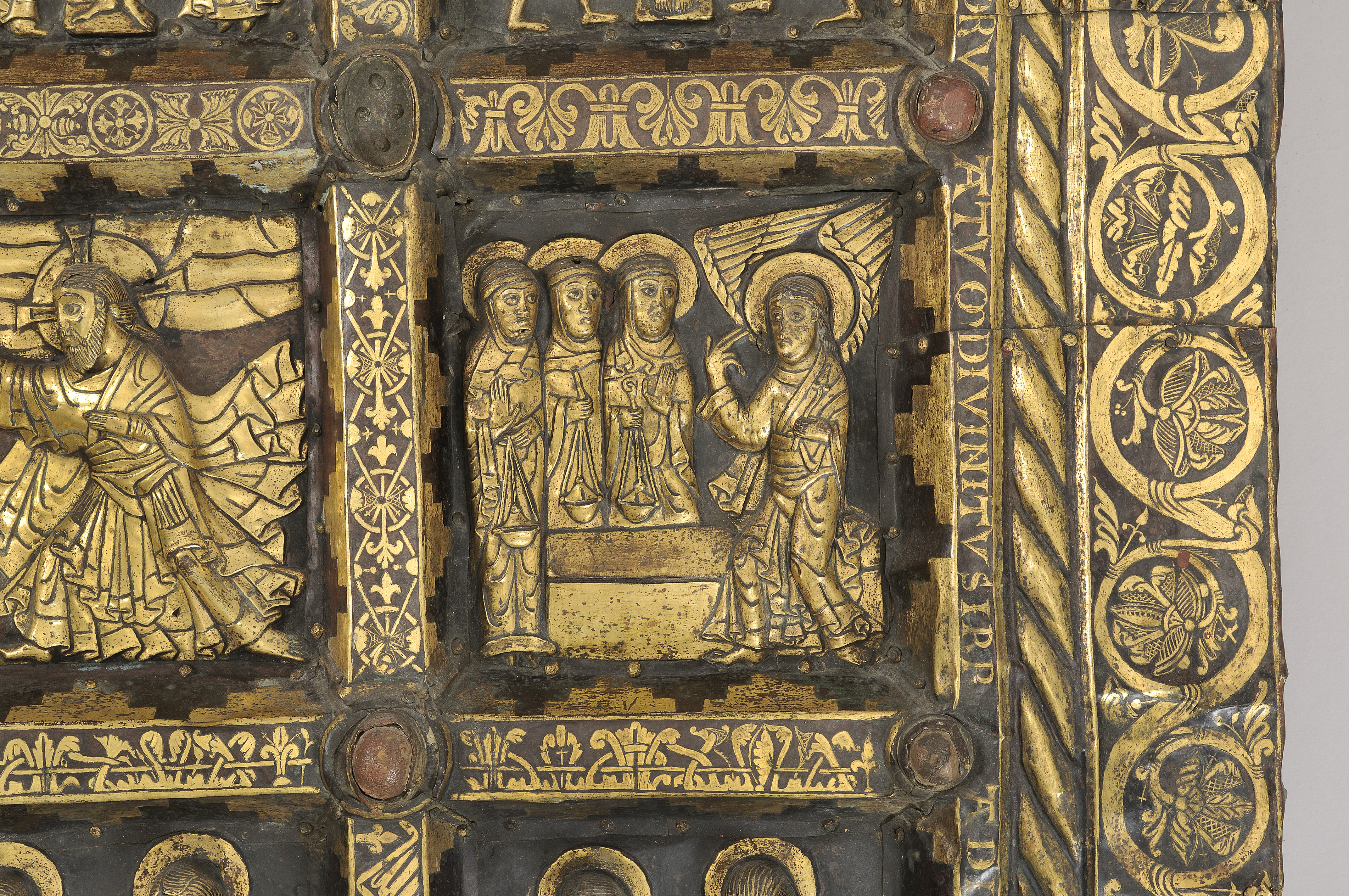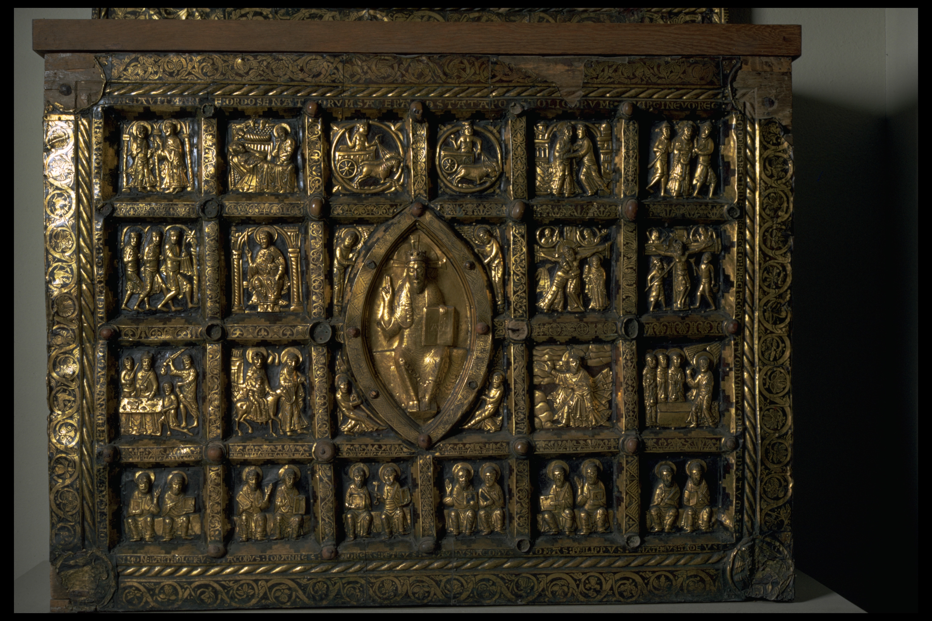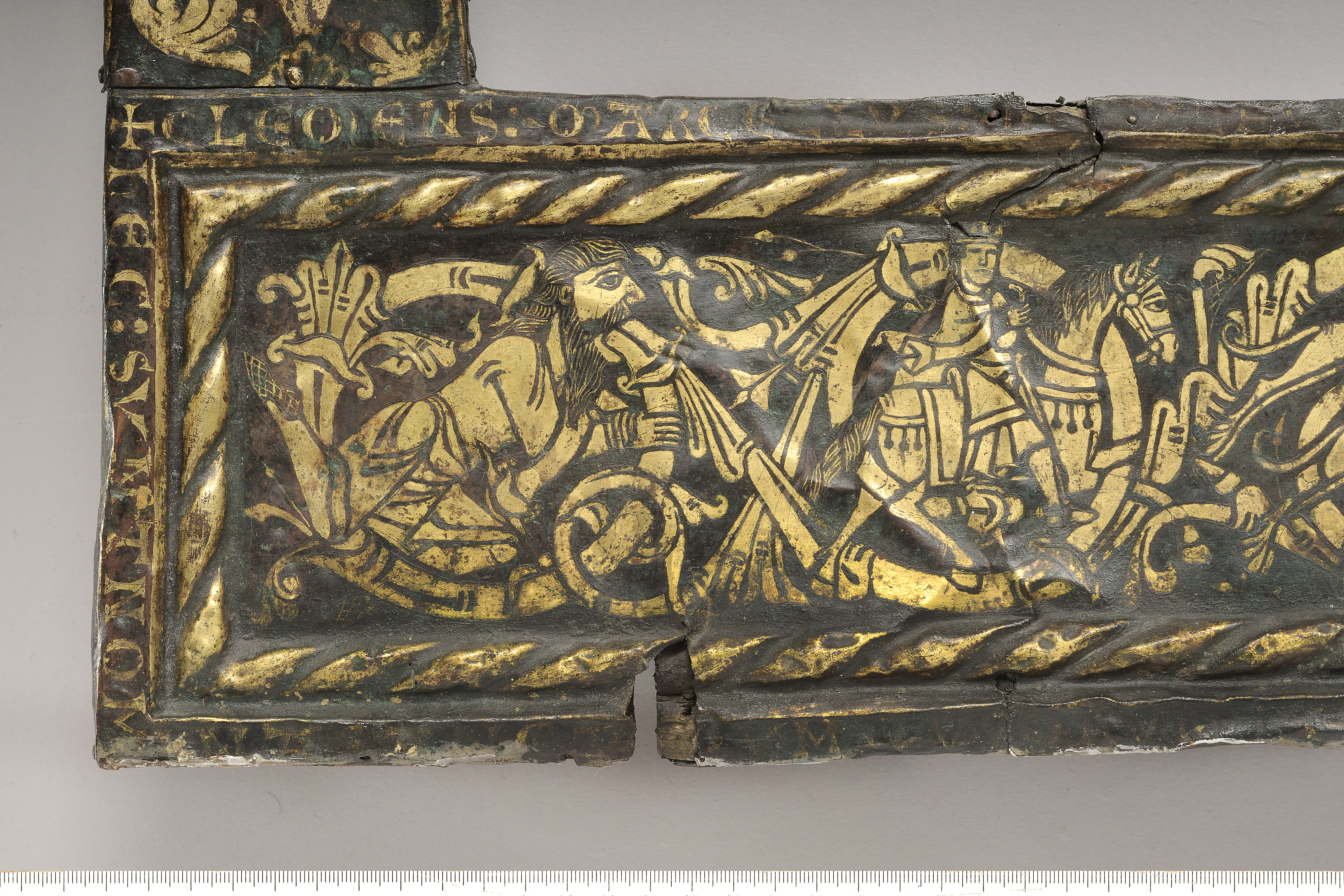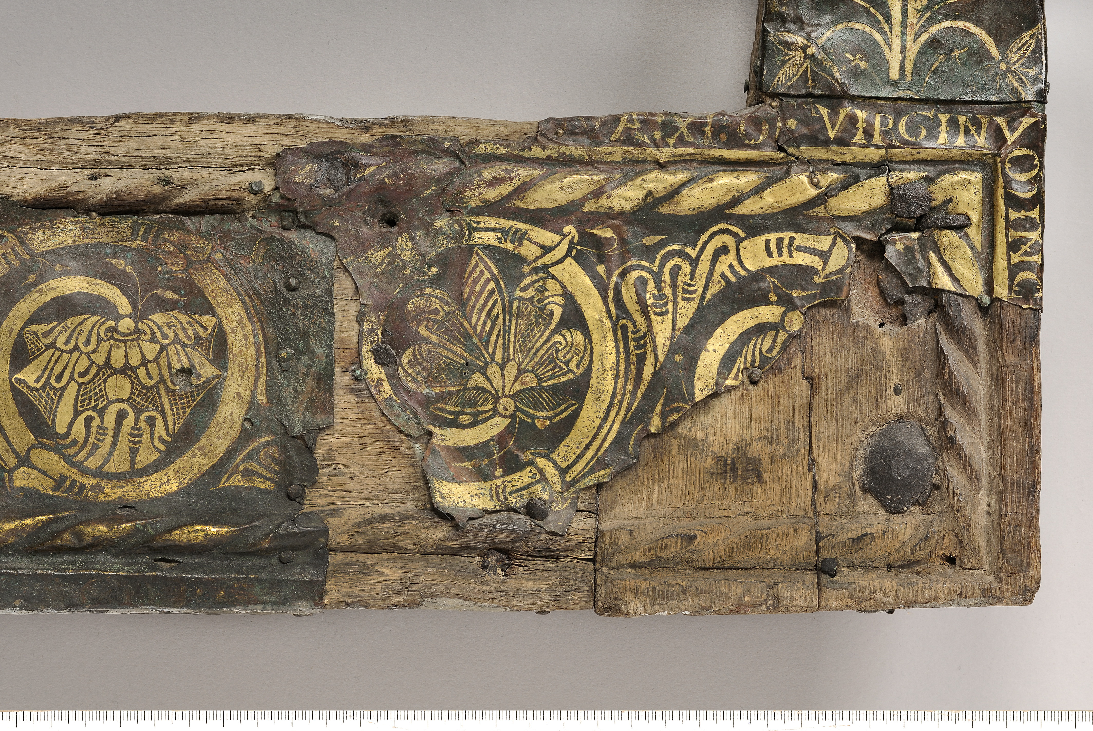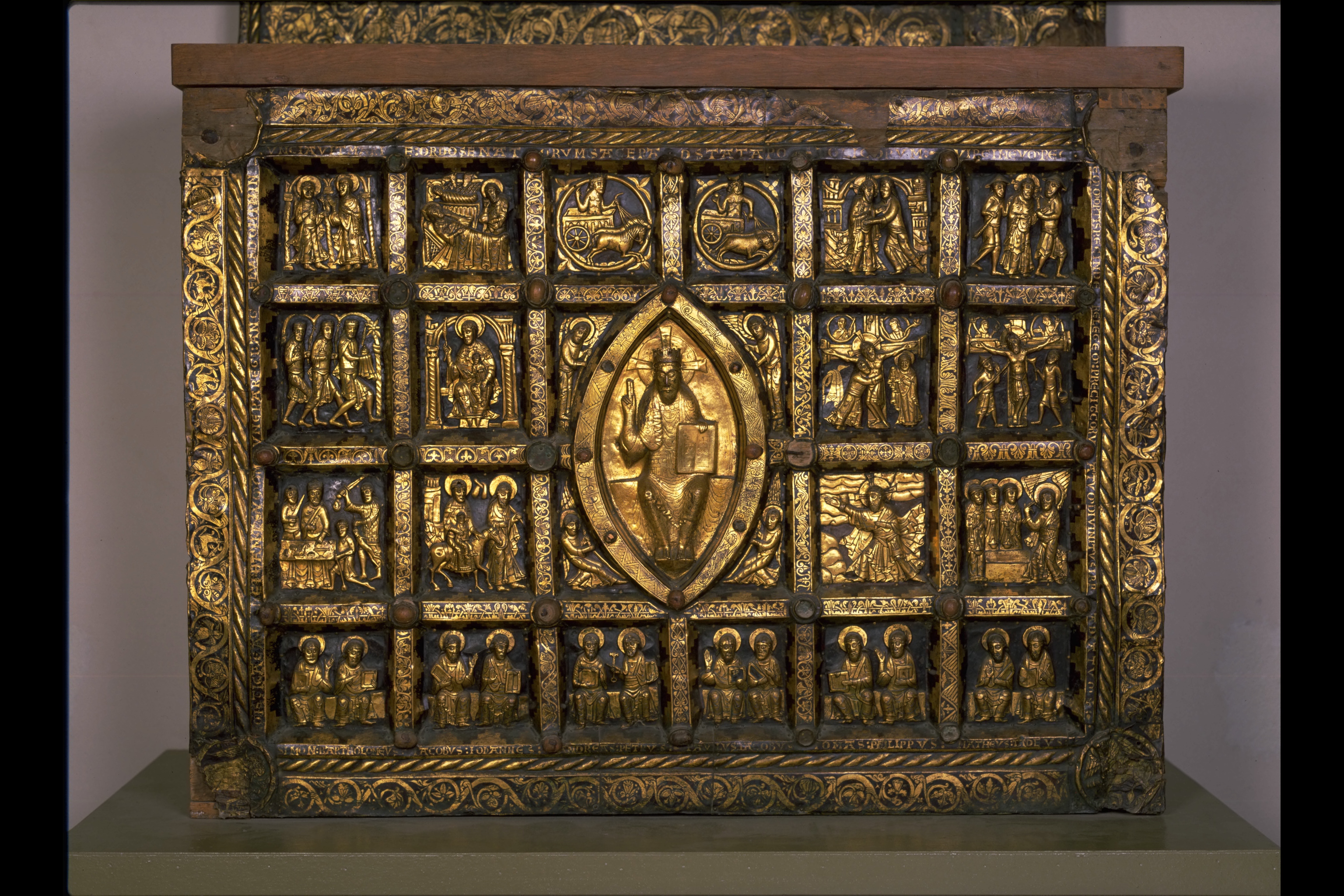 Antemensale av driven, förgylld koppar på träkärna samt tillhörande krucifix och superfrontale i samma teknik.