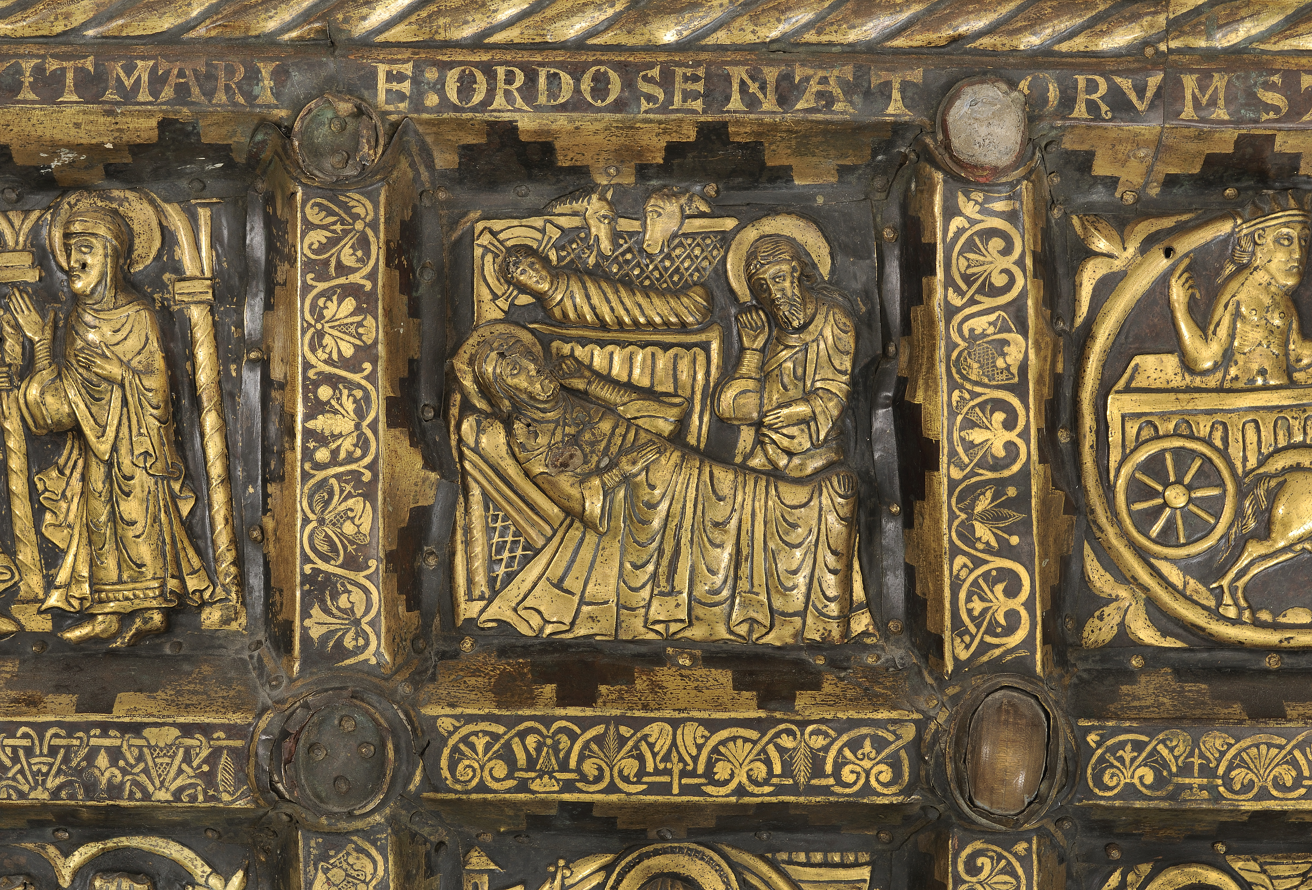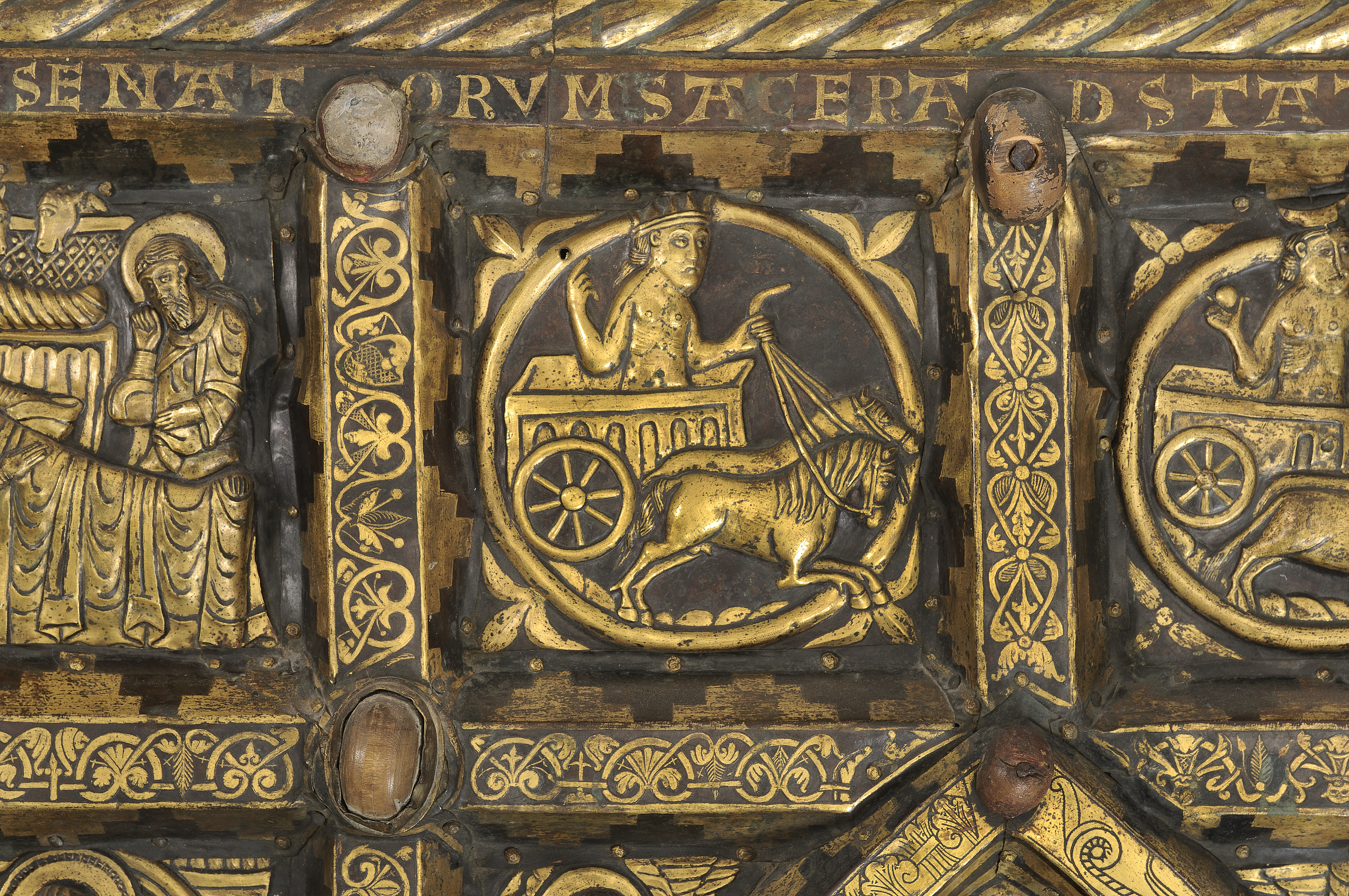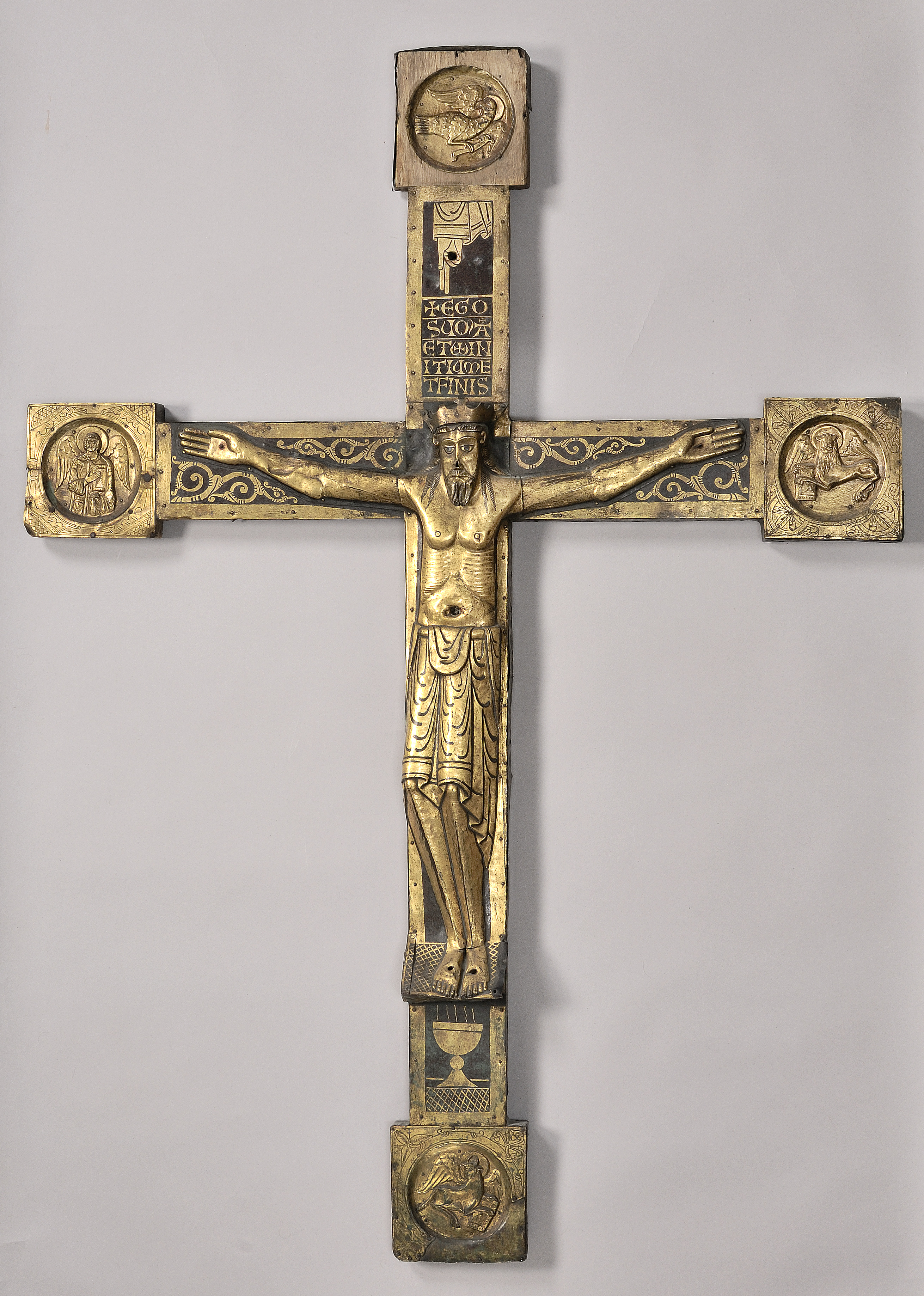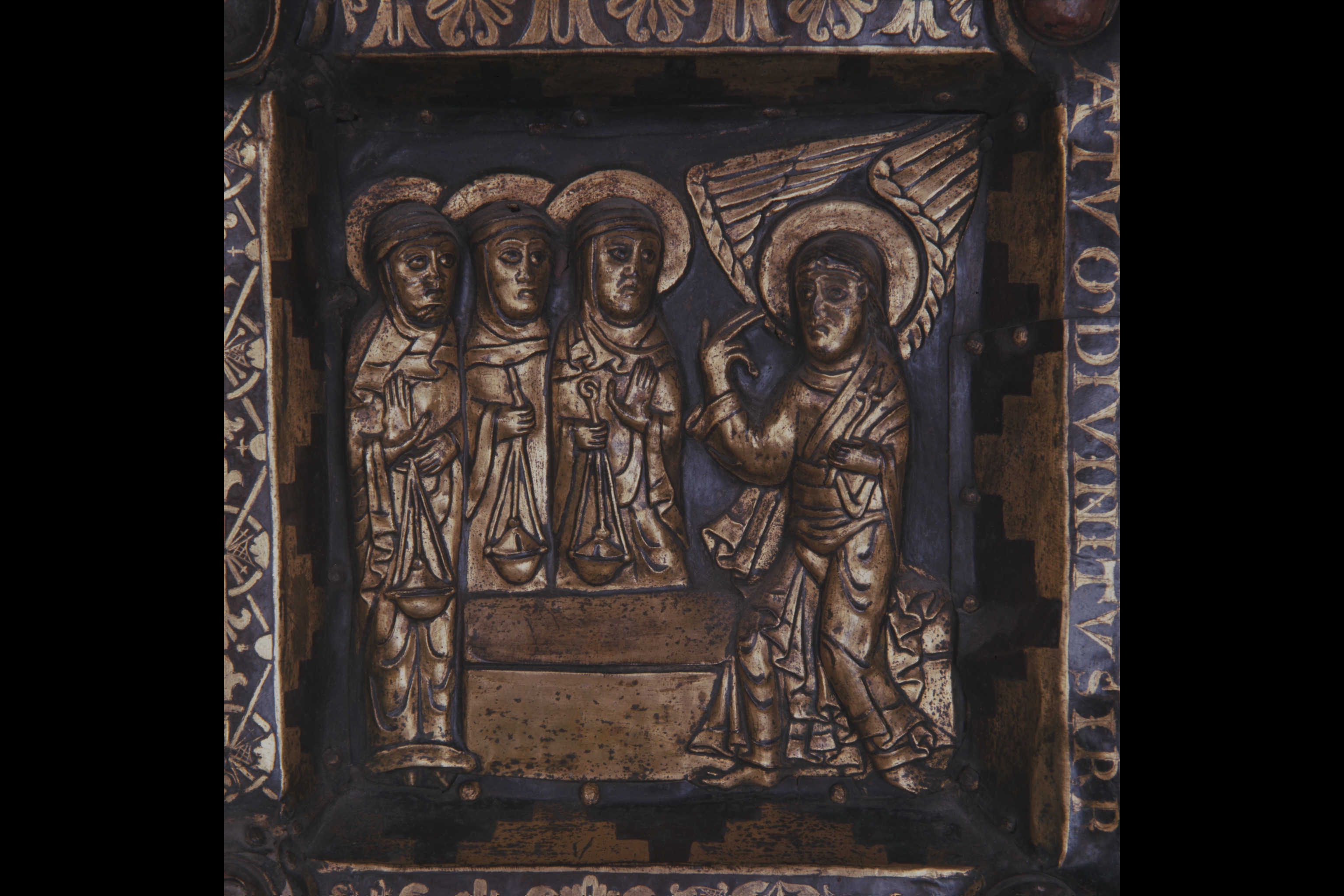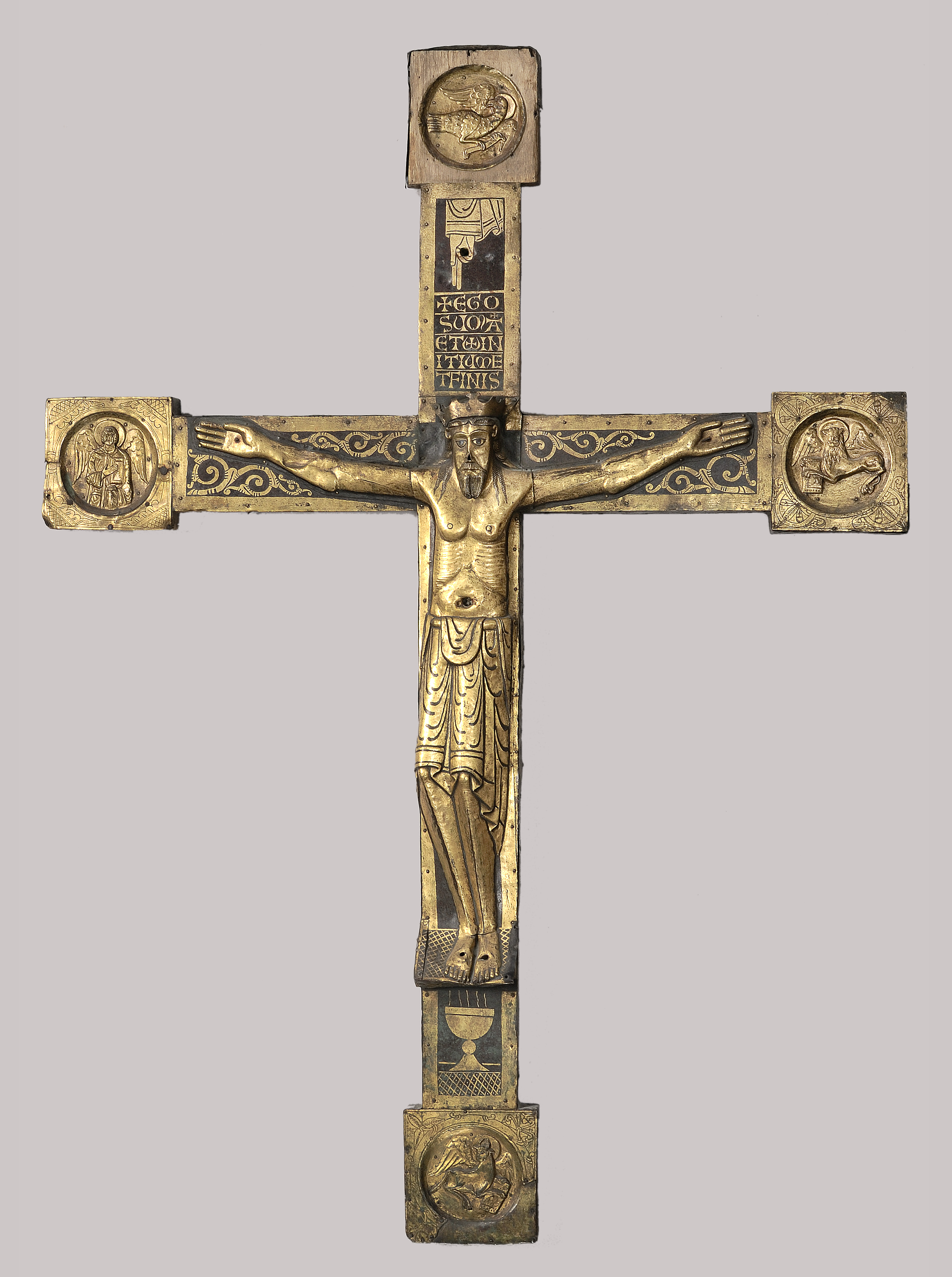 Antemensale av driven, förgylld koppar på träkärna samt tillhörande krucifix och superfrontale i samma teknik.