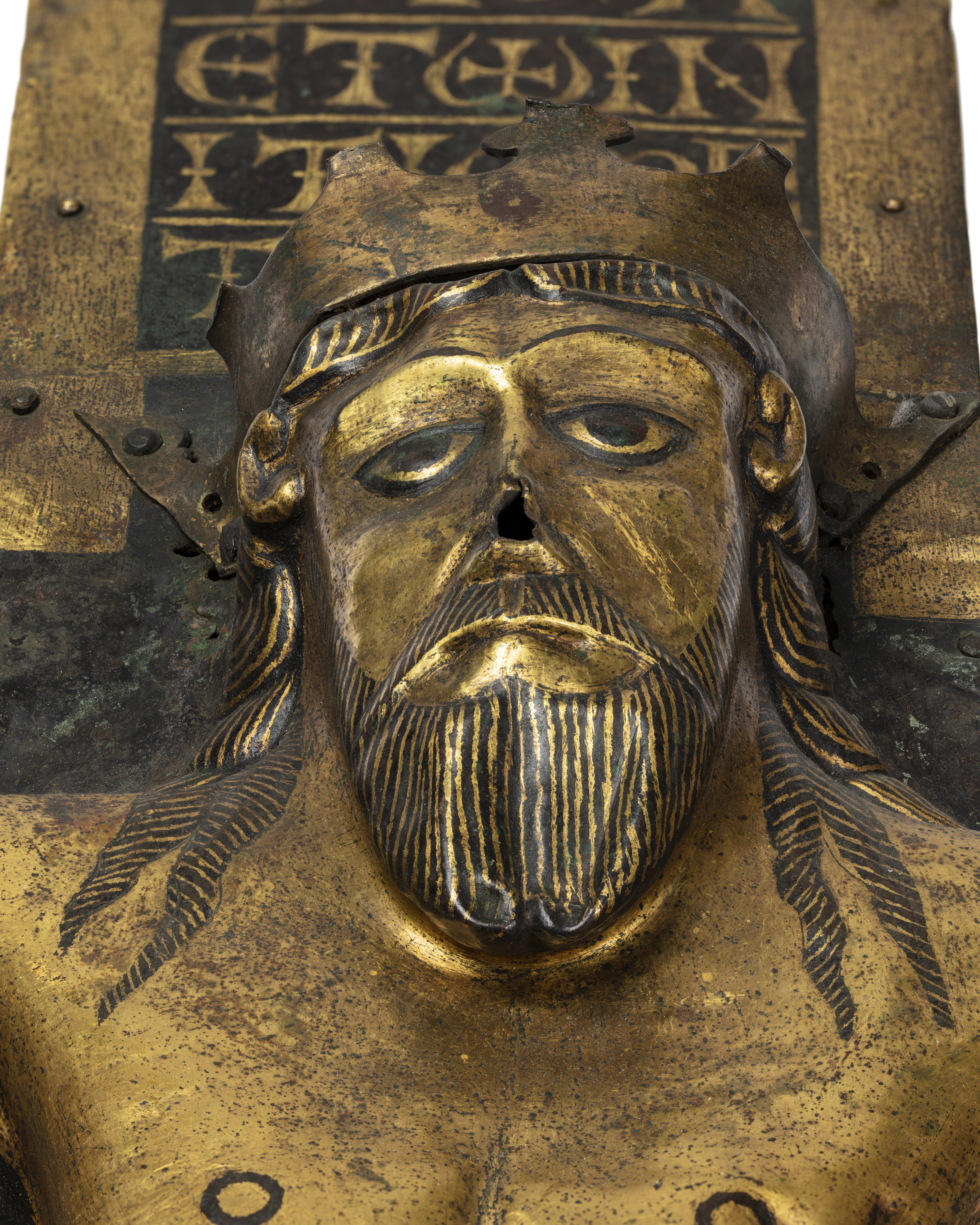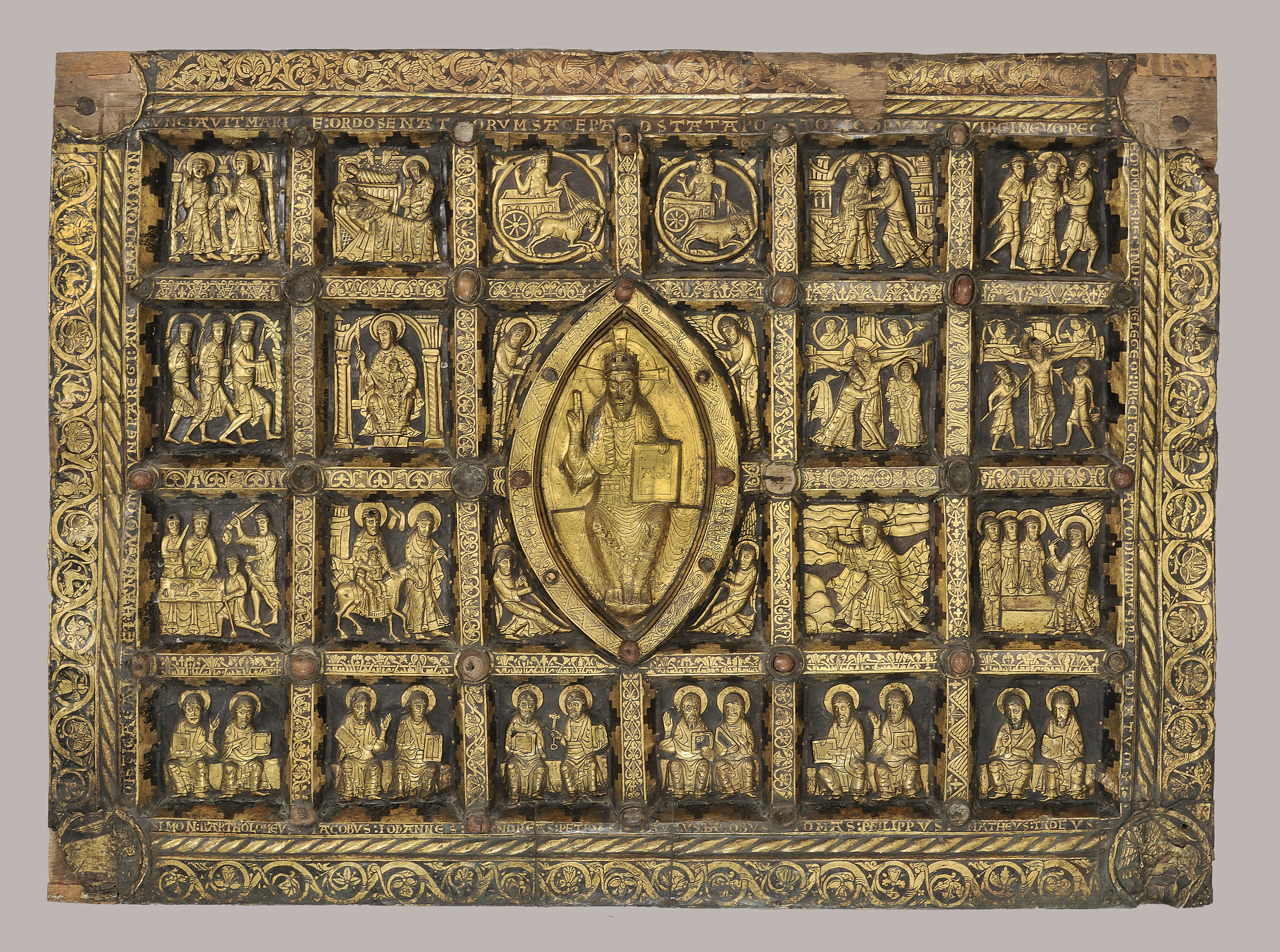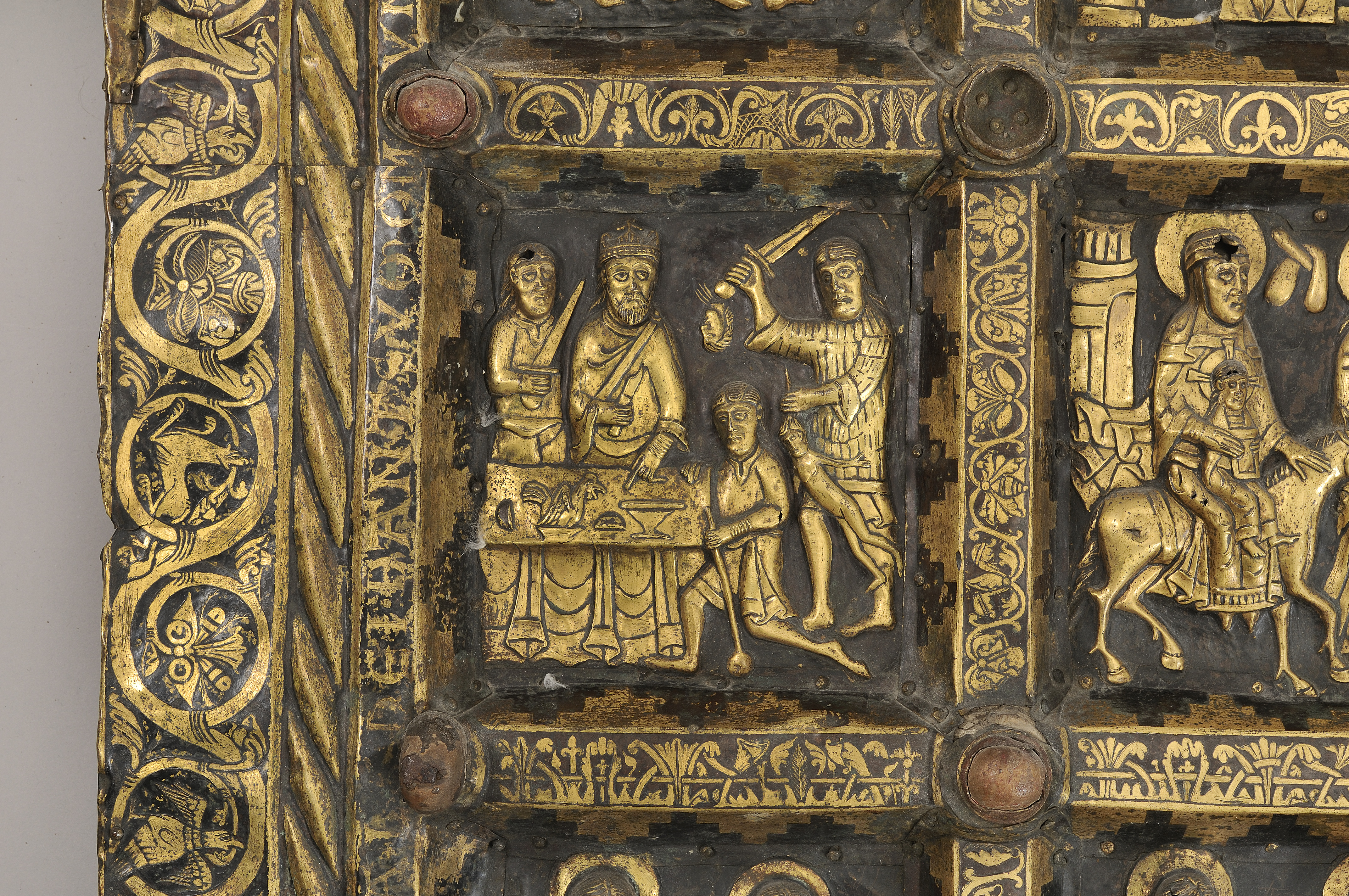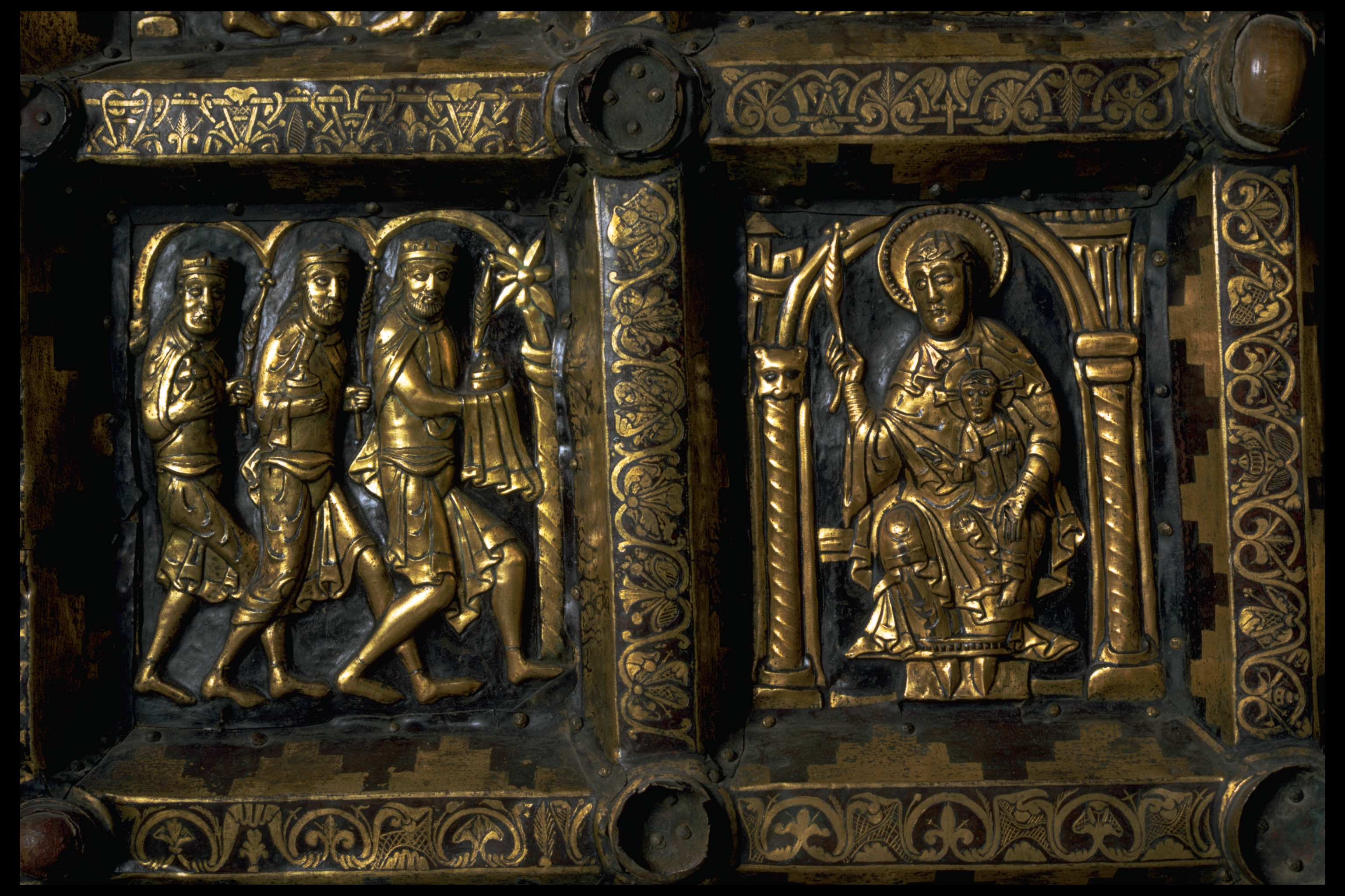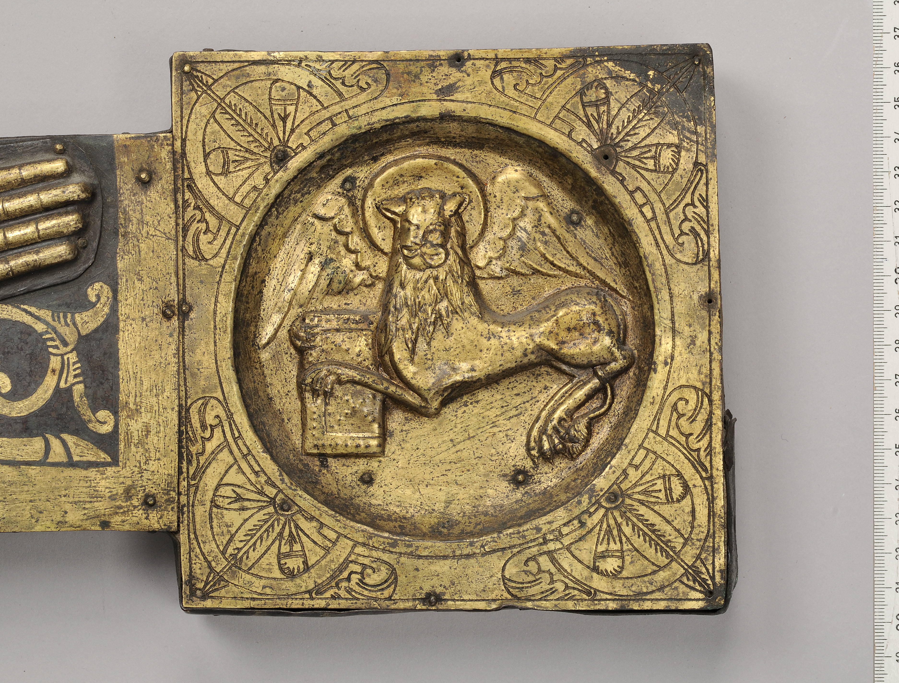 Antemensale av driven, förgylld koppar på träkärna samt tillhörande krucifix och superfrontale i samma teknik.